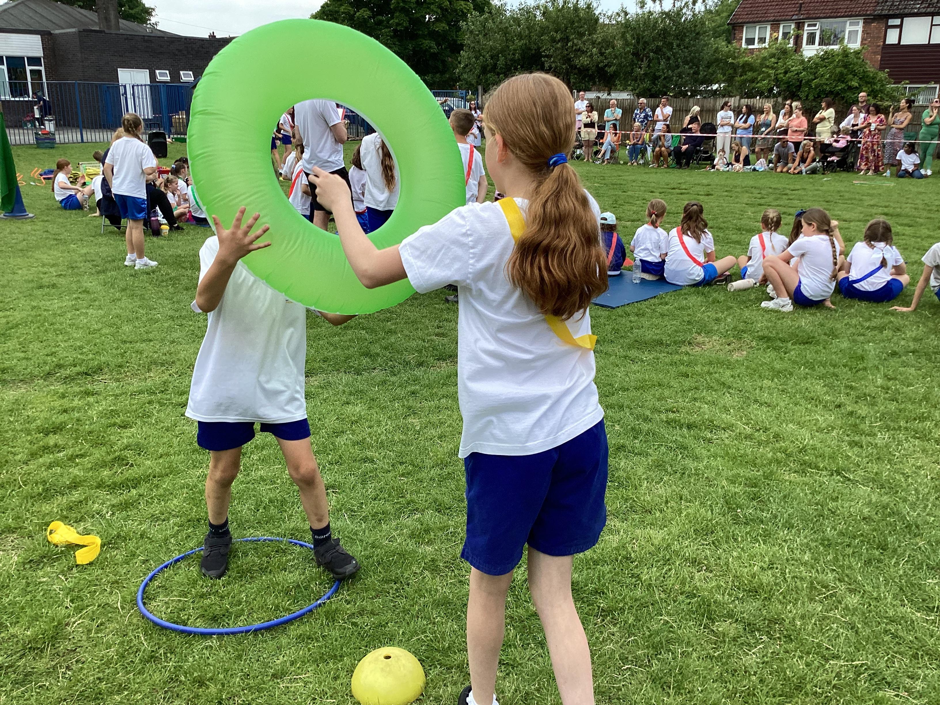 In P.E. we played lots of team games that involved throwing and catching and races.