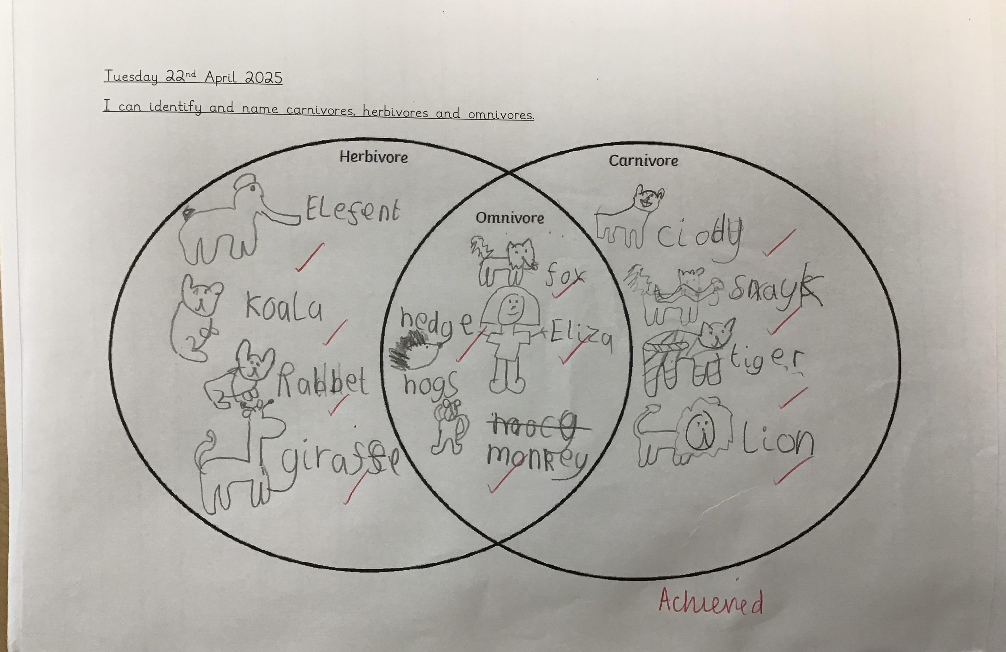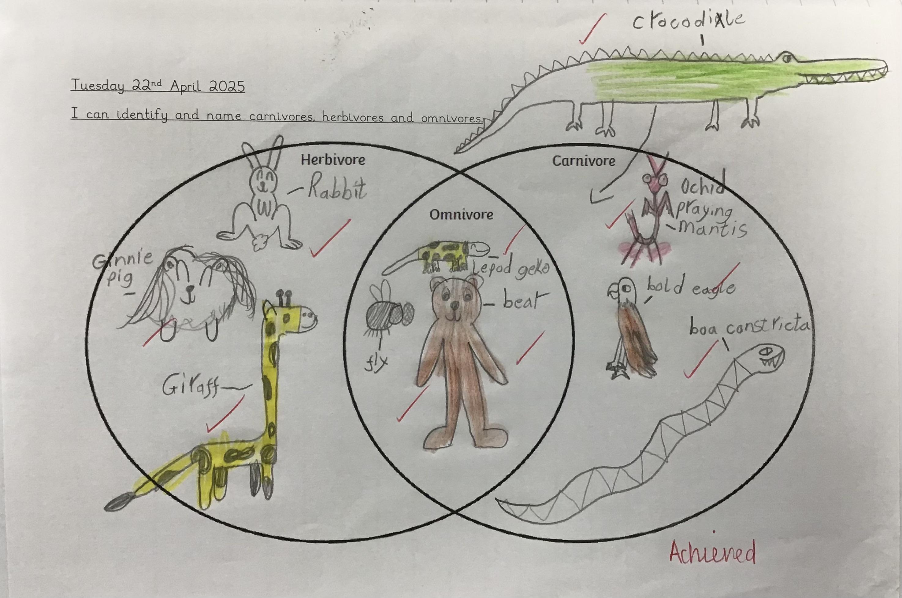 In our science this week we carried on our unit on Living Things and Habitats by investigating carnivores, herbivores and omnivores. We used a venn diagram to sort out the animals we found out about.