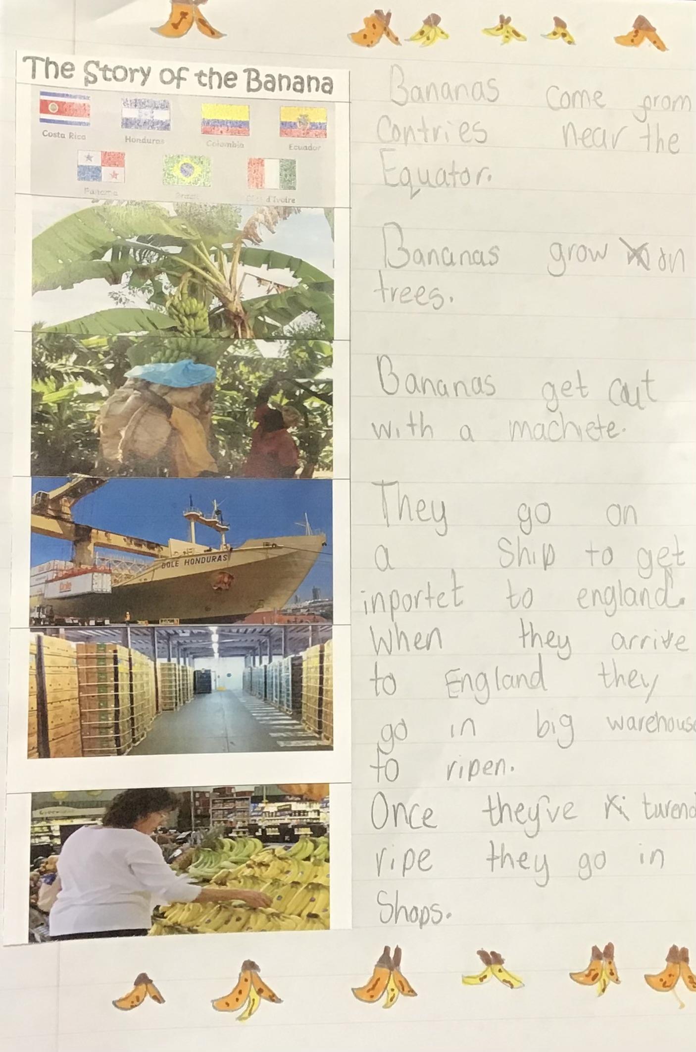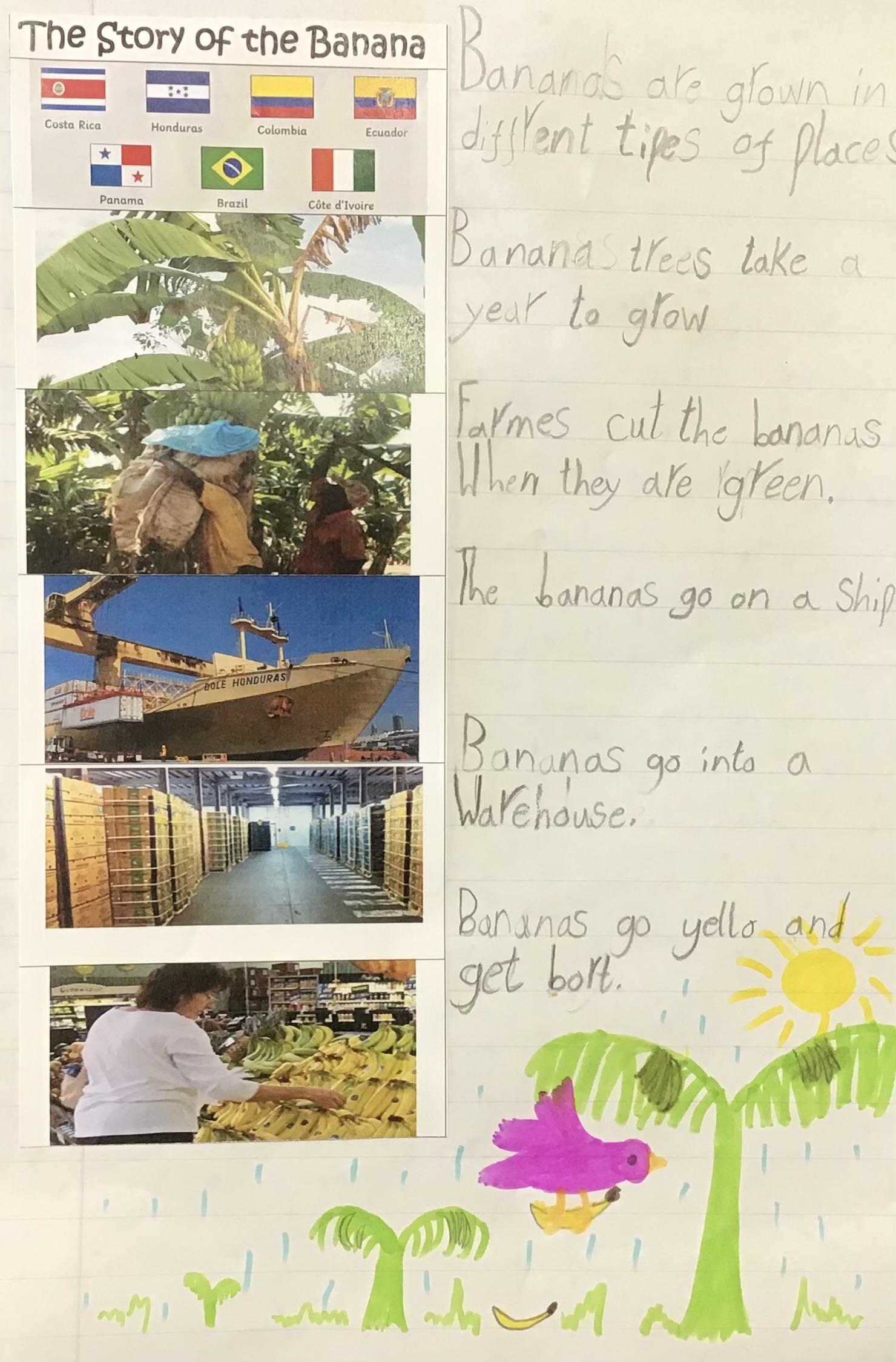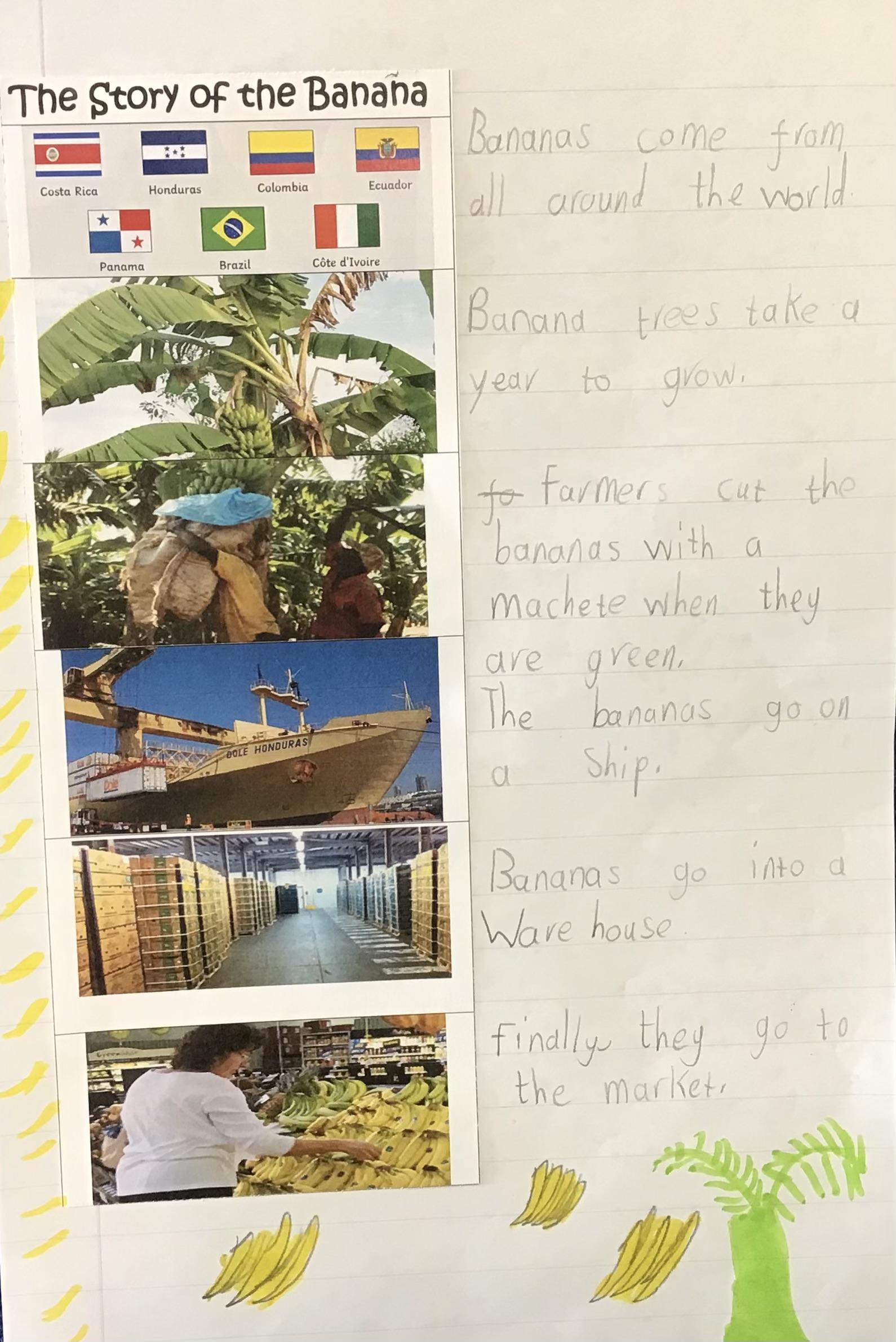 In our English we have been researching various animals that might be found on Grandad's Island all ready for writing our own non=chronological report next week. We also wrote a fact file on the story of how our bananas grow and travel to our shops: ready for our banana and choc chip muffins!