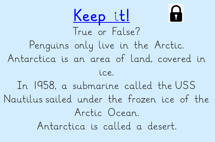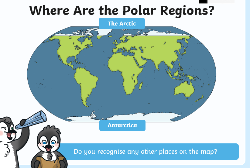 In our geography this week we learned about the polar regions of the Earth. Can your child tell you some similarities and differences between the two? Can they remember which animals live in which?