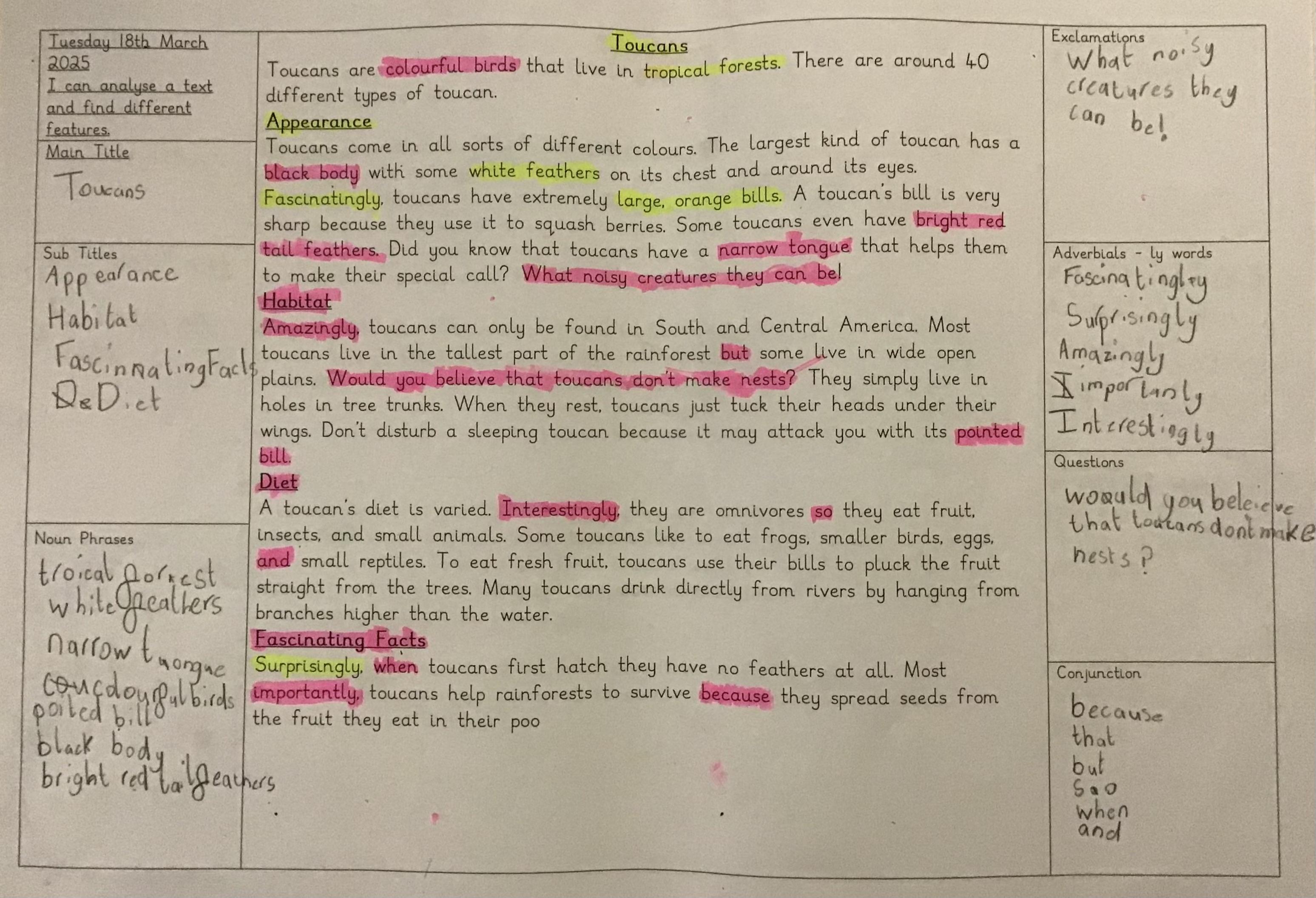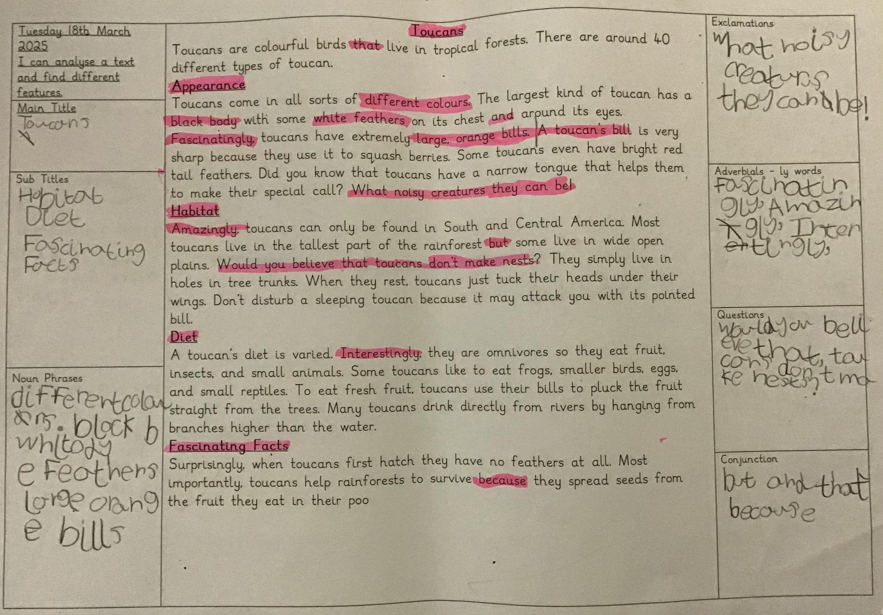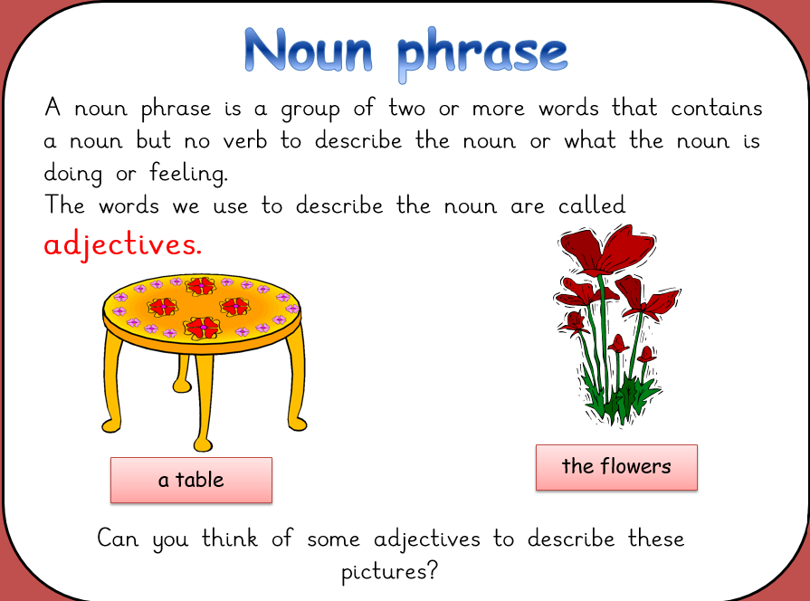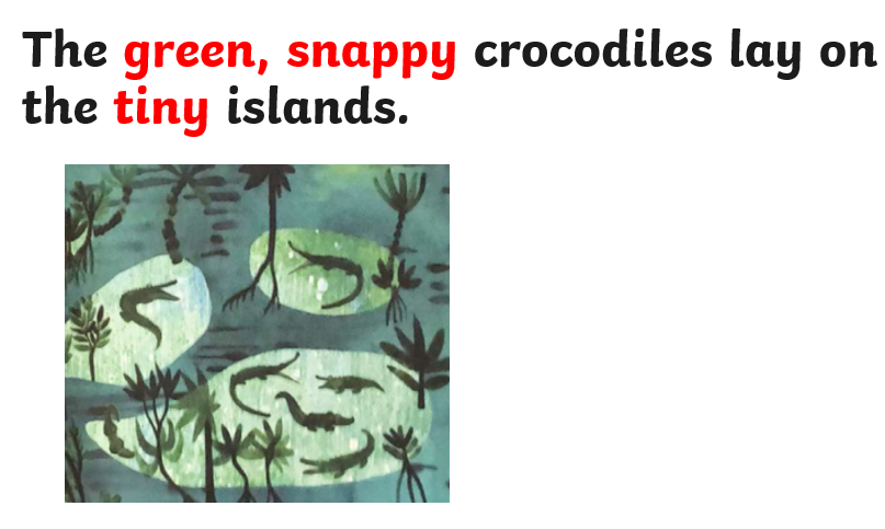 In English we have been re-reading our text A River and learned that if you put adjectives and nouns together you make 'noun phrases'. We read our text to see if we could find any noun phrases to go on our working wall. Then we made our own noun phrases using one of the illustrations.