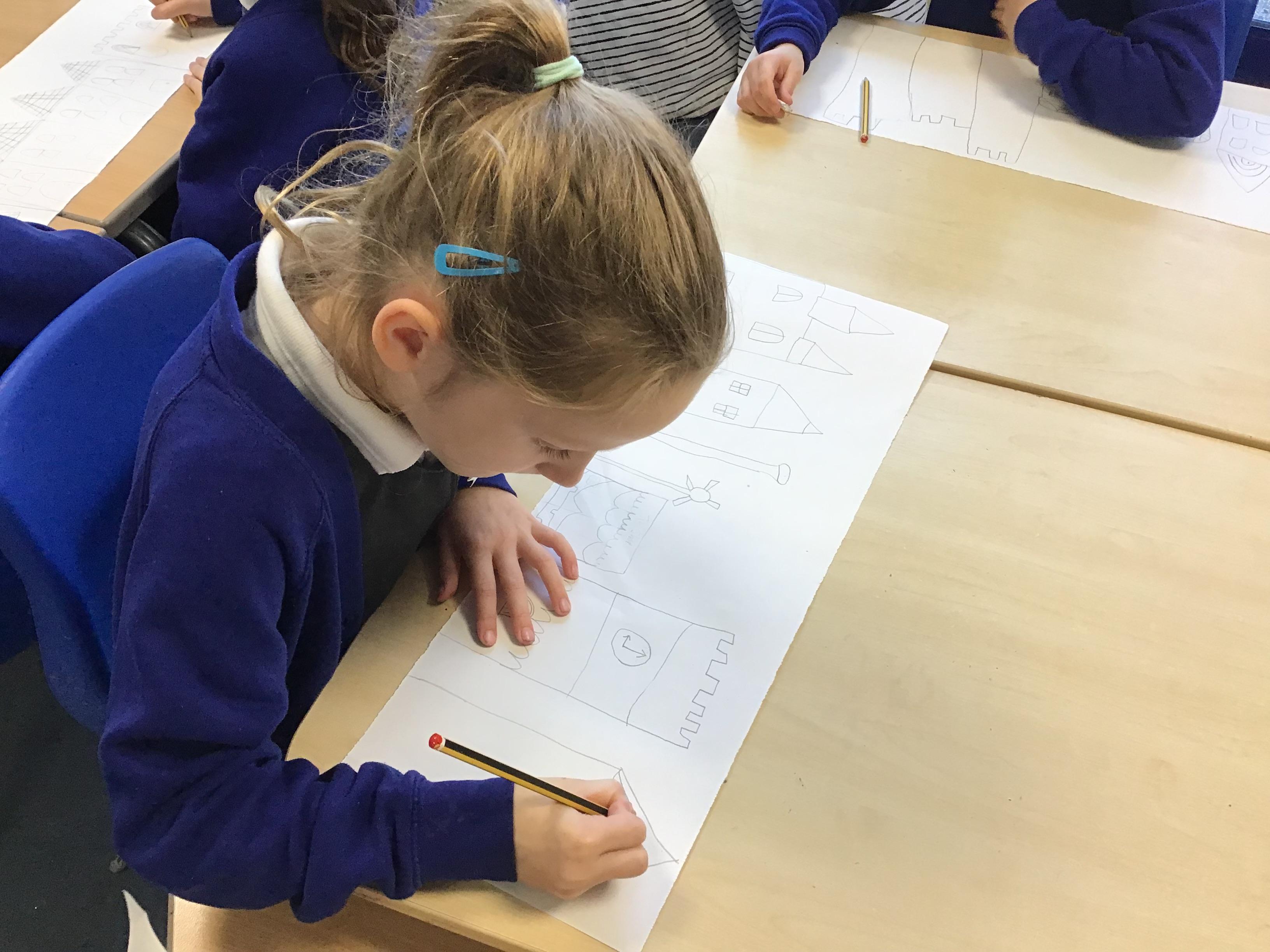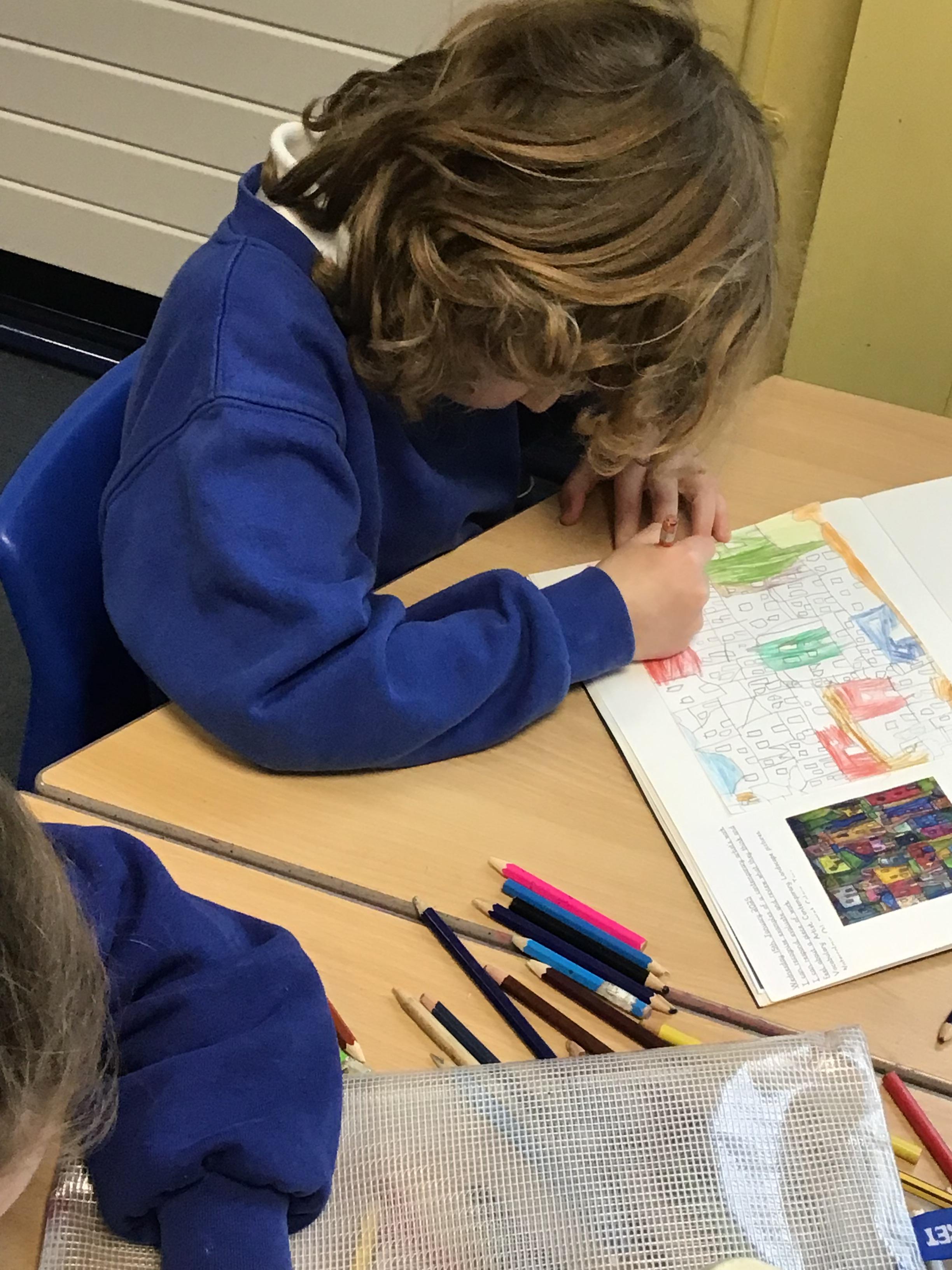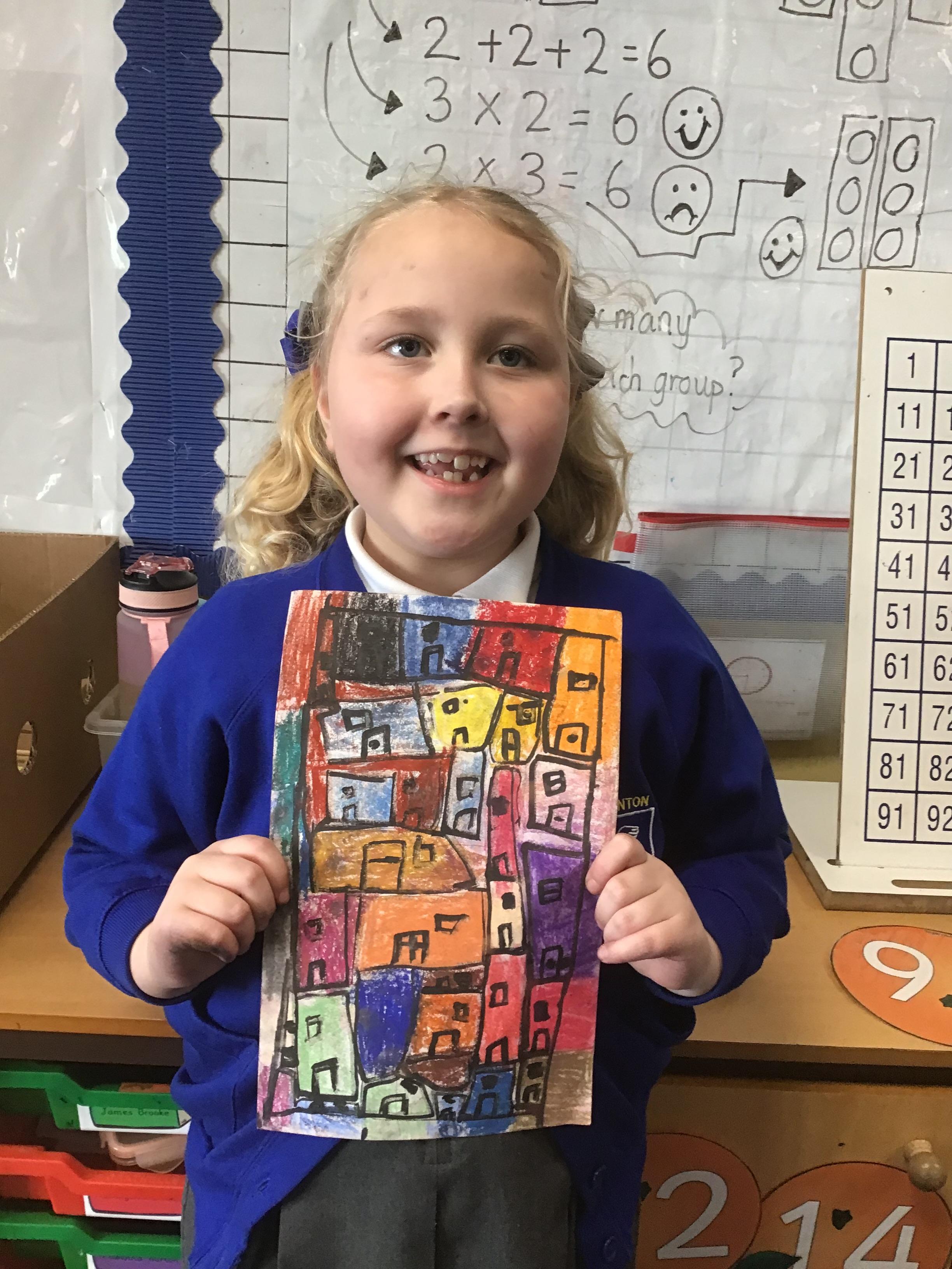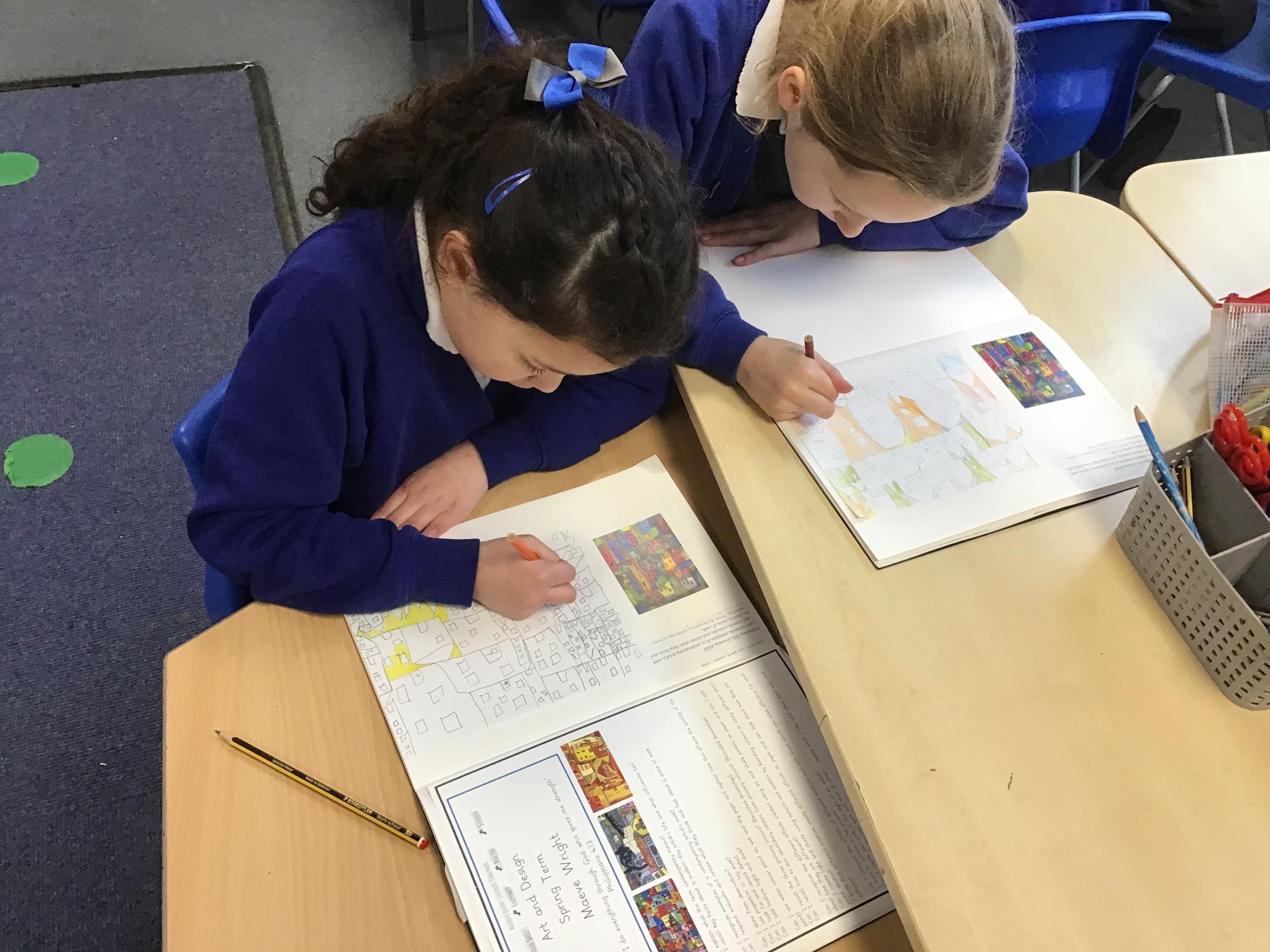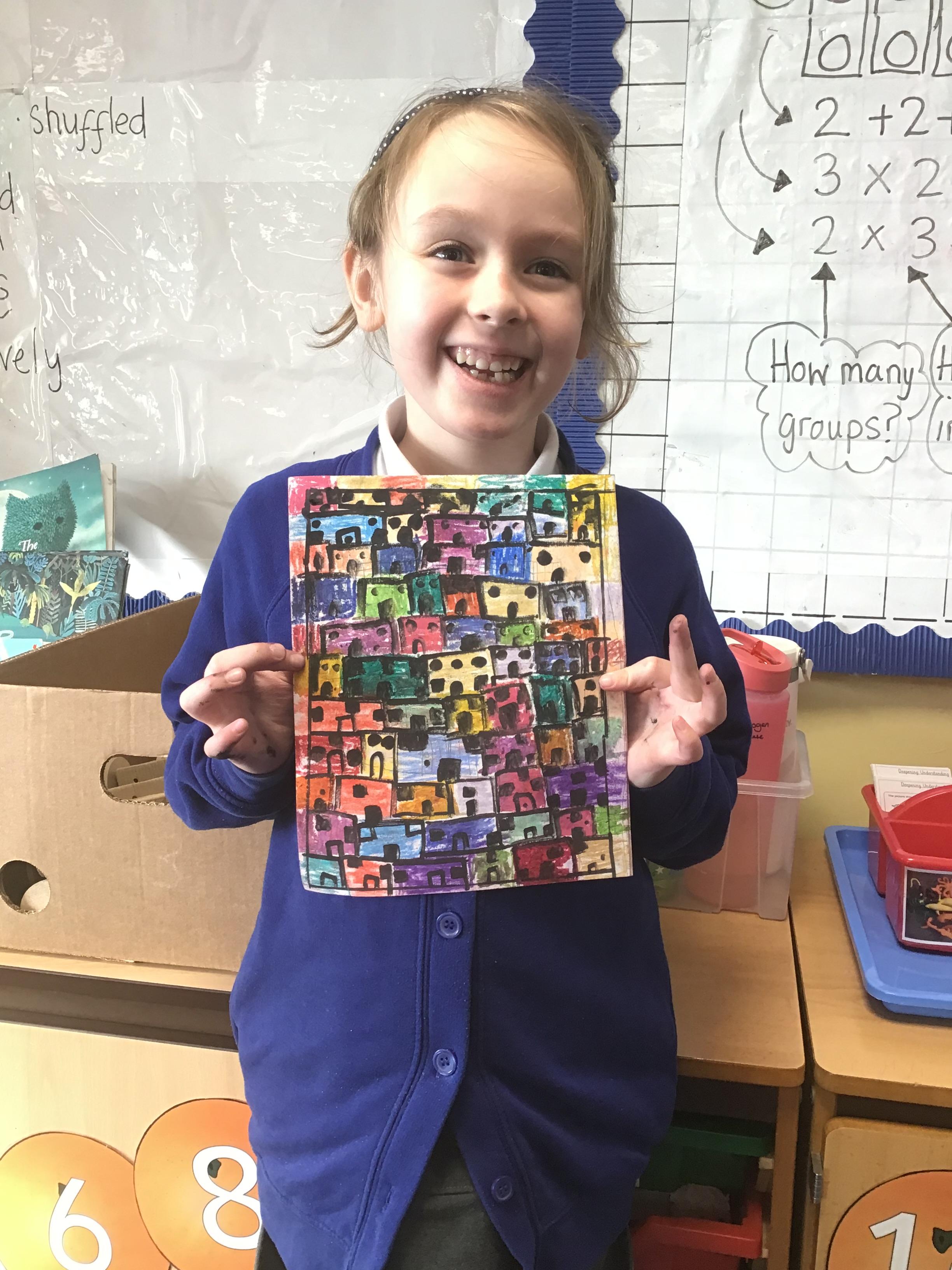 in preparation for our Spring art block on Maeve Wright. We explored colour mixing and thickness and thinness of paints and then looked at townscapes and buildings. We drew our own townscapes and thought carefully about different types of lines and how we can position items in our work to create depth and perspective.