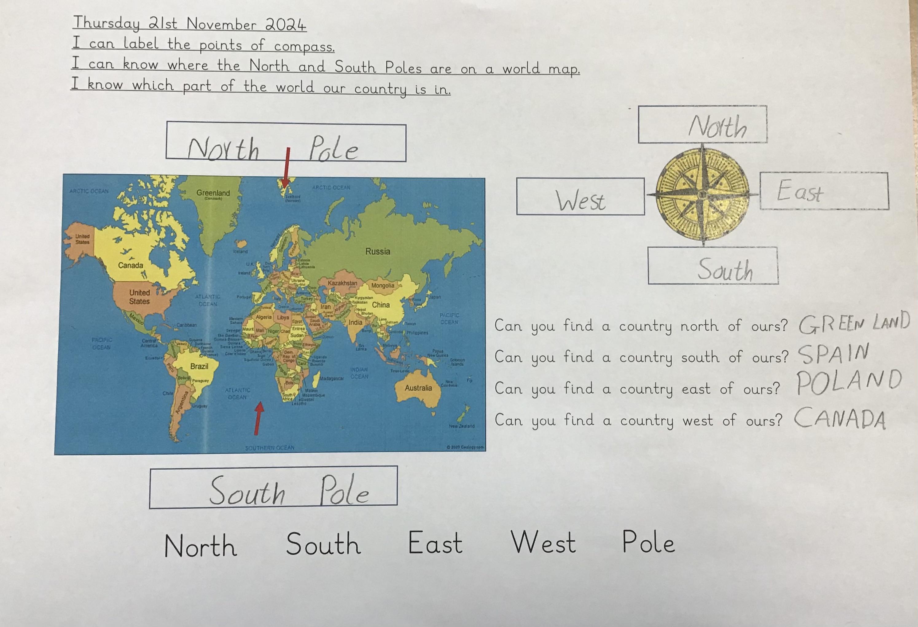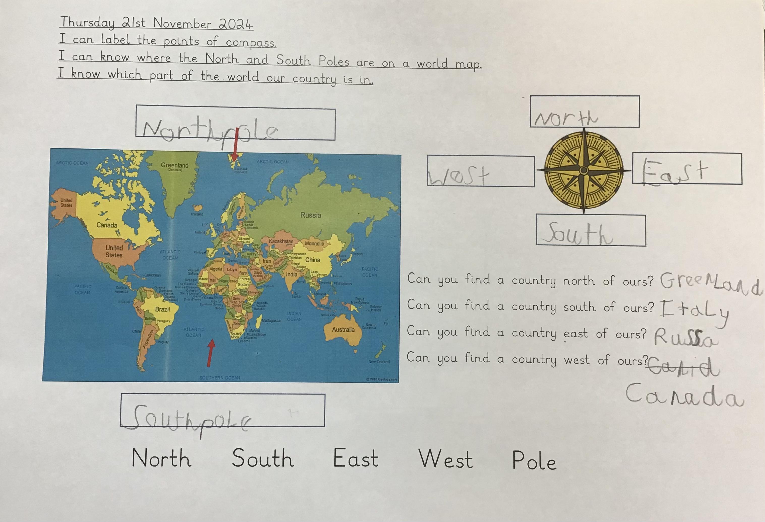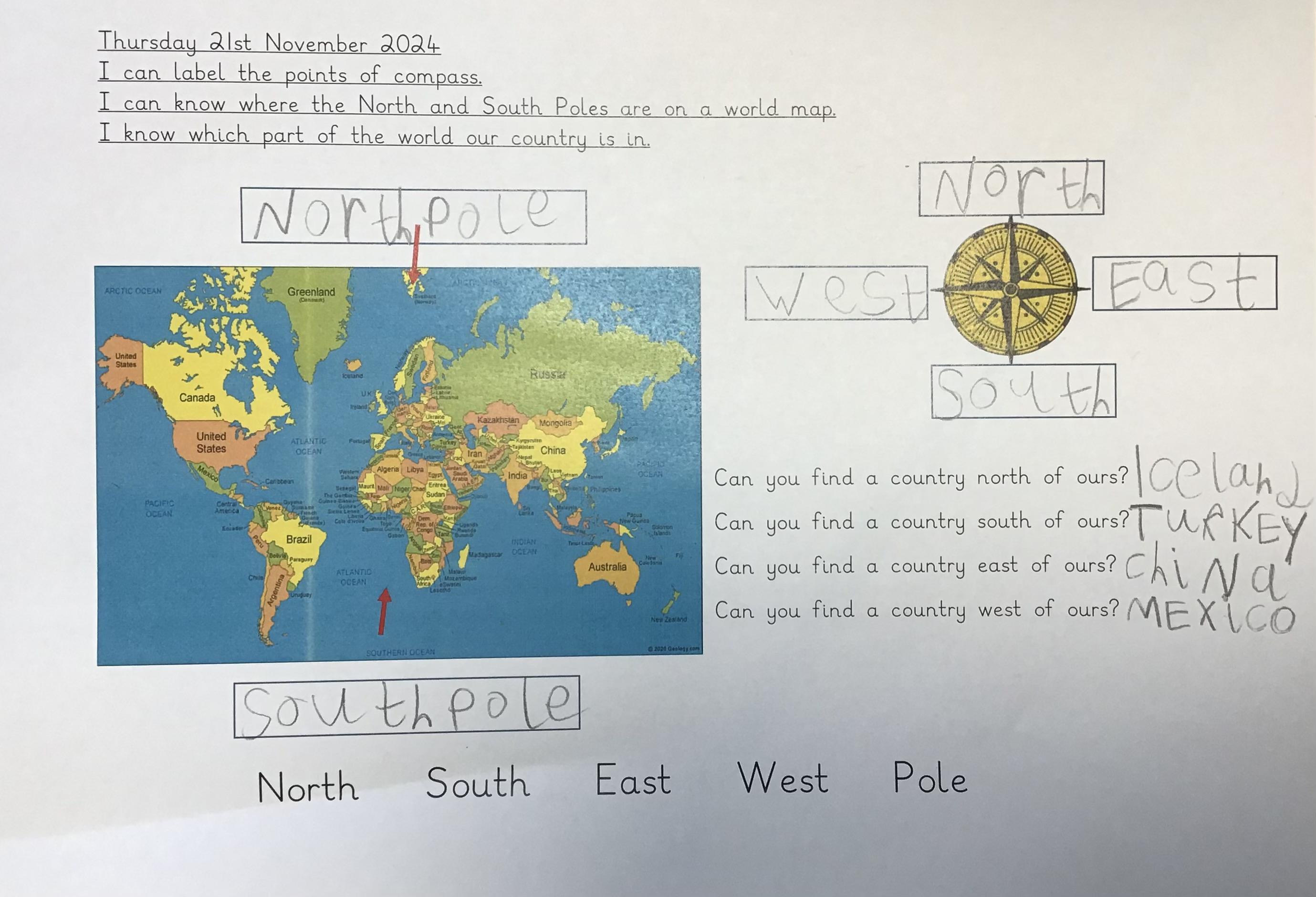 We started our geography unit this week by learning about compasses, what they are used for and the four different points. We then used an atlas to locate our own country and then a country to the North, South, East and West of us.