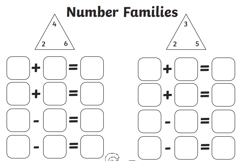 This week in our maths we have been starting to explore addition and subtraction and how they are related to one another. We have been exploring fact families. Here is an example of a fact family and a couple for you to have a go at together at home.