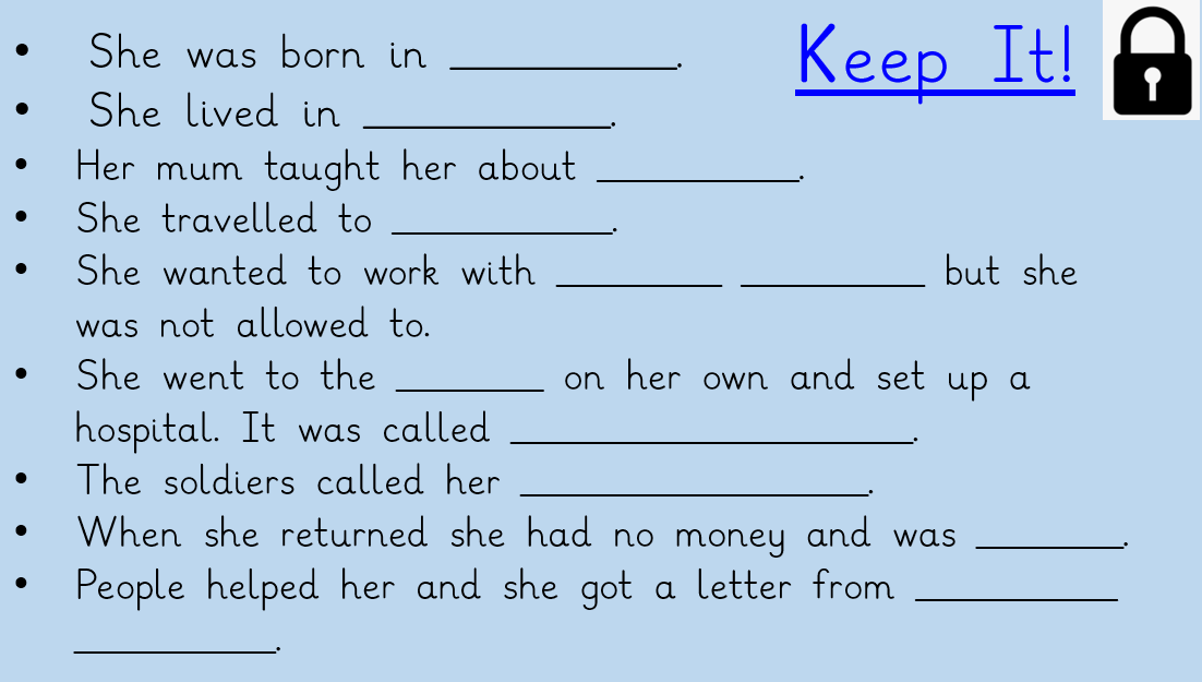 In our history this week, we learned about a very special lady who helped the soldiers in the Crimean War. She used all her own money to set up a hospital for the soldiers. Can your child tell you who this lady is and some facts about her life and the work she did?