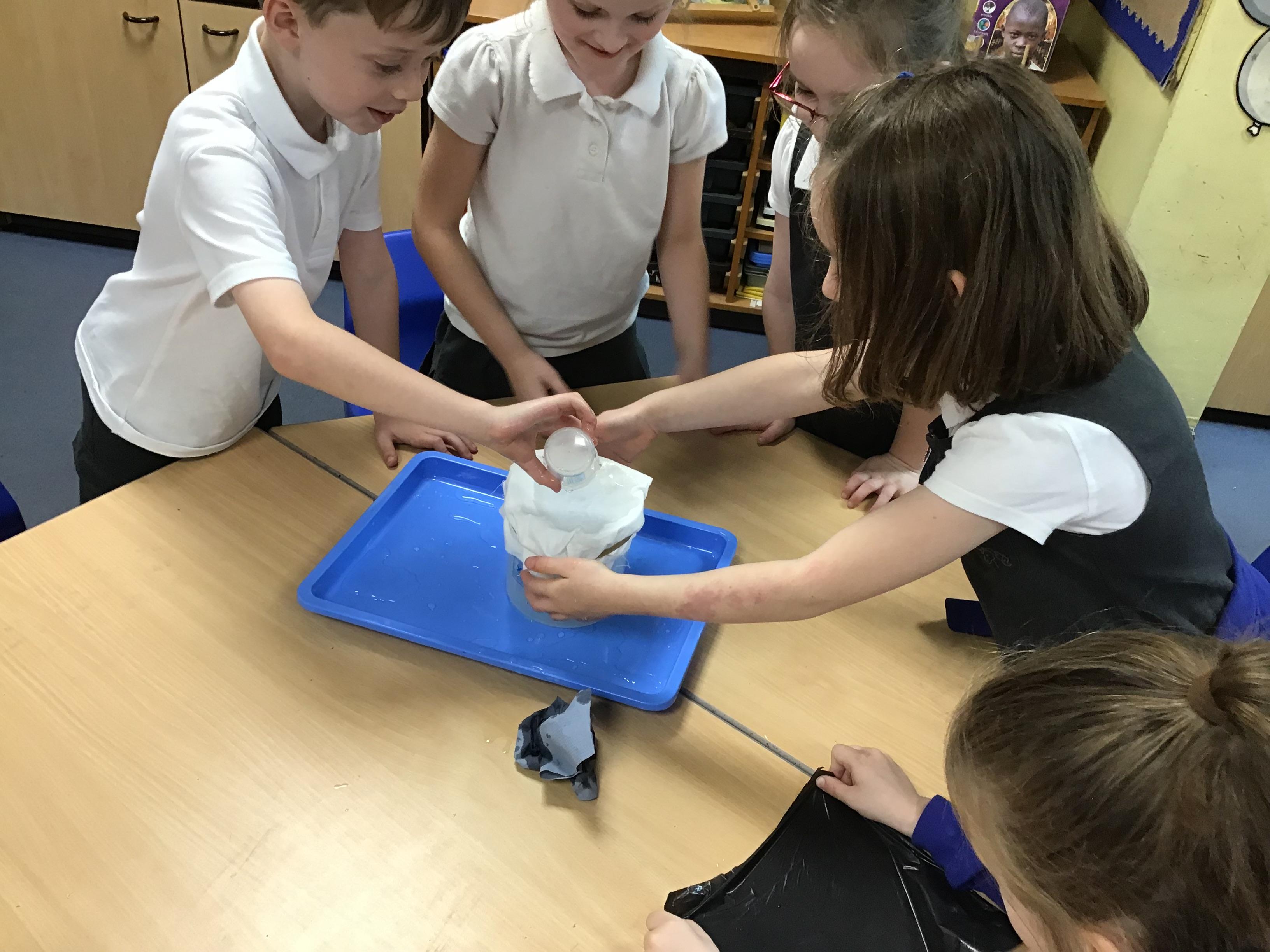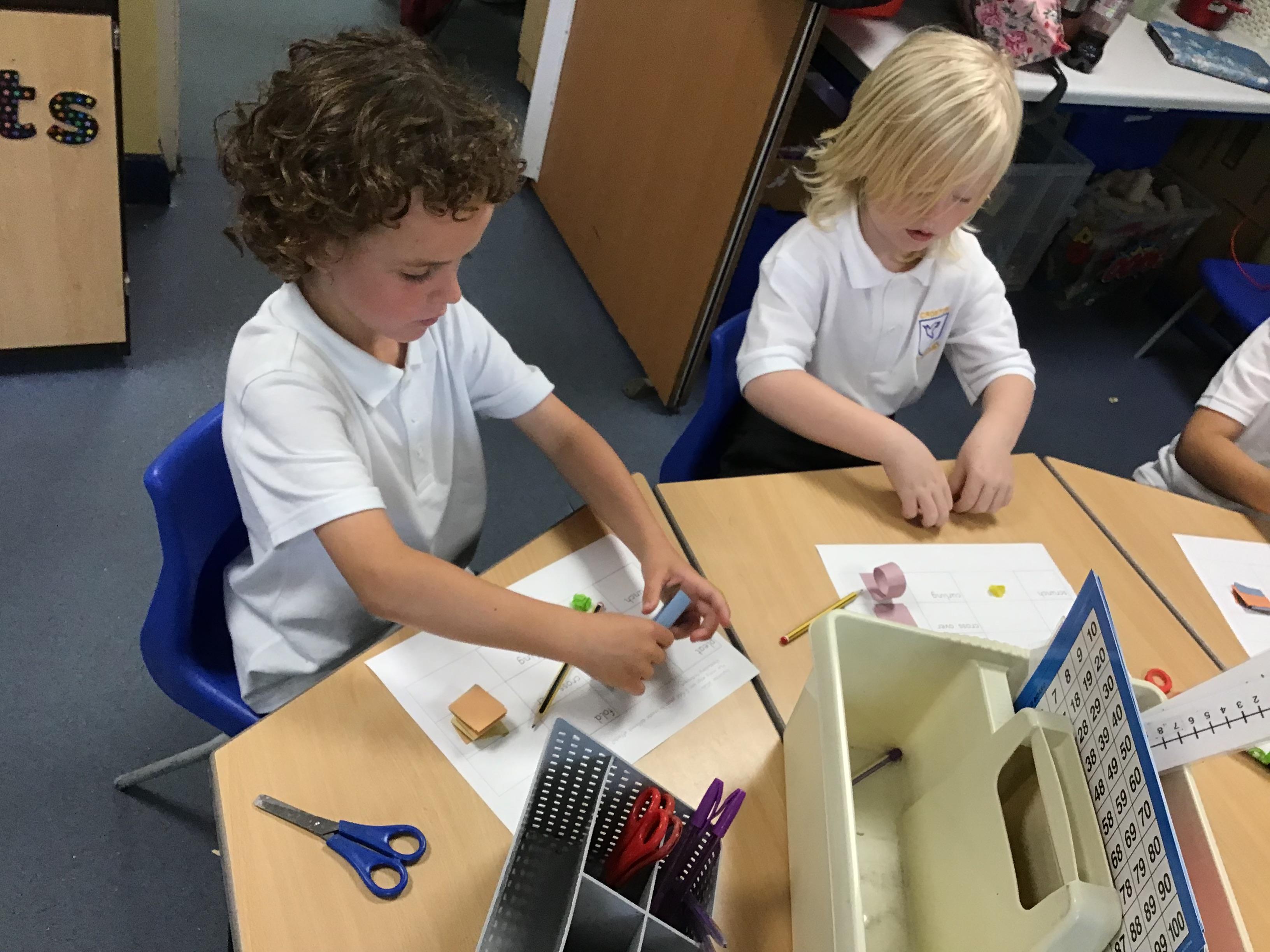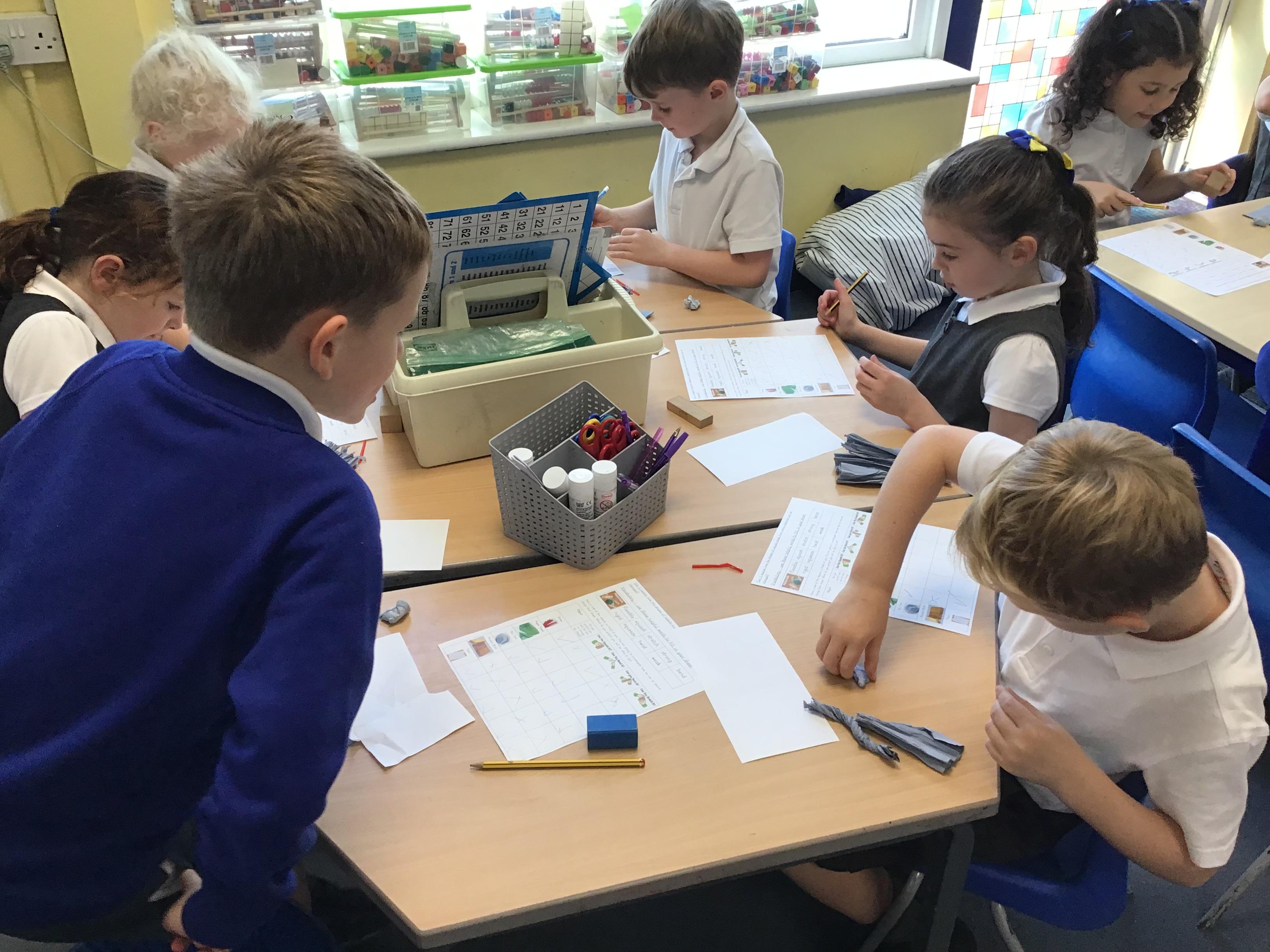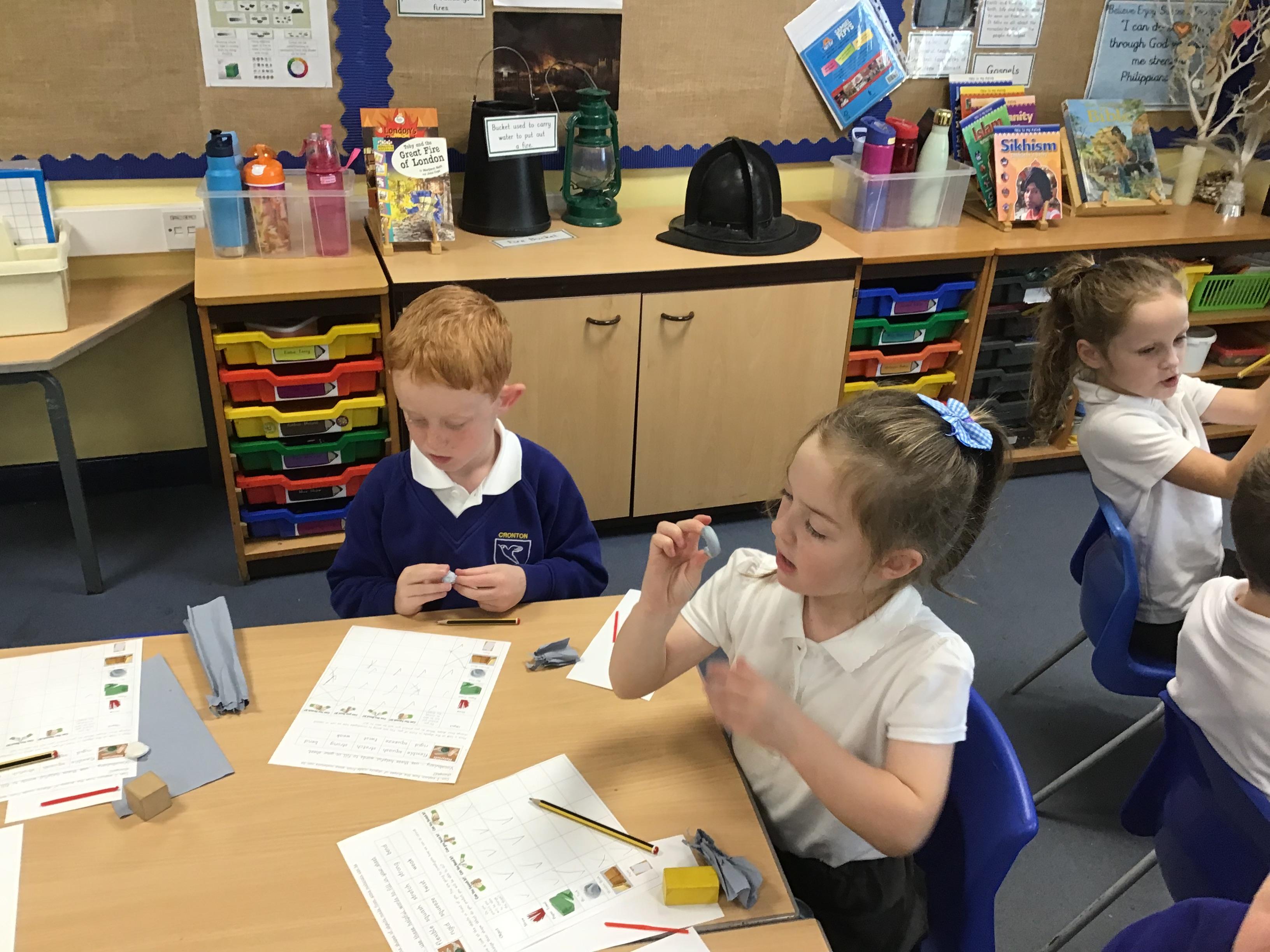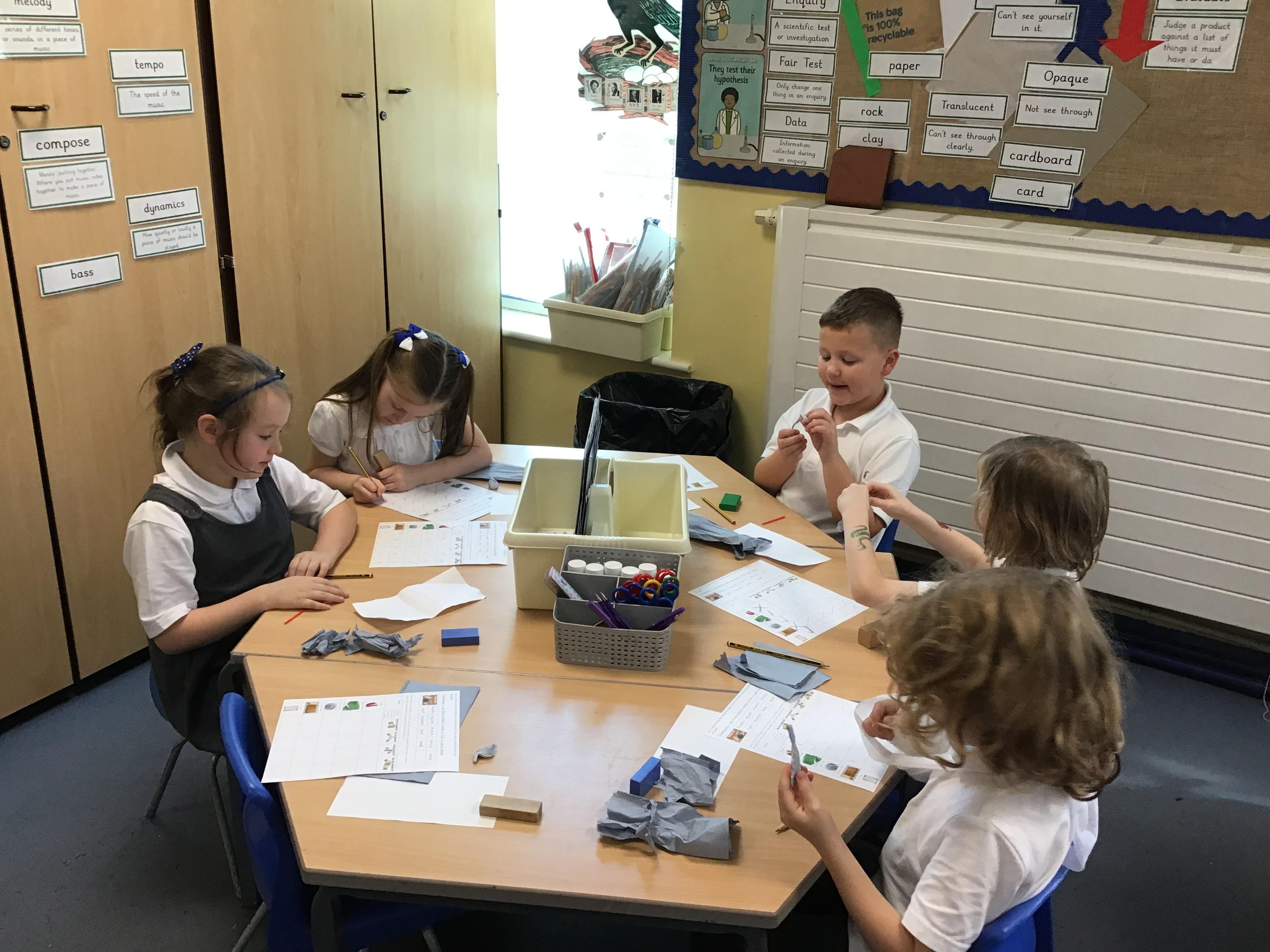 In science we investigated which materials we could change by squashing, squeezing, stretching and twisting. We investigated blu tack, wood, plastic and paper. After we had made our predictions we got testing!