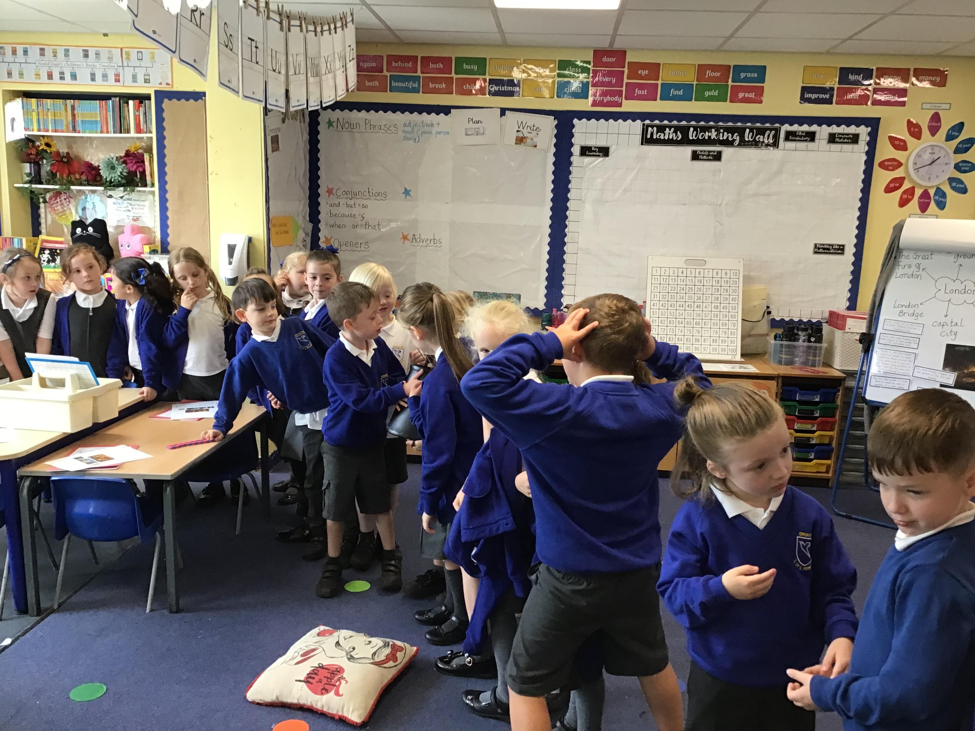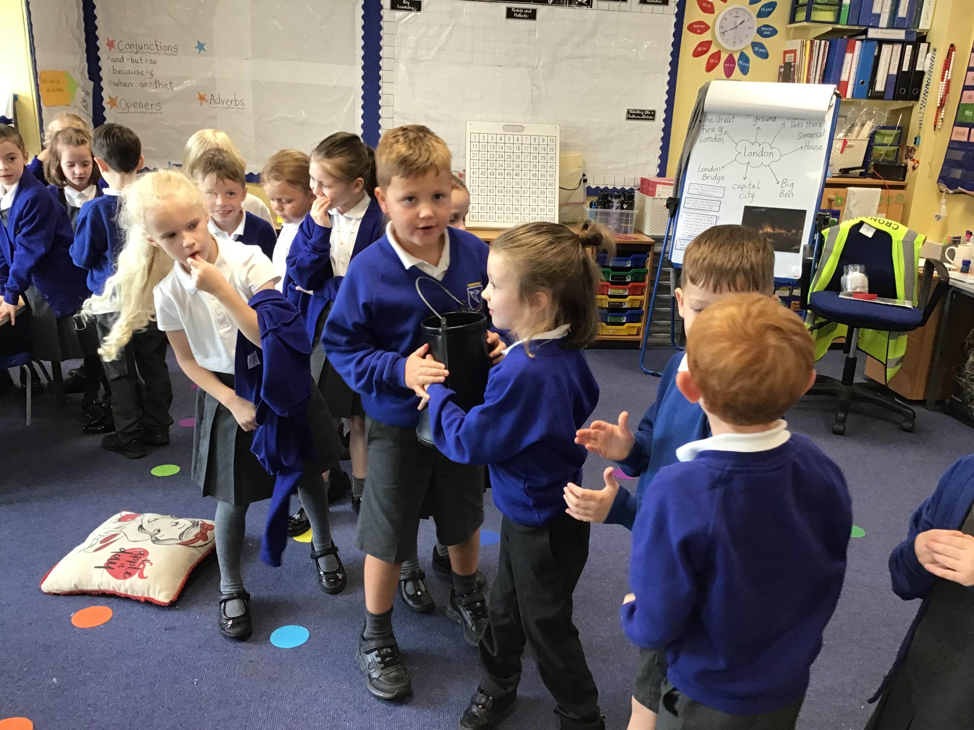 In our history this week we looked at the reasons the Great Fire of London was able to spread so quickly. We learned what the streets and houses were like and what building materials were used. We learned that they had no fire engines and made our own bucket chain from The River Thames to the 'fire' in our classroom. Fire fighting 1666 style!