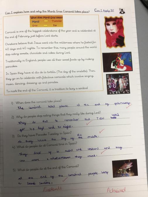 Today we have been learning about how and why the Mardi Gras Carnival is celebrated in Spain.