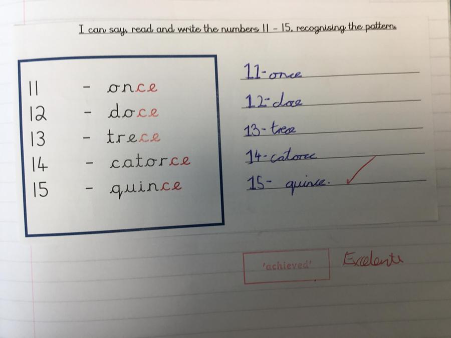 This week, we have been learning how to count up to 15 in Spanish. We noticed a pattern in the spelling of the numbers 11-15.