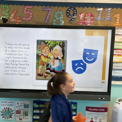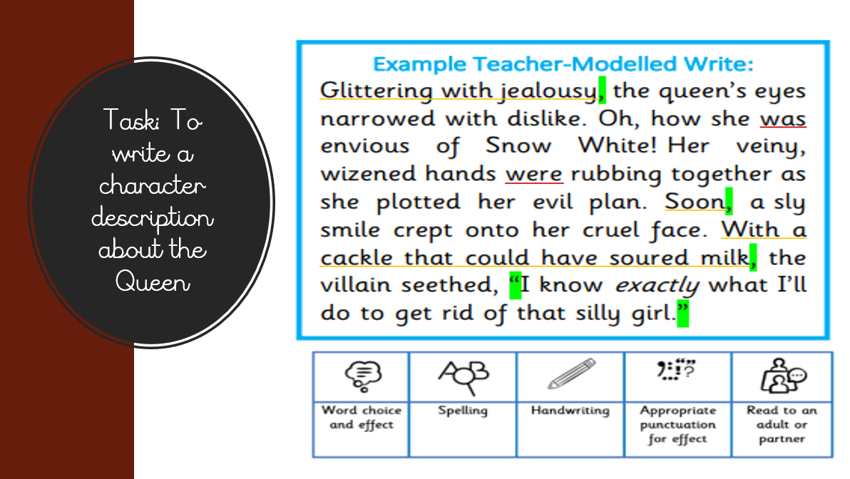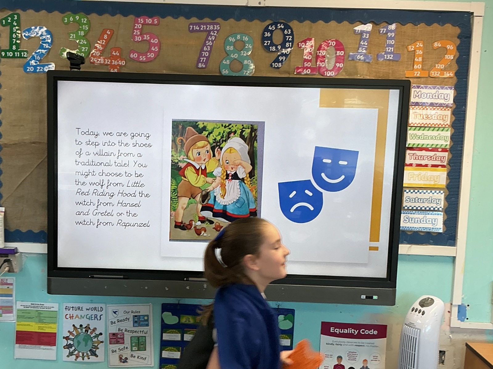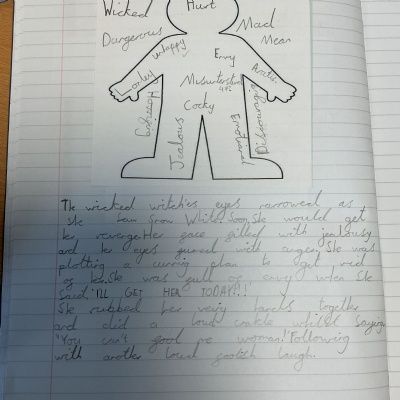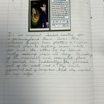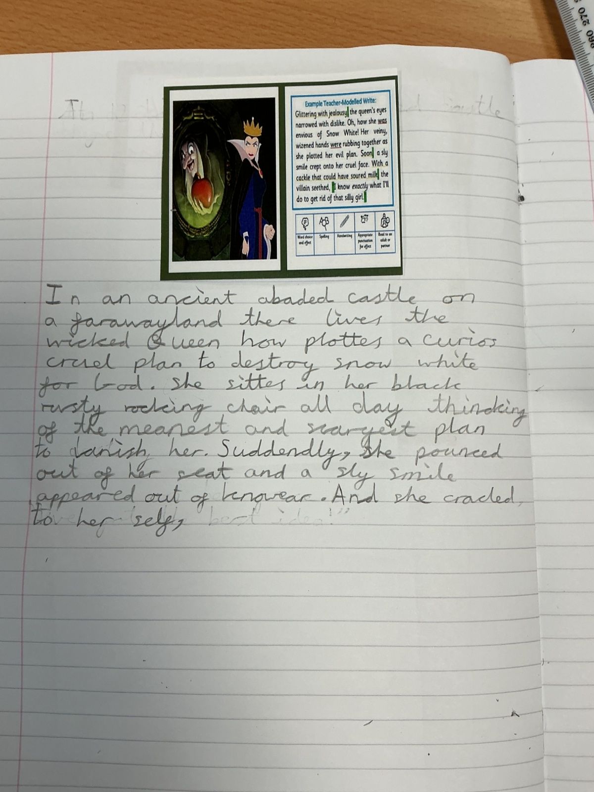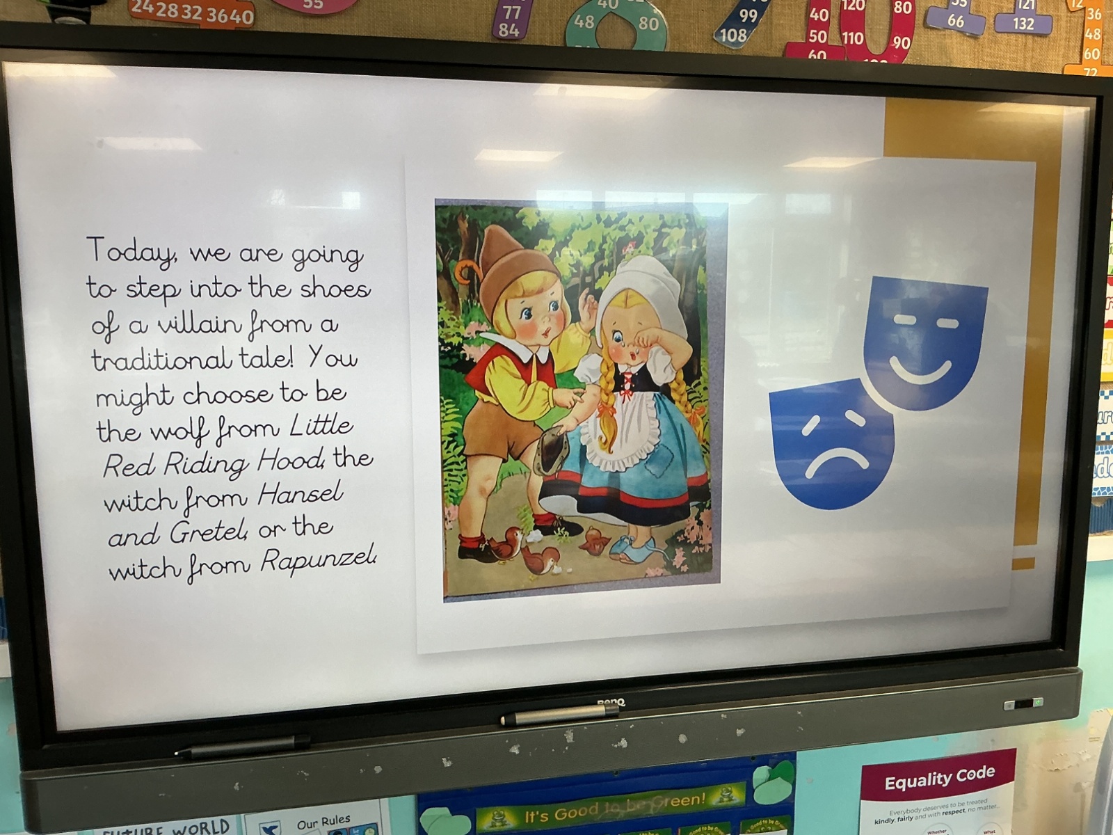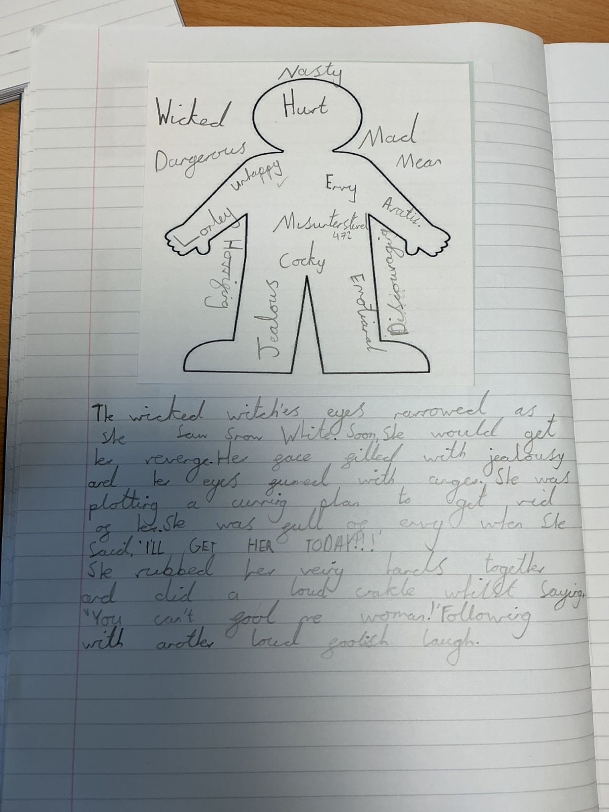 Throughout the week, we looked at the Queen's personality traits and how she acted. We acted as if we were a villain in order to understand the character. After that, we wrote a character description of the Queen.