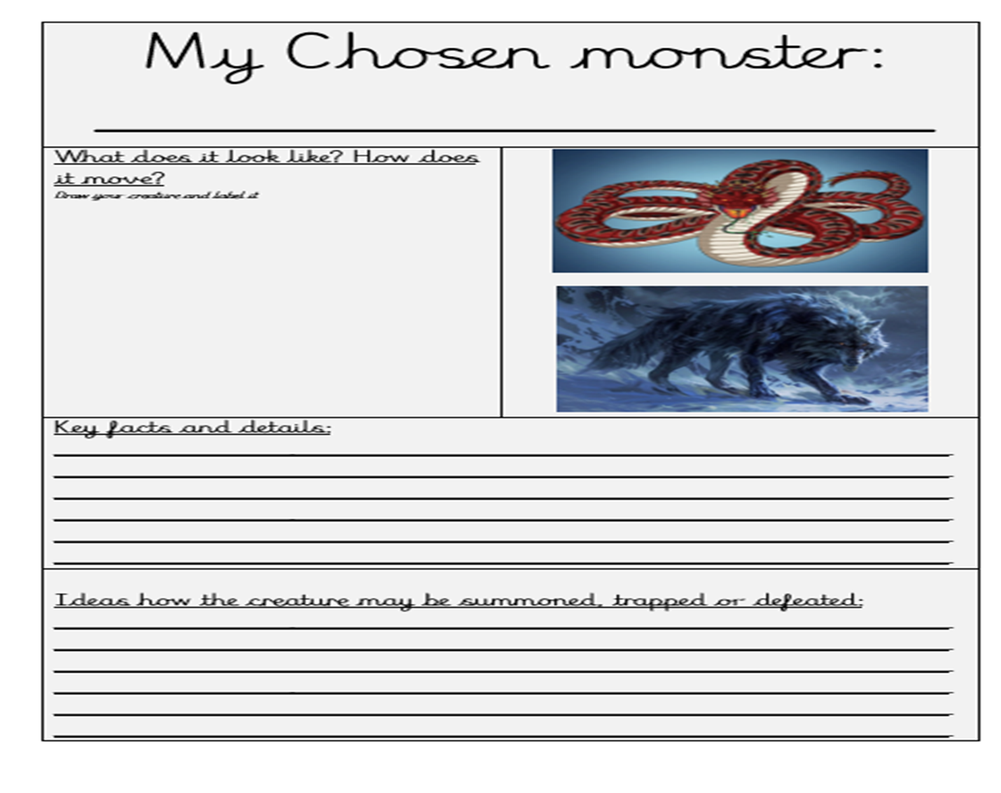 In our Ready, Steady, Write lessons, we started to look at a hunter's guide to defeating a monster. We explored two monsters from Norse mythology and researched information and facts about them. We discovered the snake (Jörmungandr) poisonous breath and its weakness is lightning. He is also a sea serpent and he is designed to fight the mighty Thor. We cannot wait to use these facts in our writing.