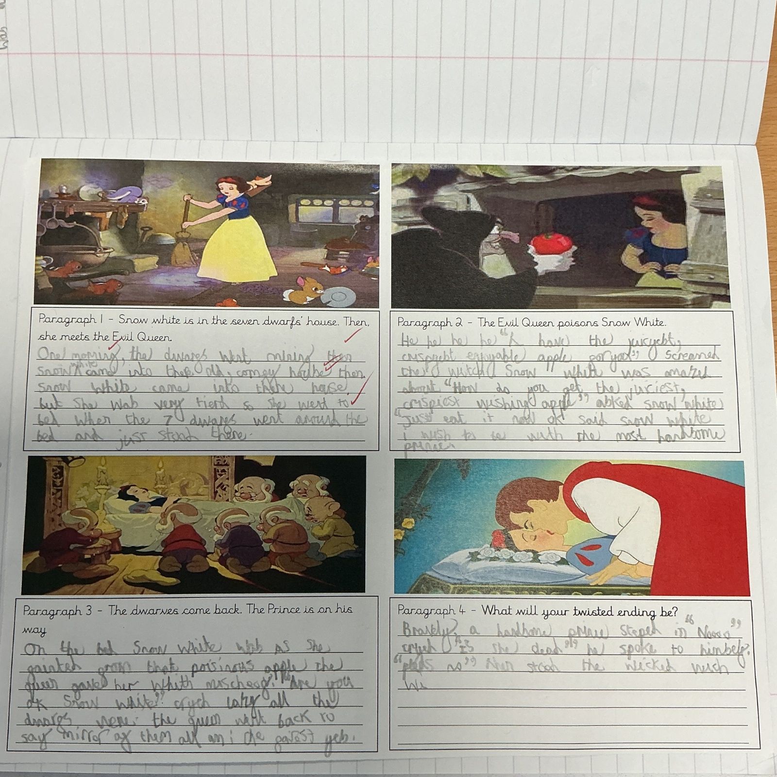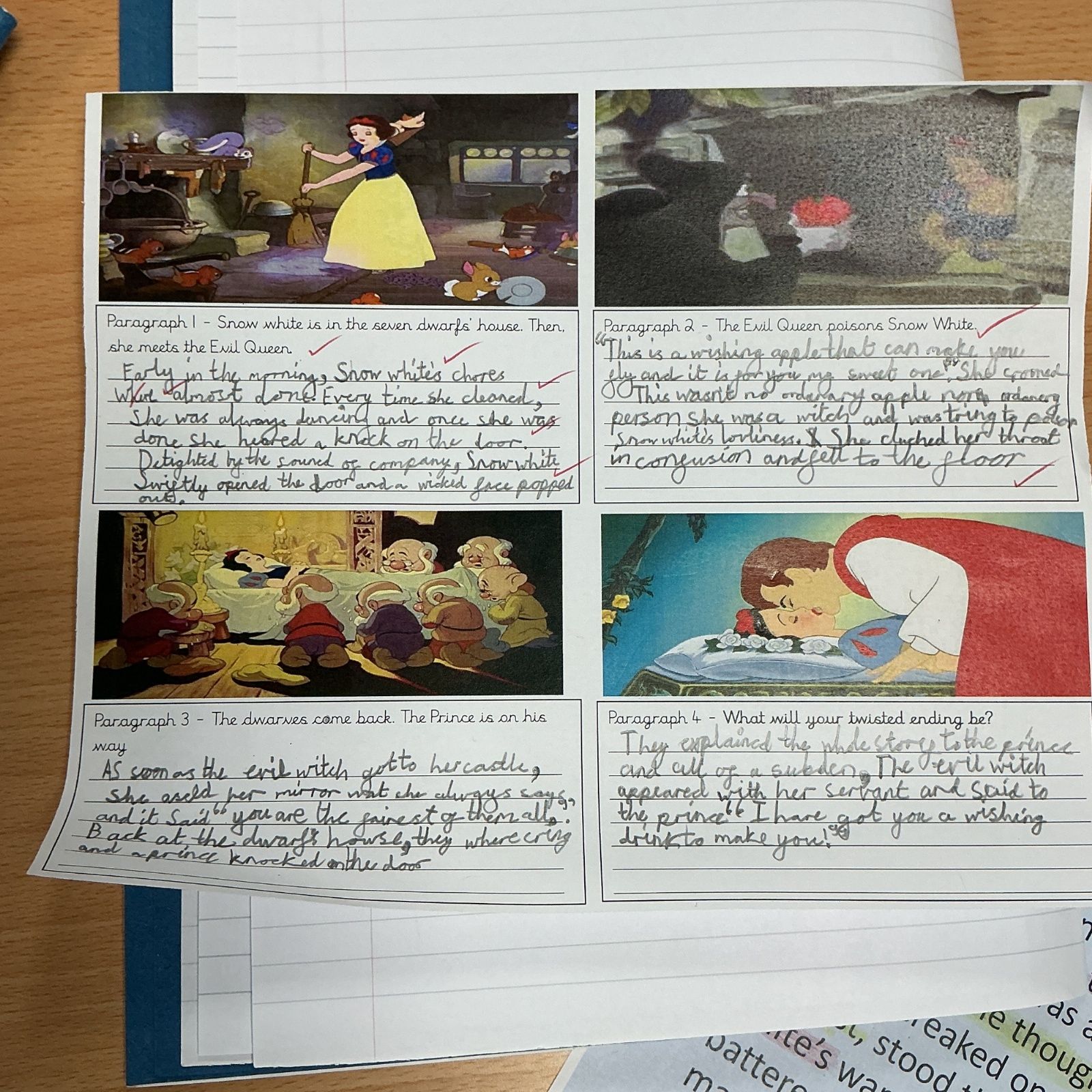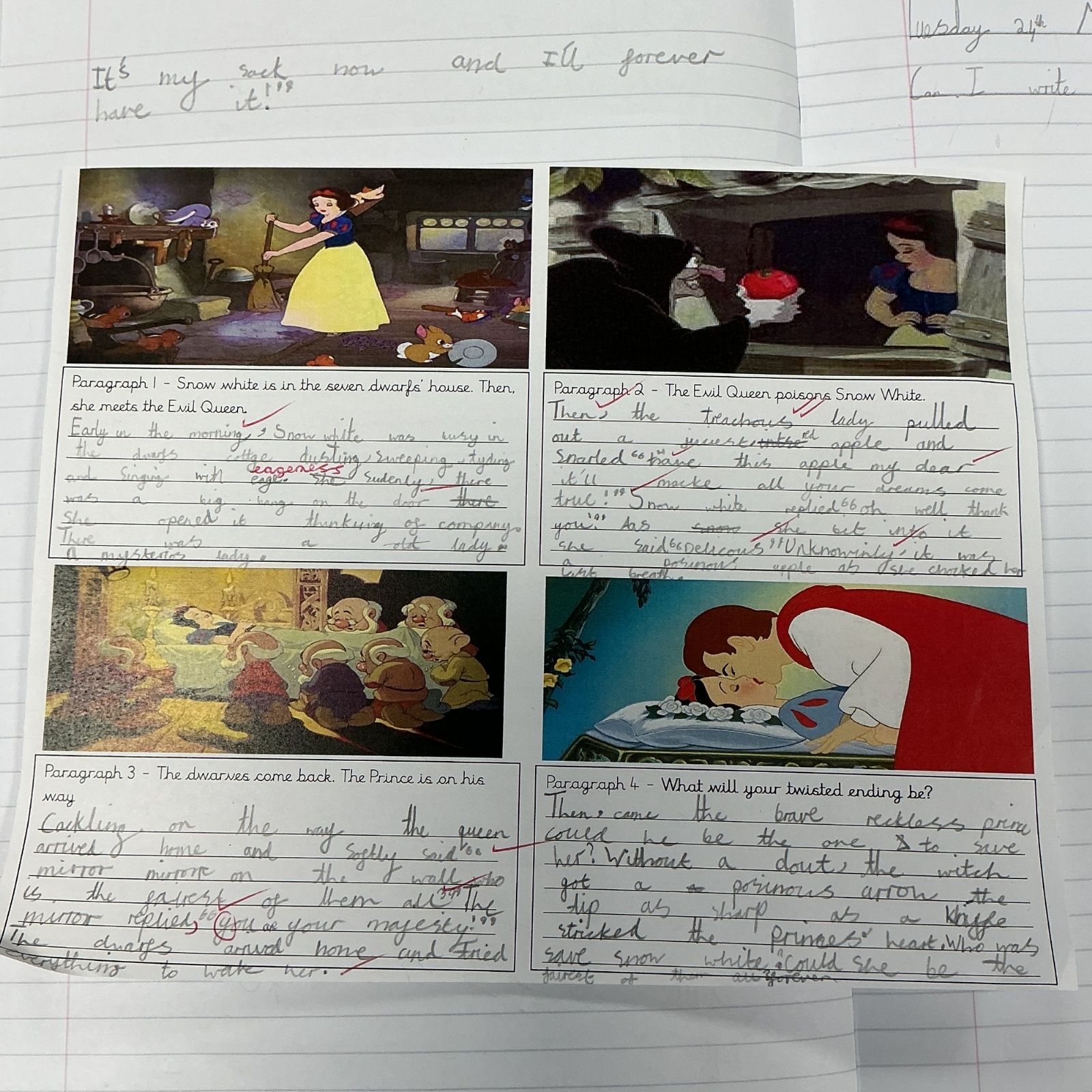 In English, we have had a delivery from the witch to ask us to write a twisted narrative from the traditional tale Snow White. Then, we read an example of what our writing should be like and explored key vocabulary by using dictionaries.
