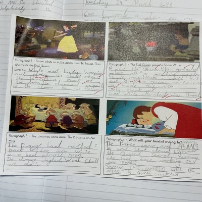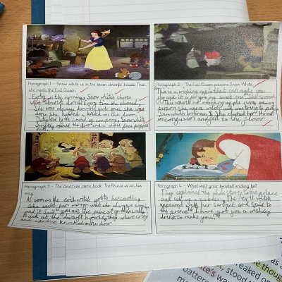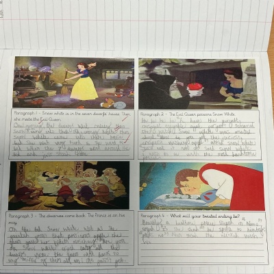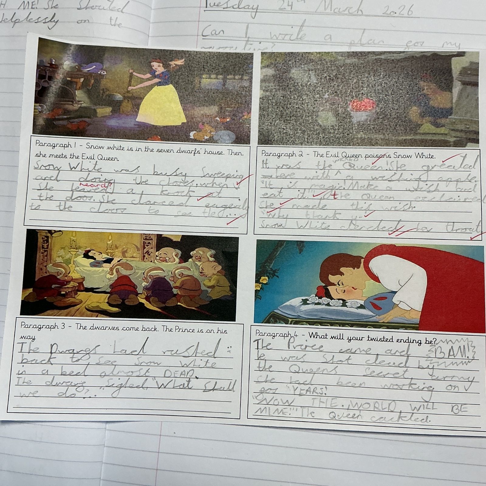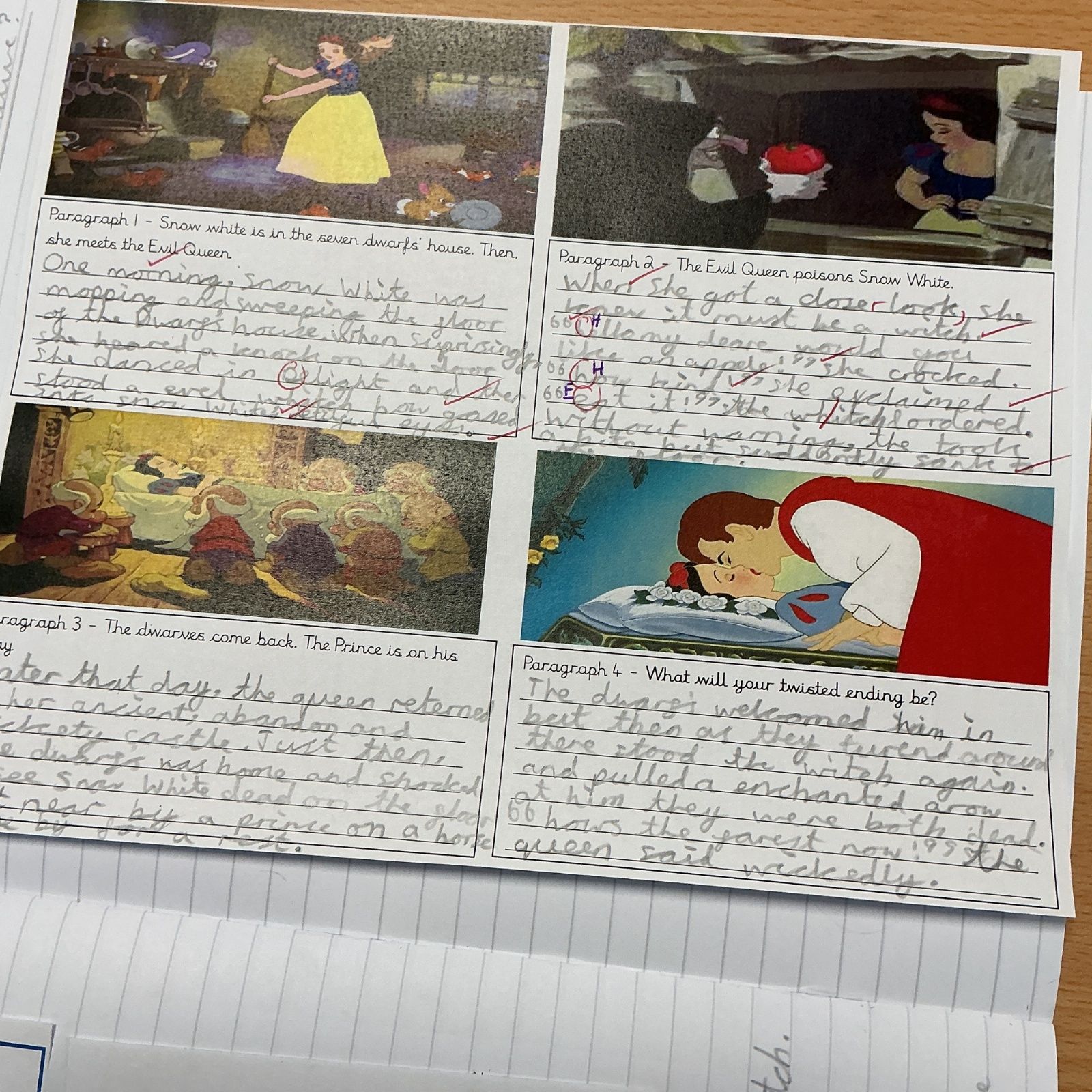In English, we have had a delivery from the witch to ask us to write a twisted narrative from the traditional tale Snow White. Then, we read an example of what our writing should be like and explored key vocabulary by using dictionaries.