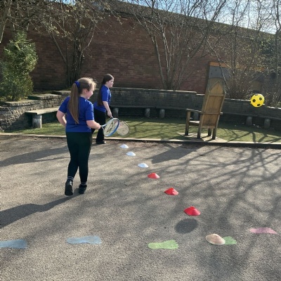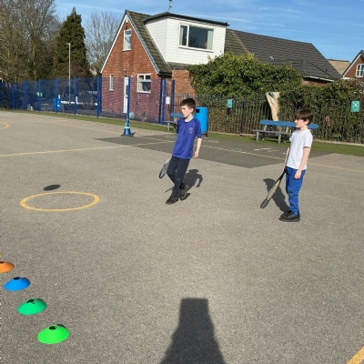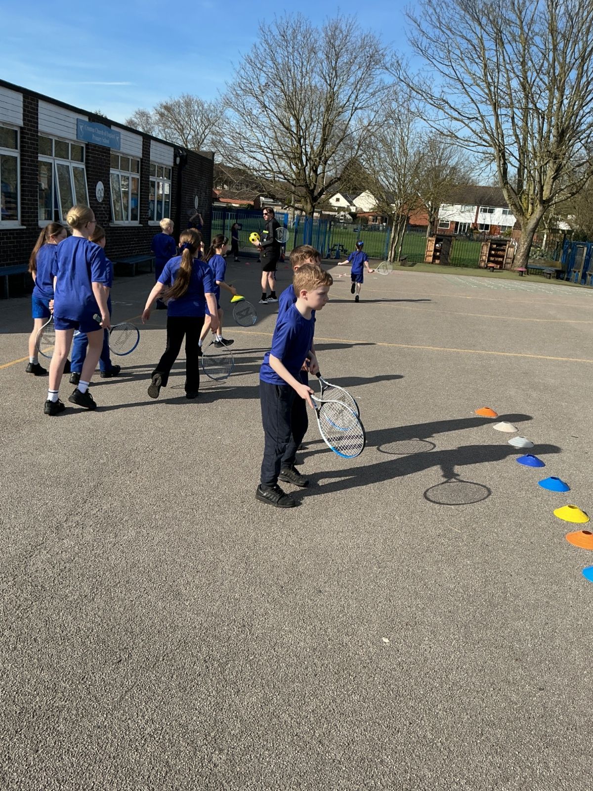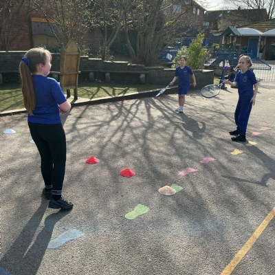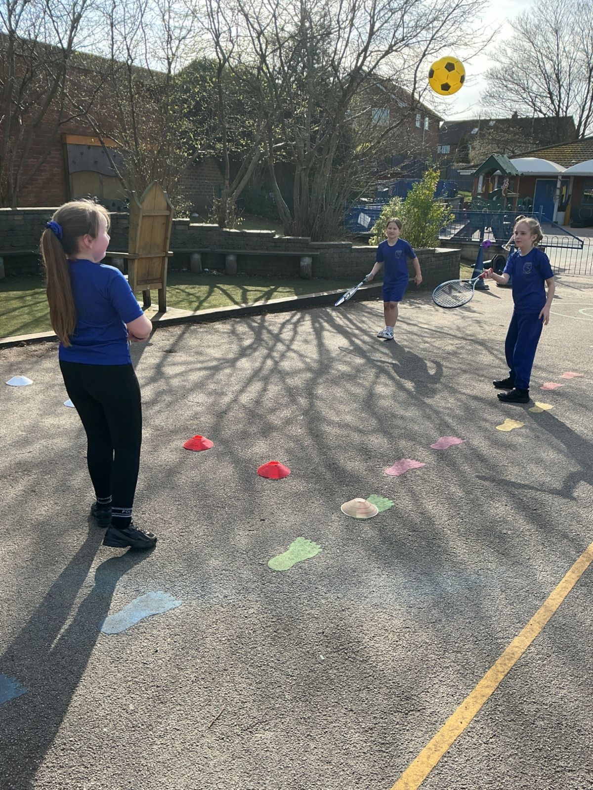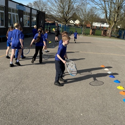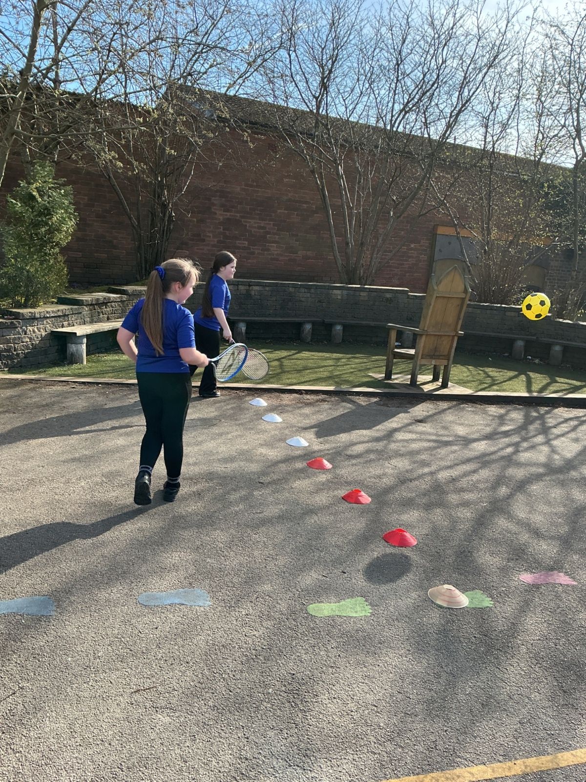 In P.E., we have been playing tennis in the beautiful weather. We have been focusing on ball control and hitting it with our partners.