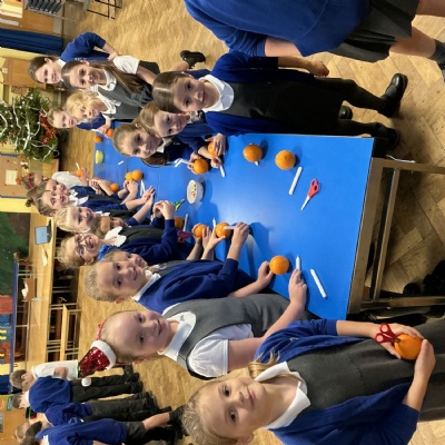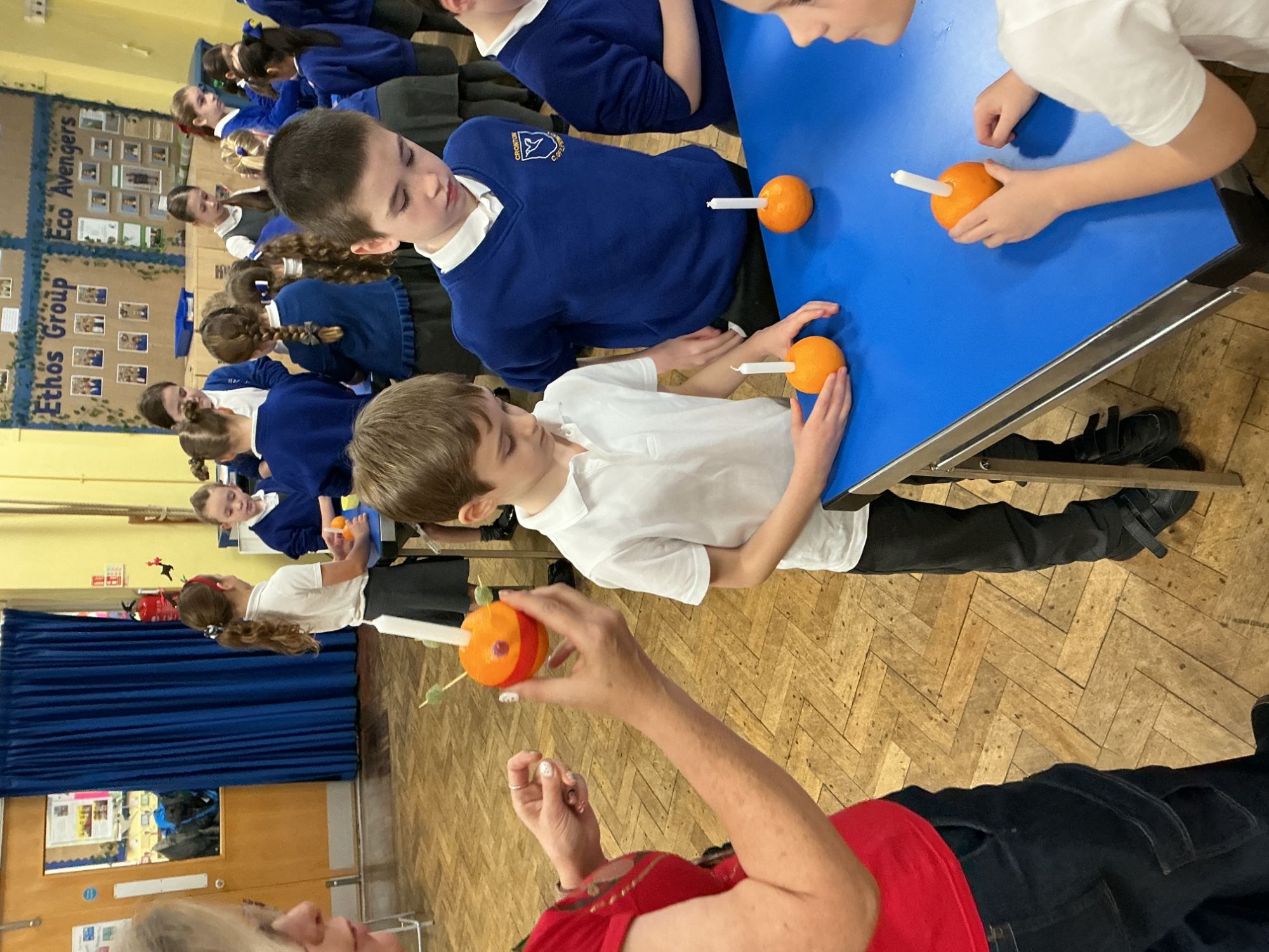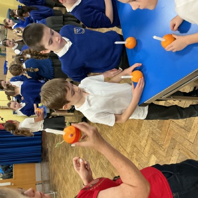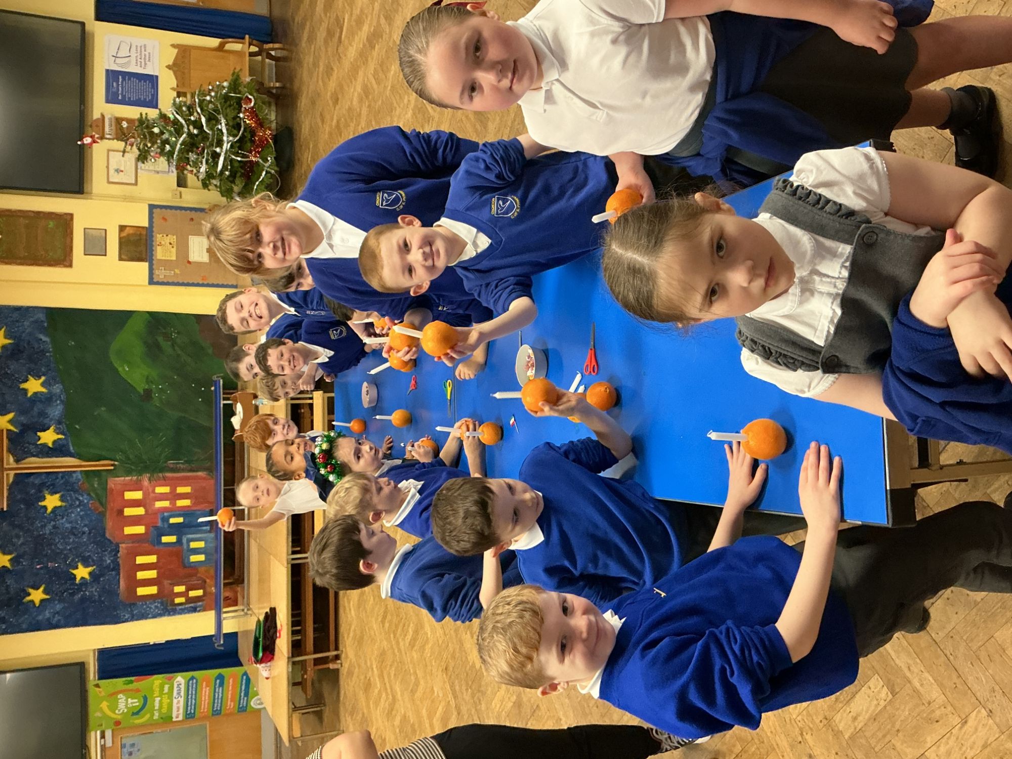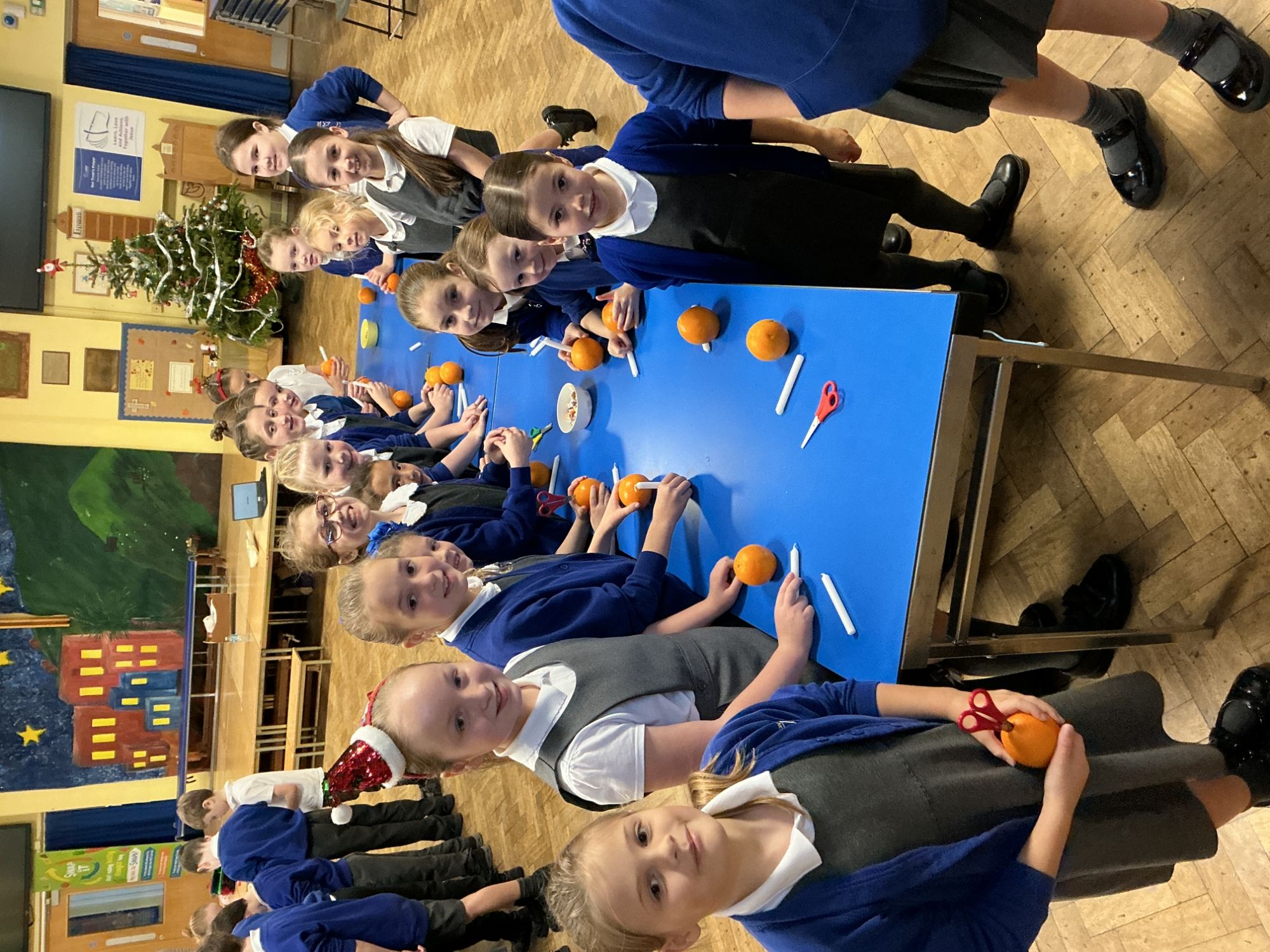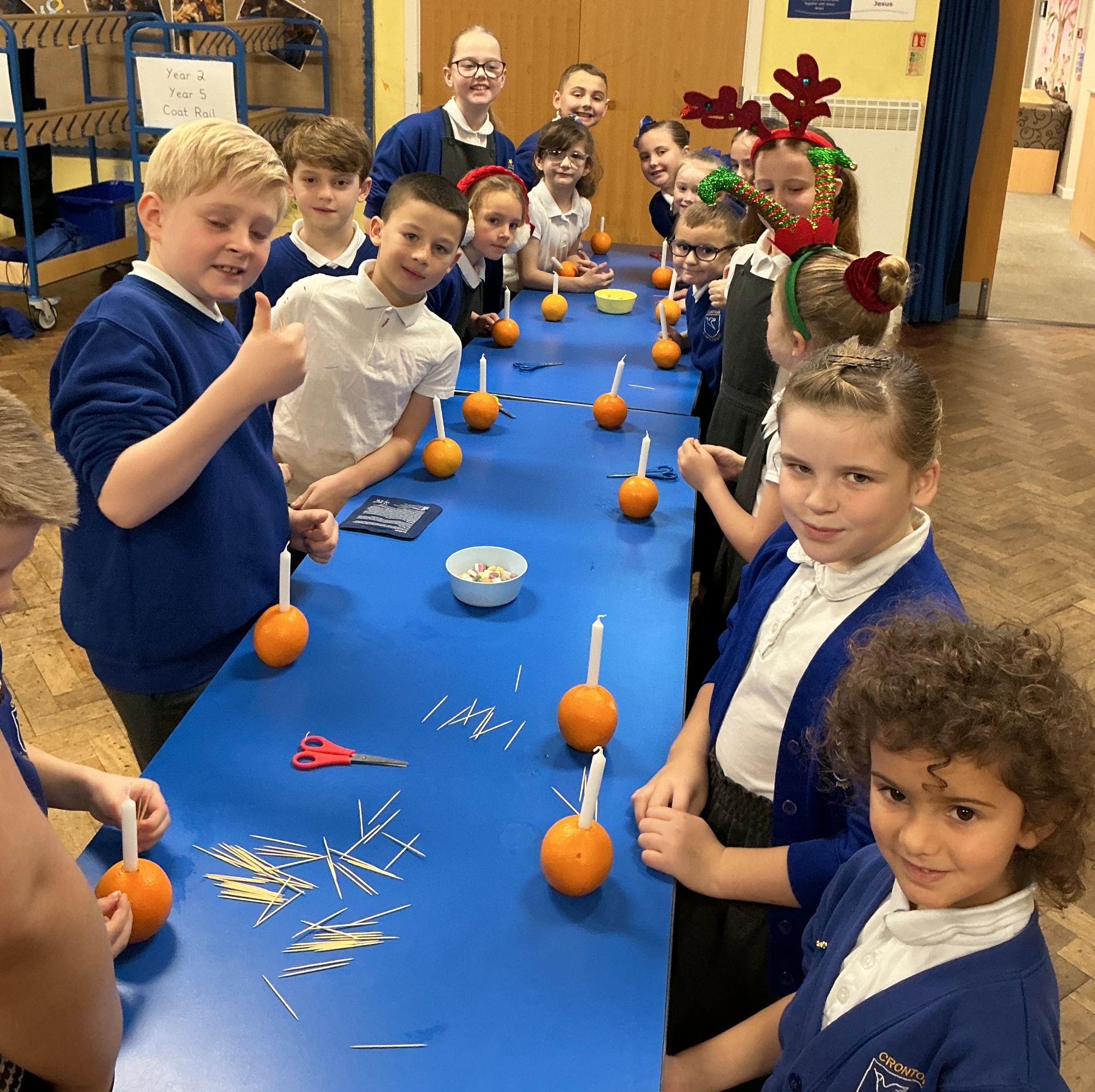 Year 2 and Year 4 having fun making Christingles with Mrs Liptrot.