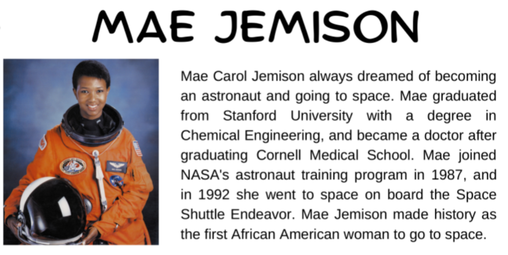 As it has been science week, we have looked at space. We also looked at a scientist linked to space travel. Mae Jemison was the first black woman to travel in space. We looked at how inspirational her journey was and her determination to become an astronaut.