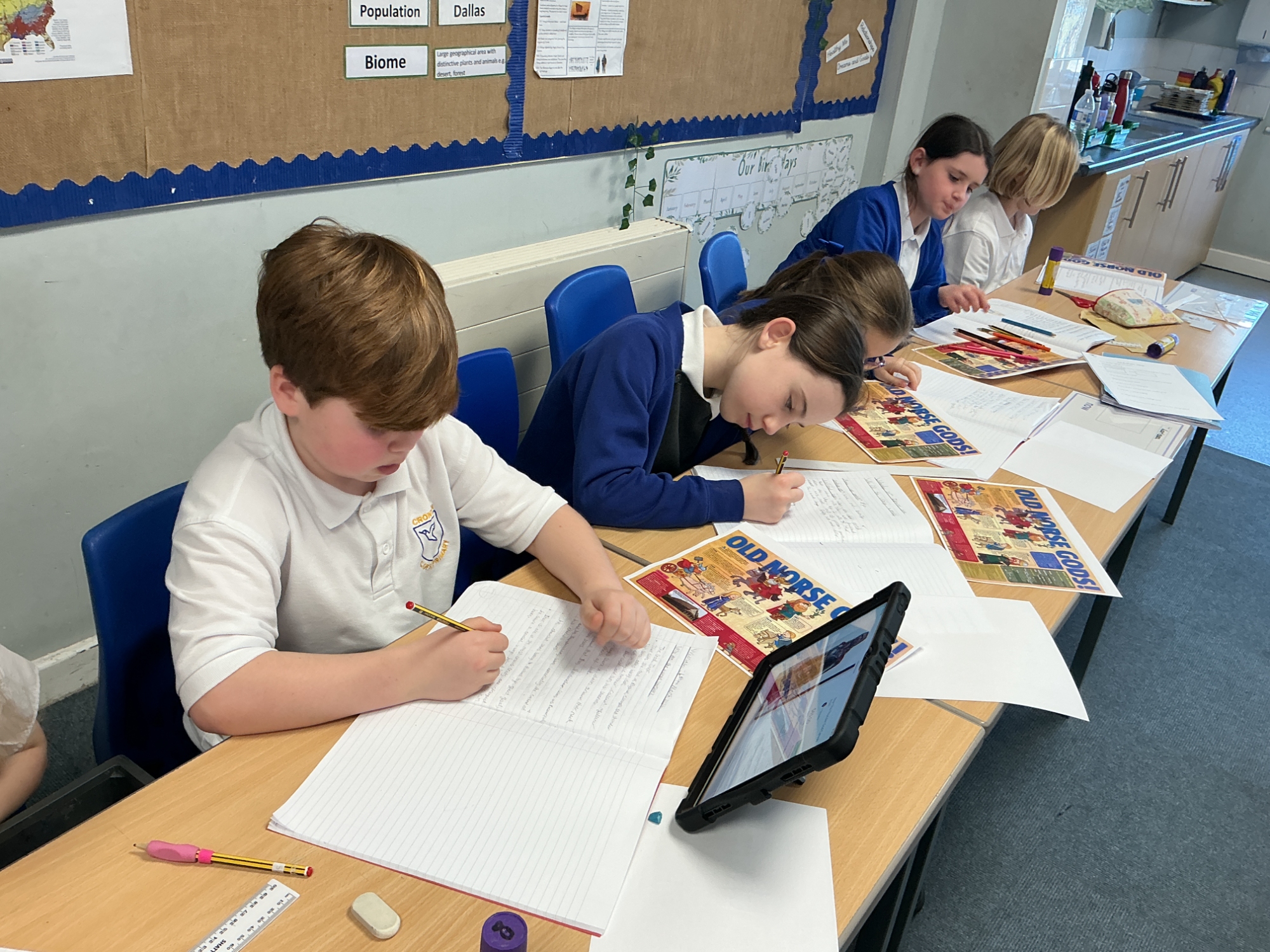 In English , we ahve continued to analyse the text and all thewriters knowedge to help us when we begin to plan our own narrative.