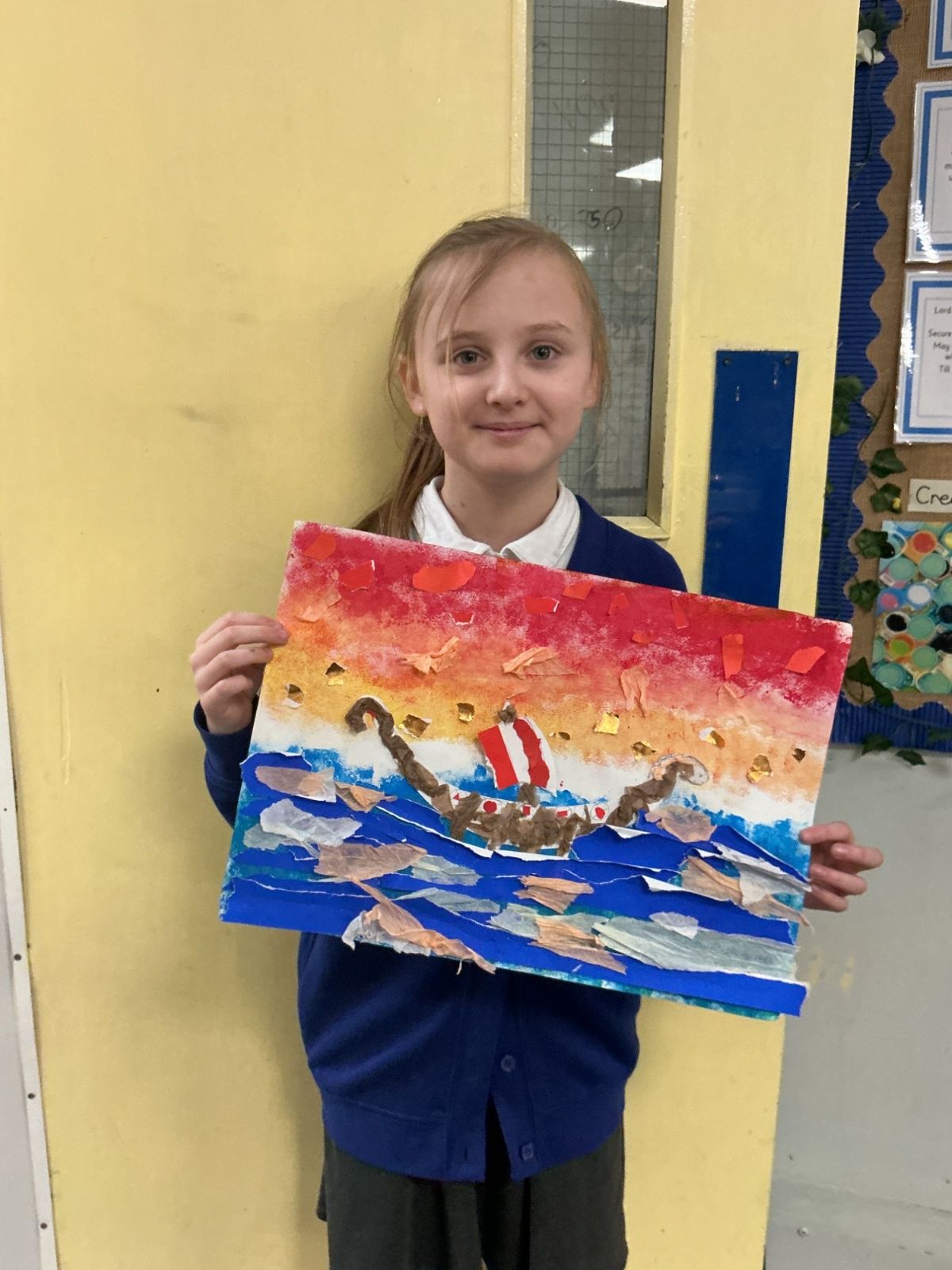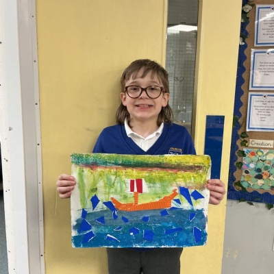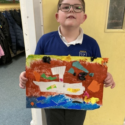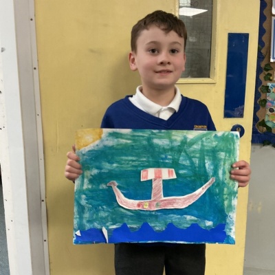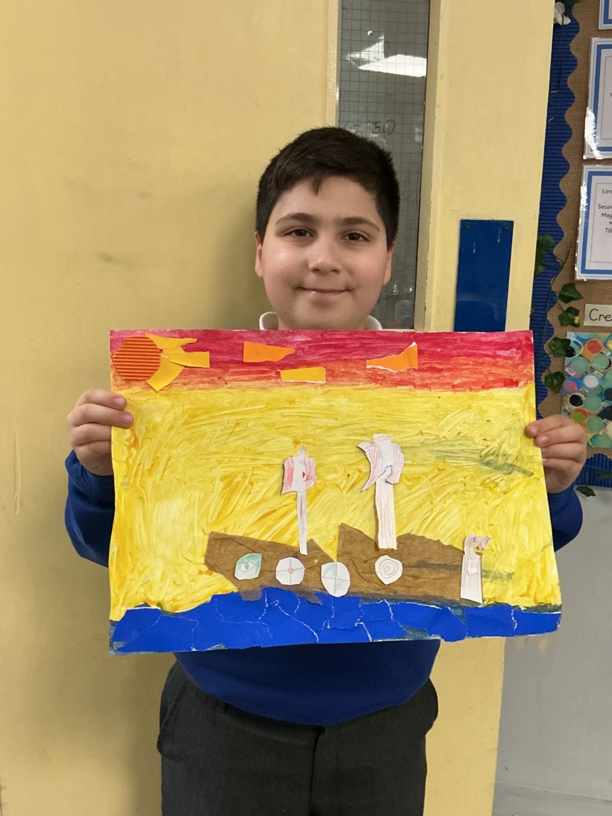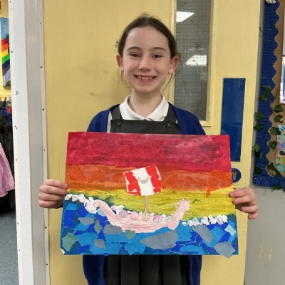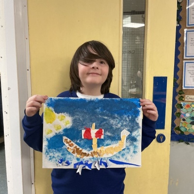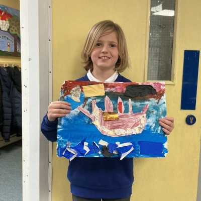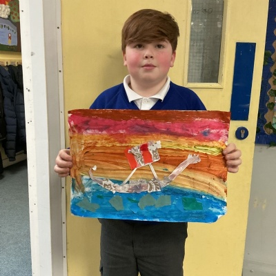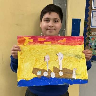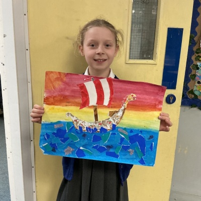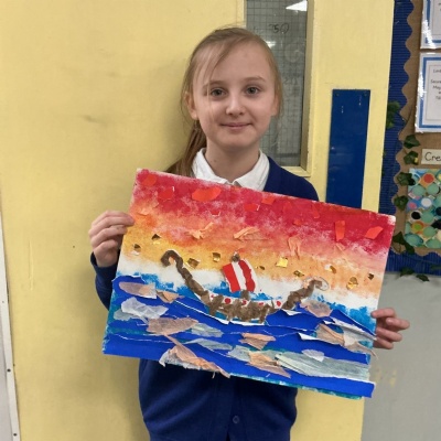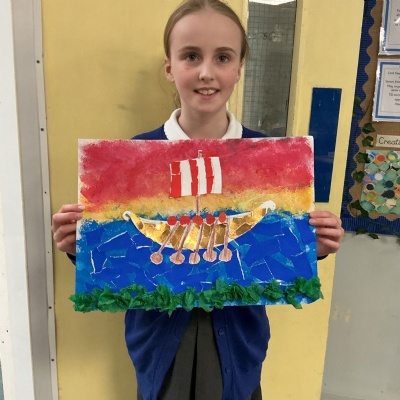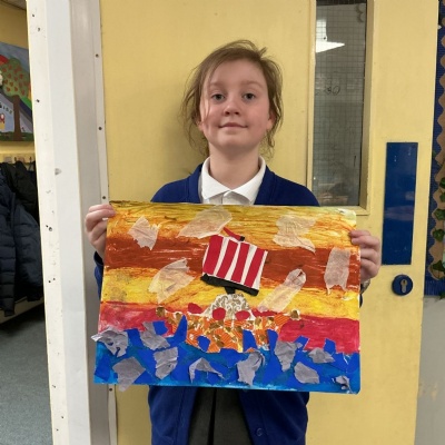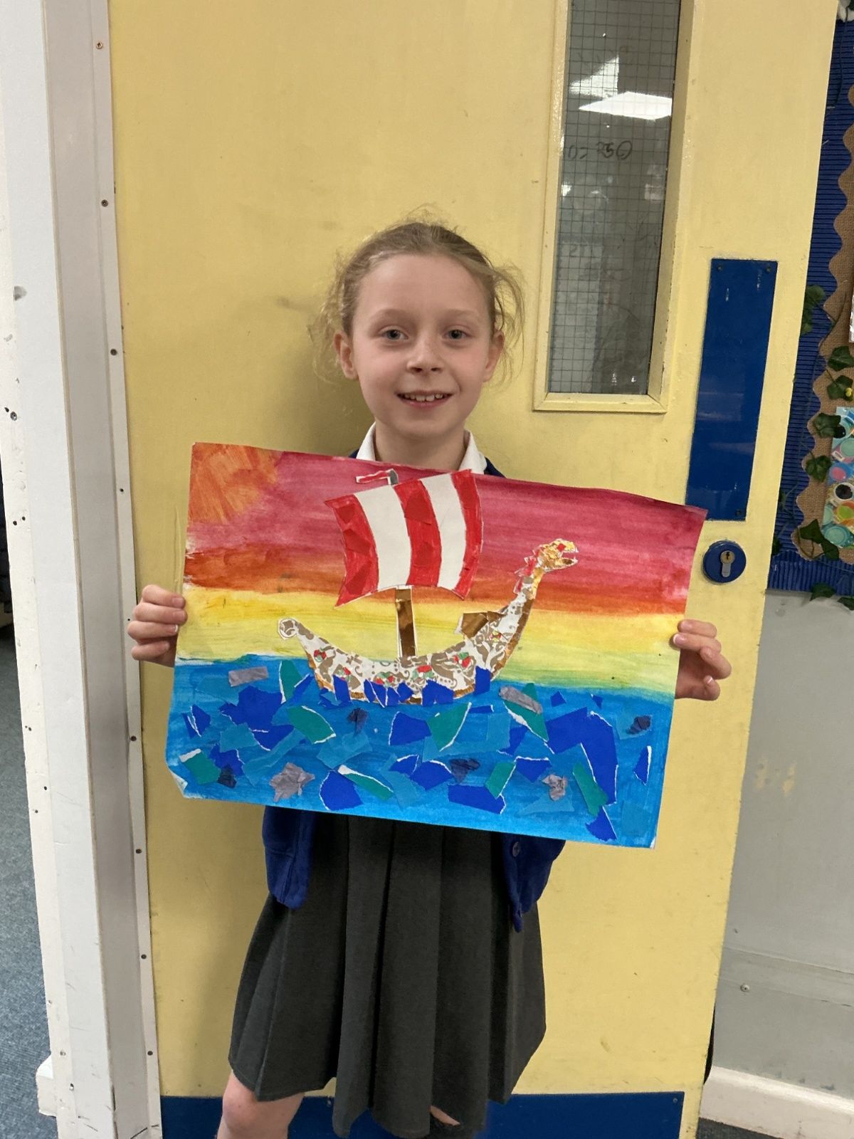 In history, The children have continued to look at the Vikings and in art use this inspiration of the Viking longboat to complete a collage.