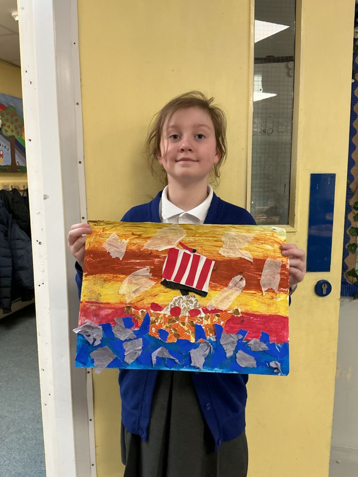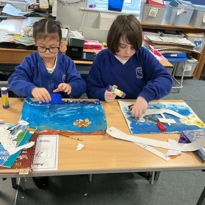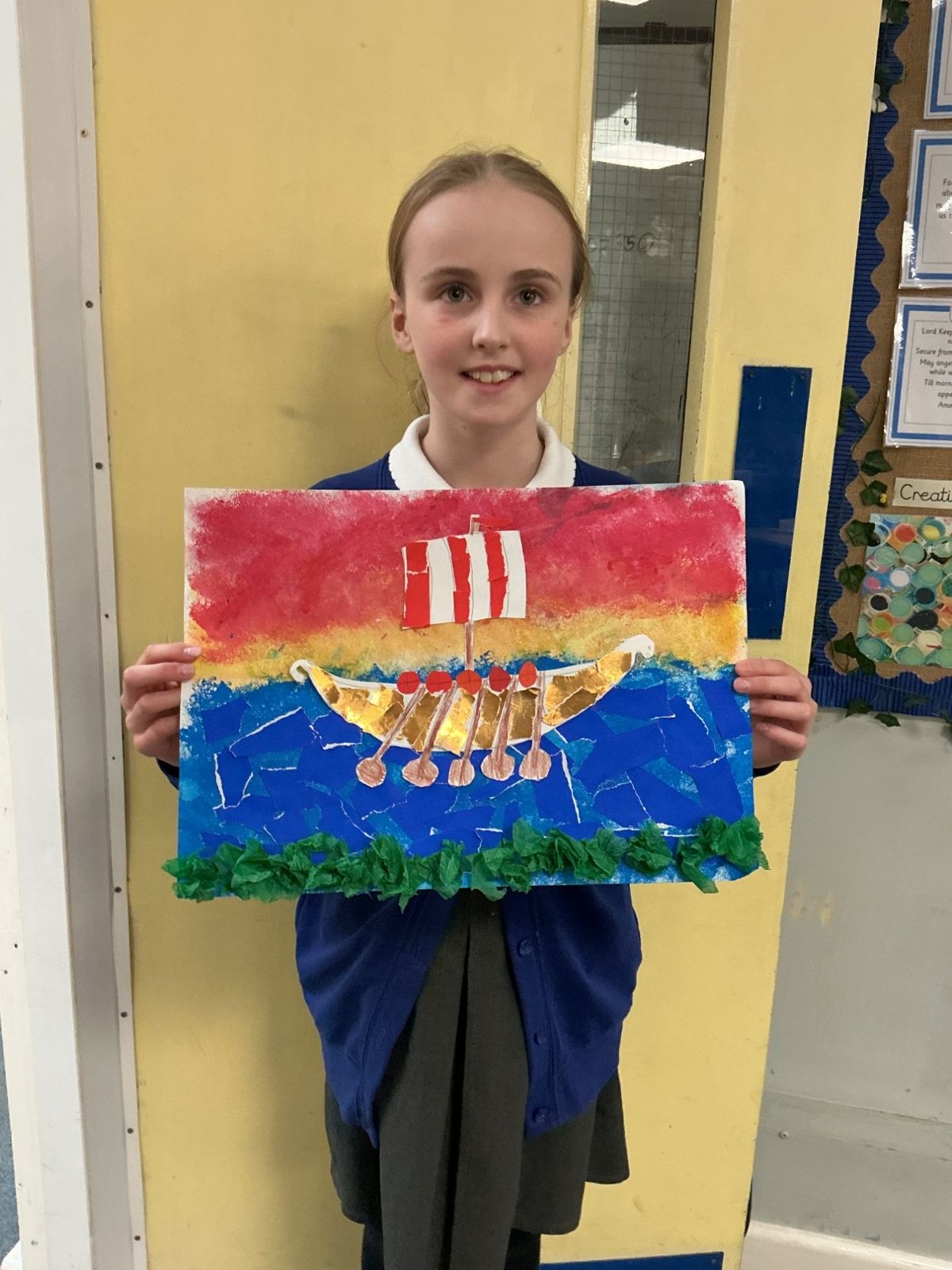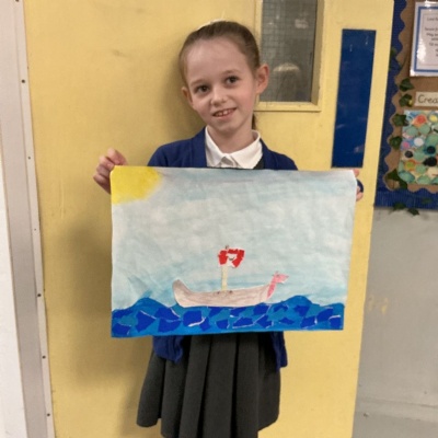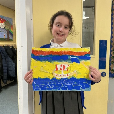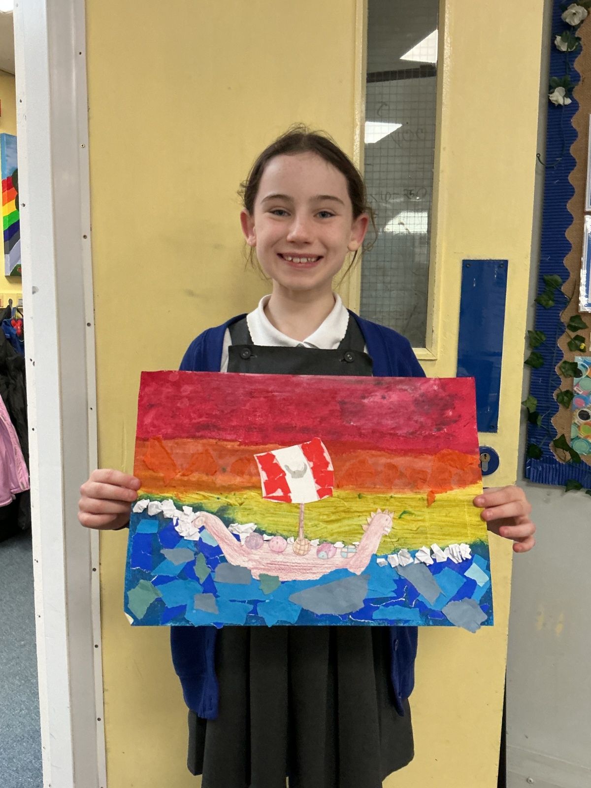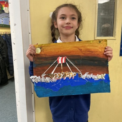 In history, The children have continued to look at the Vikings and in art use this inspiration of the Viking longboat to complete a collage.