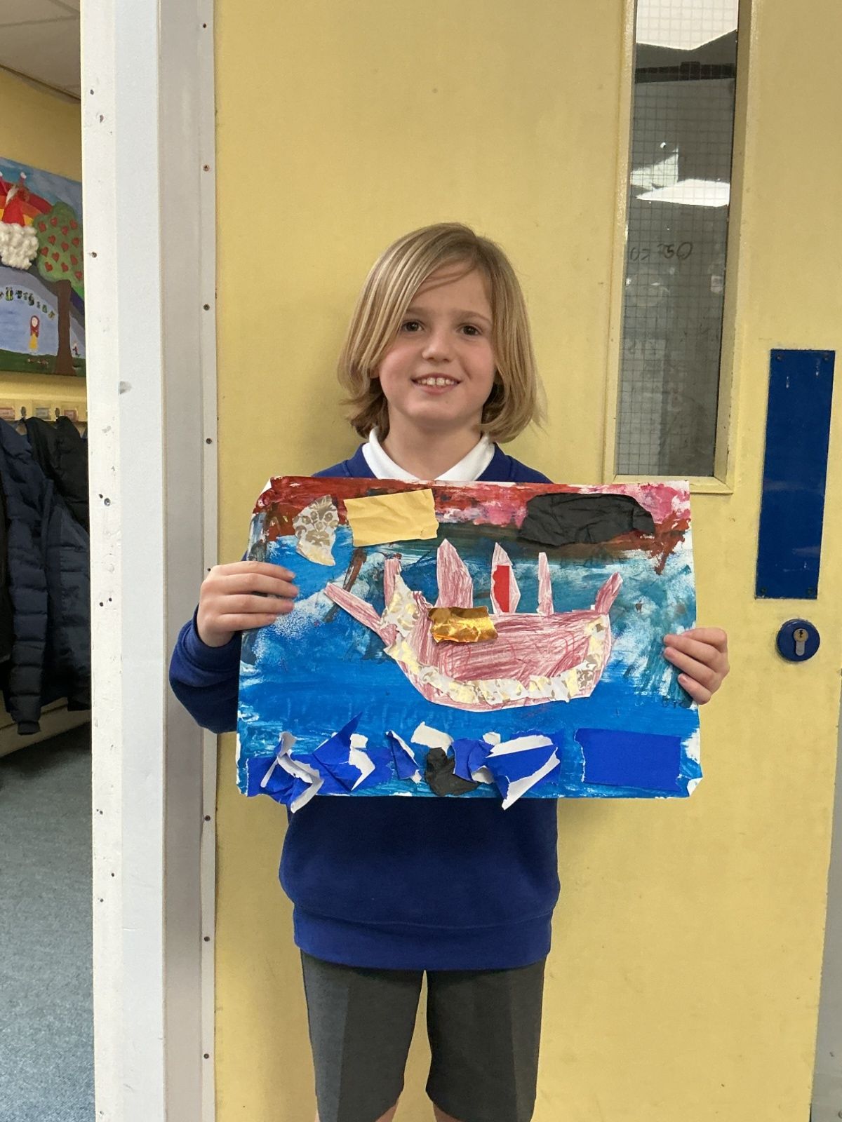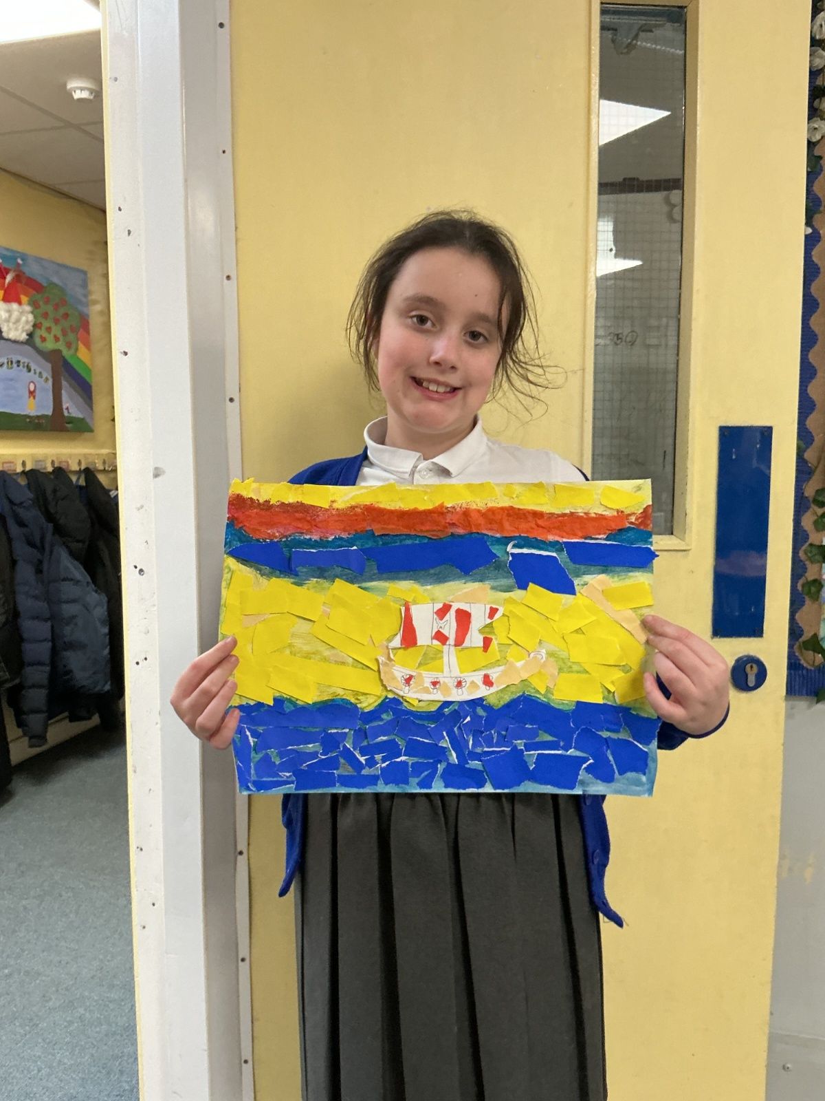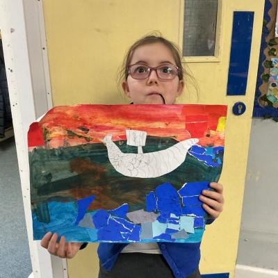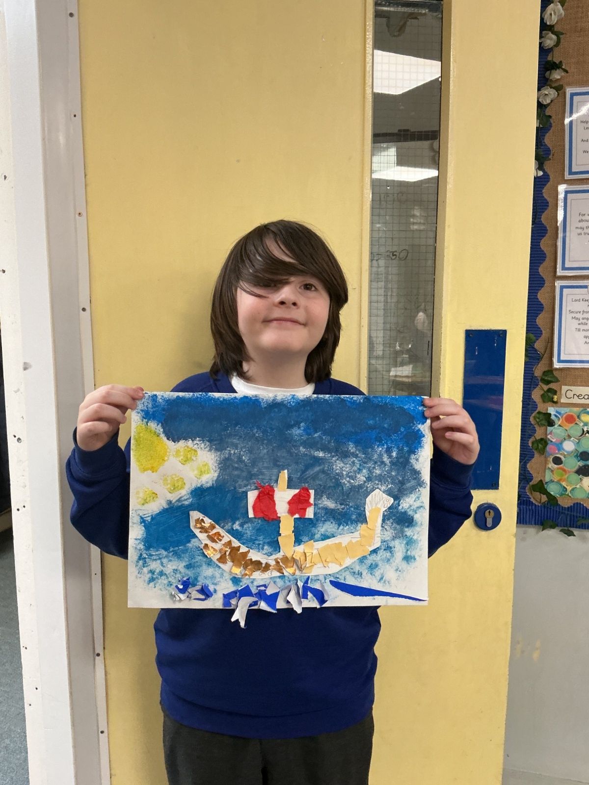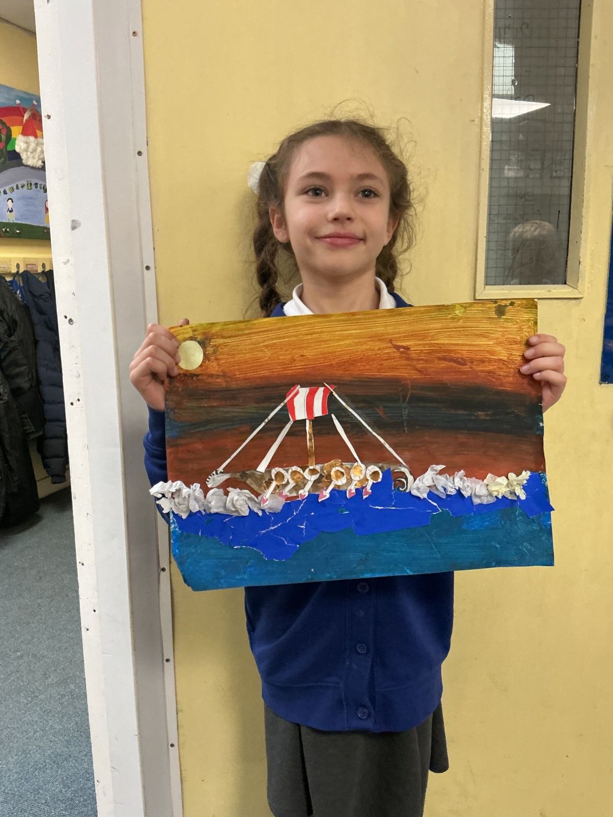 In history, The children have continued to look at the Vikings and in art use this inspiration of the Viking longboat to complete a collage.