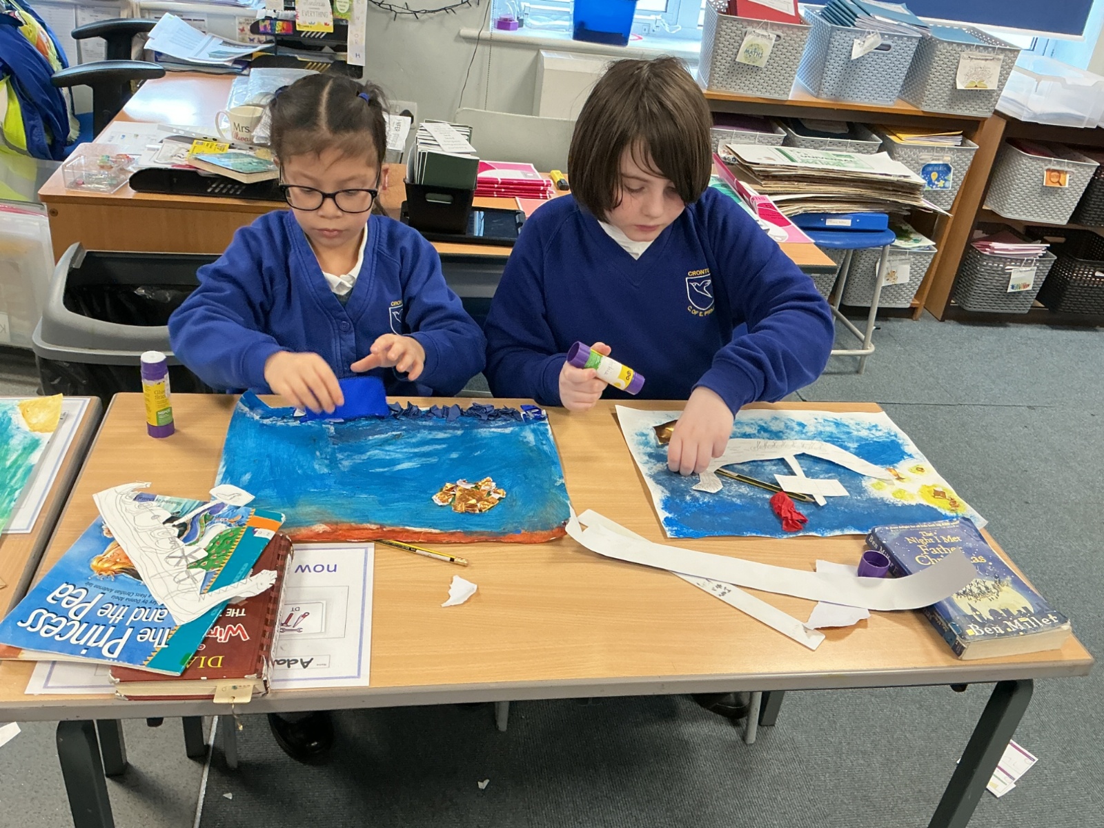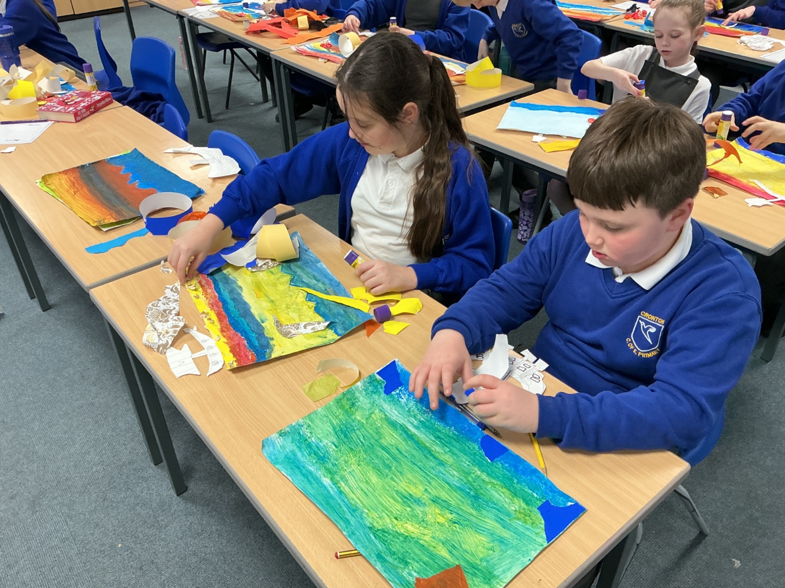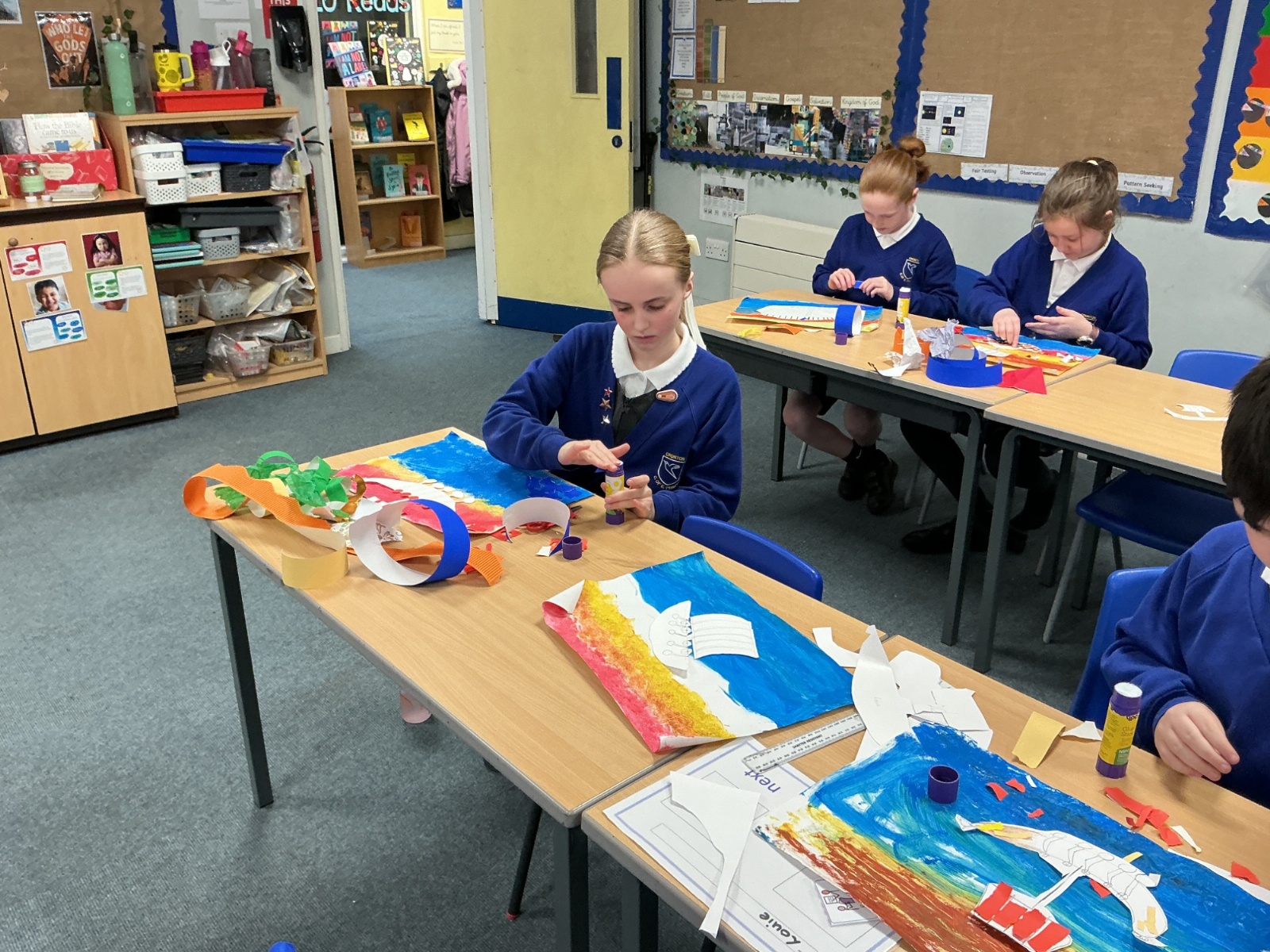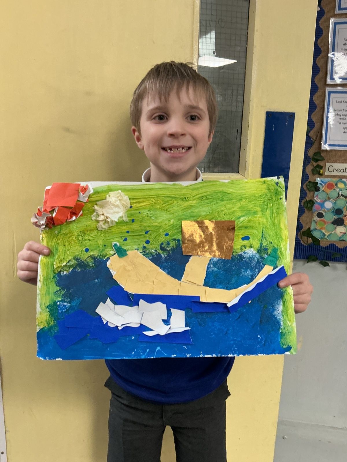 In history, The children have continued to look at the Vikings and in art use this inspiration of the Viking longboat to complete a collage.
