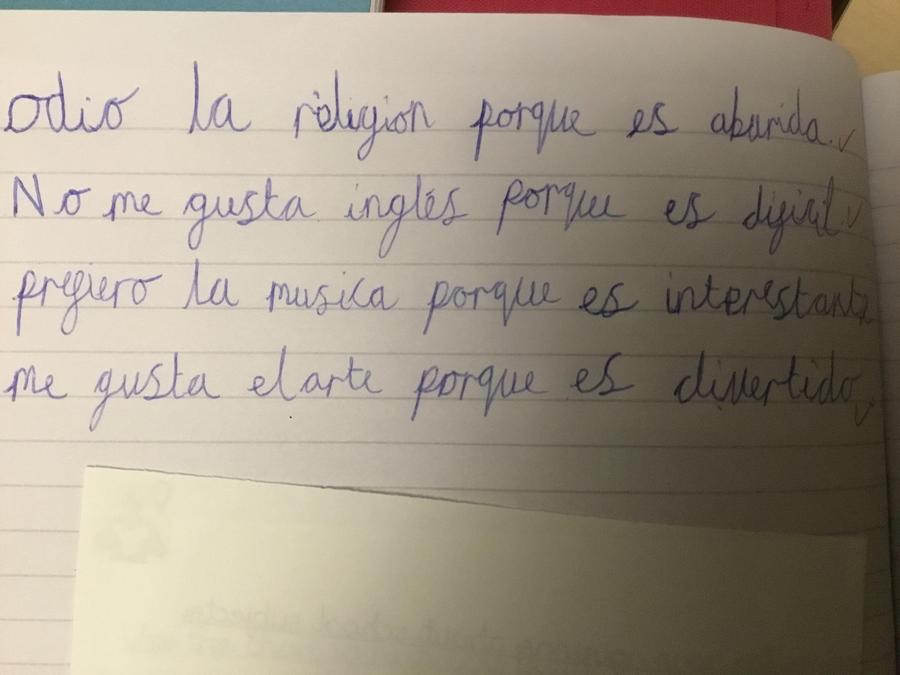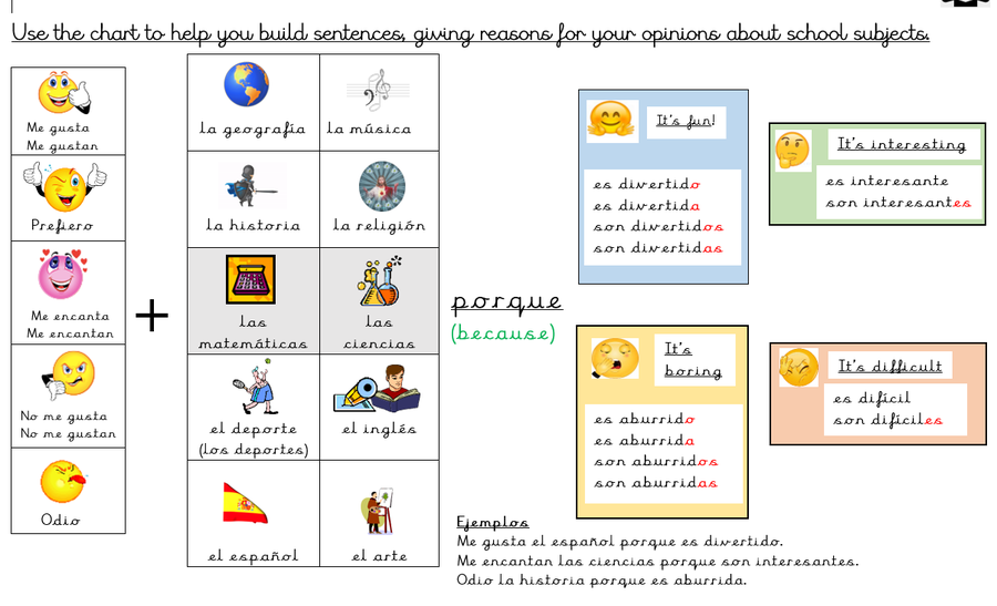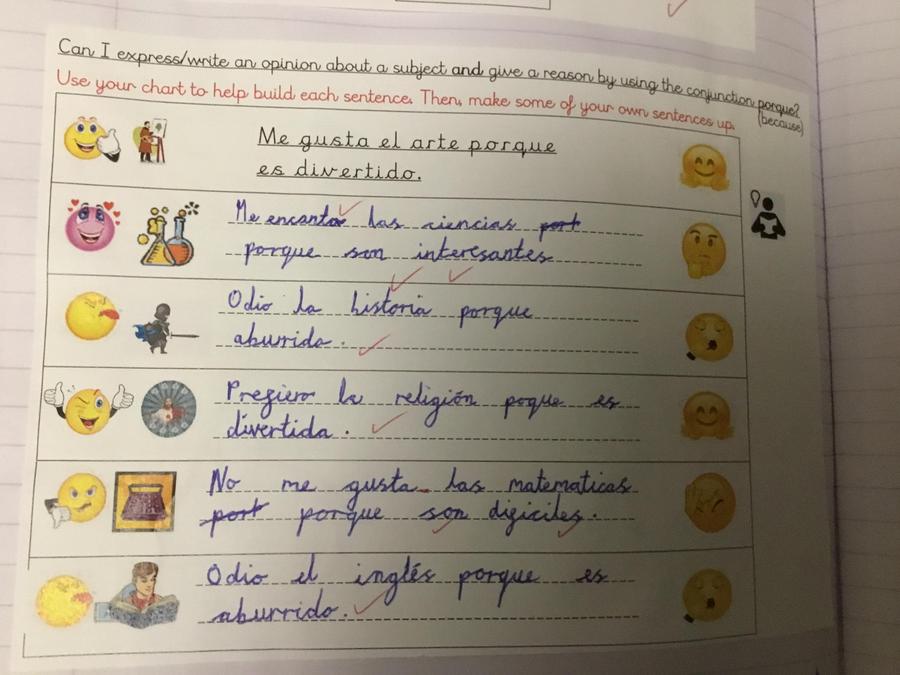 Today, we wrote sentences giving reasons for our school subject preferences. We used the chart to help us and joined our sentences with the word because. (porque)