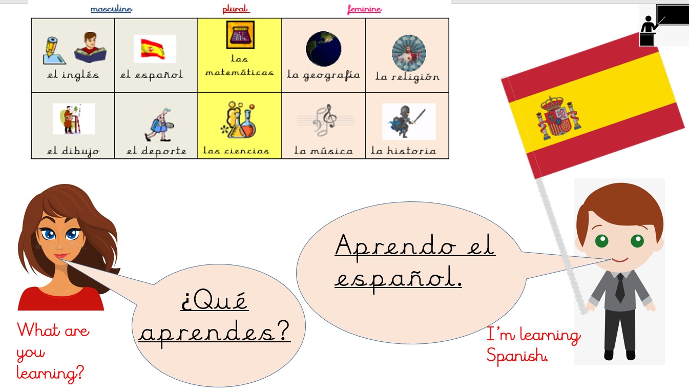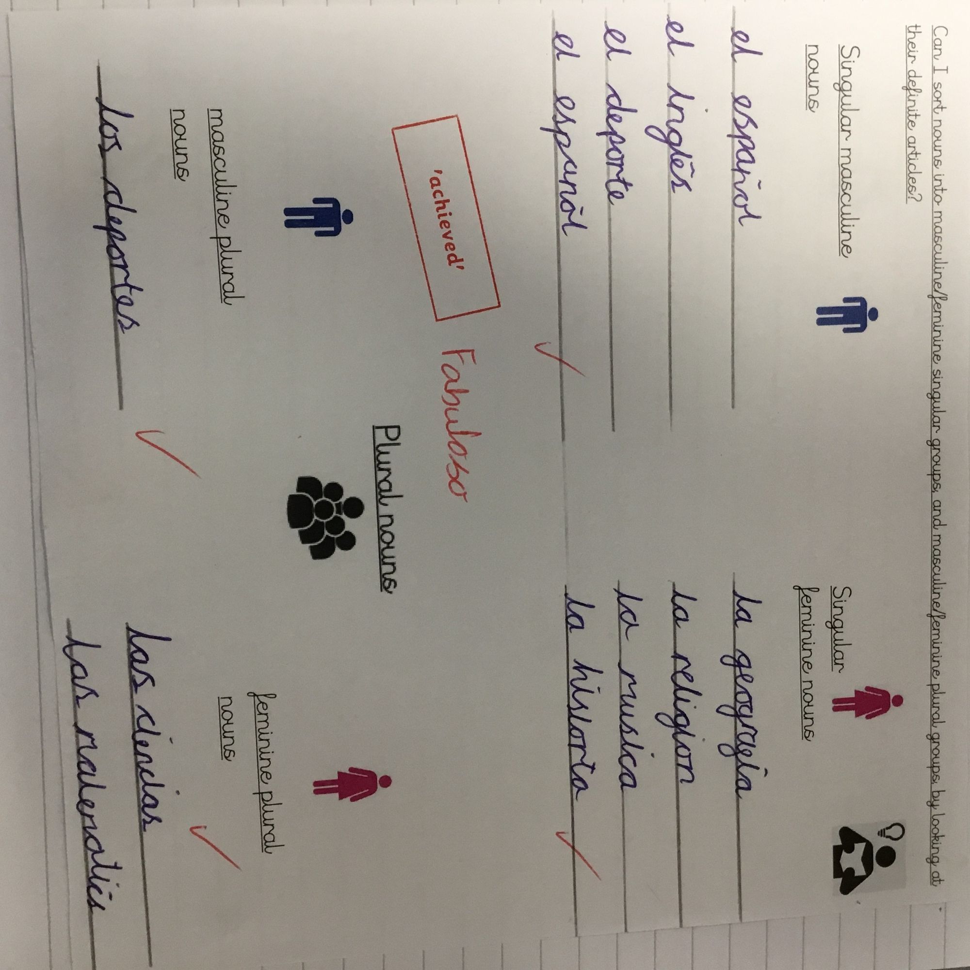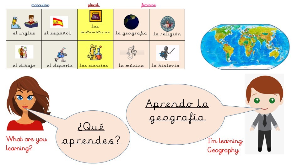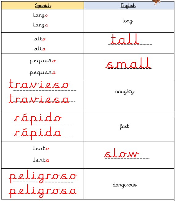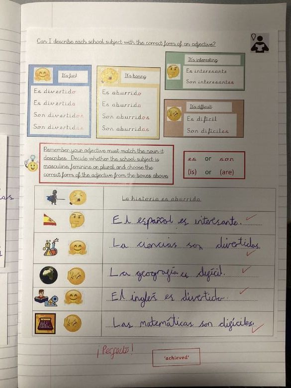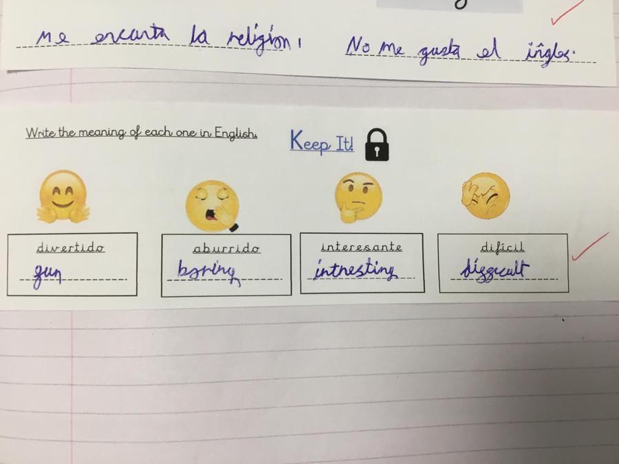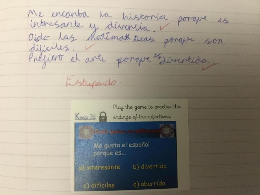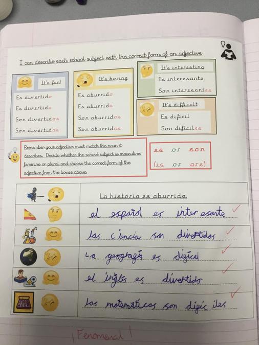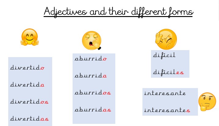 We also learnt some adjectives to describe the school subjects. In Spanish, the ends of the adjectives change to match the noun, depending on whether it is masculine, feminine or plural.