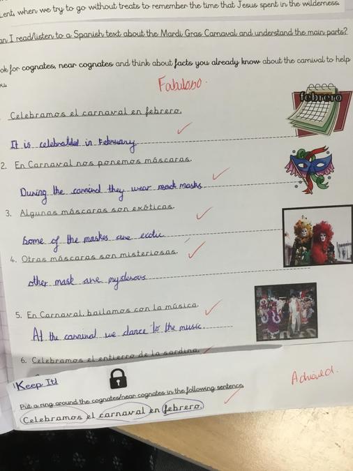This week, we looked at a Spanish text all about Mardi Gras. We looked for cognates (words similar to English ones) and used what we already know about the carnival to help us to understand the gist of the text.