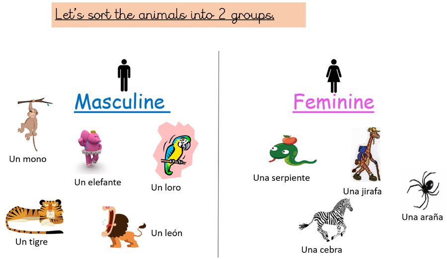 This week, we have been learning the names of some common jungle animals. We separated them into 2 groups - masculine and feminine nouns.