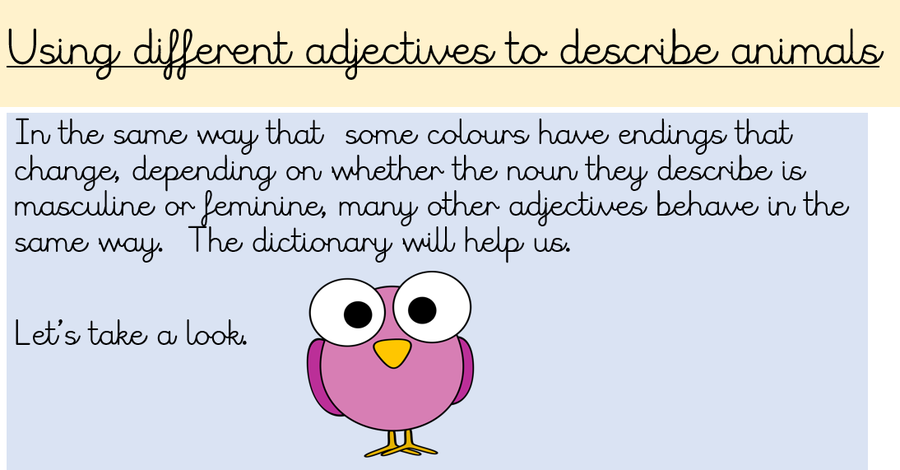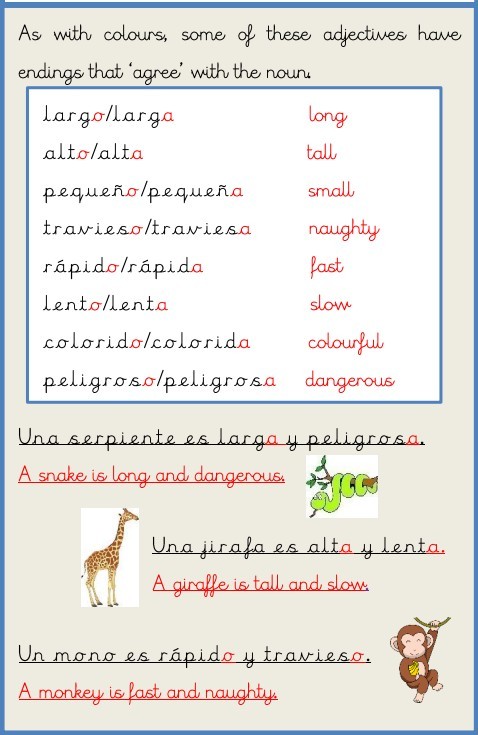 This week, we used adjectives and colours to describe the jungle animals. Some of the adjectives have different endings when describing feminine or masculine animals.