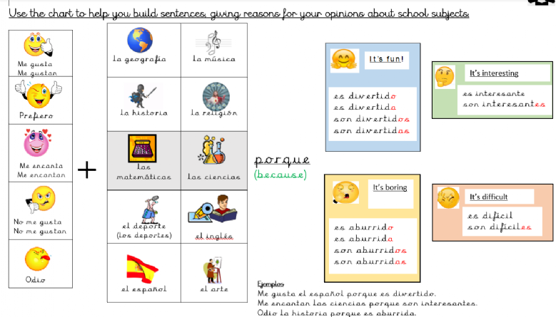 Today, we have been building longer sentences about school subjects, giving reasons for our opinions of them.  We used a sentence builder to help us put together all the vocabulary and phrases we have learnt so far.