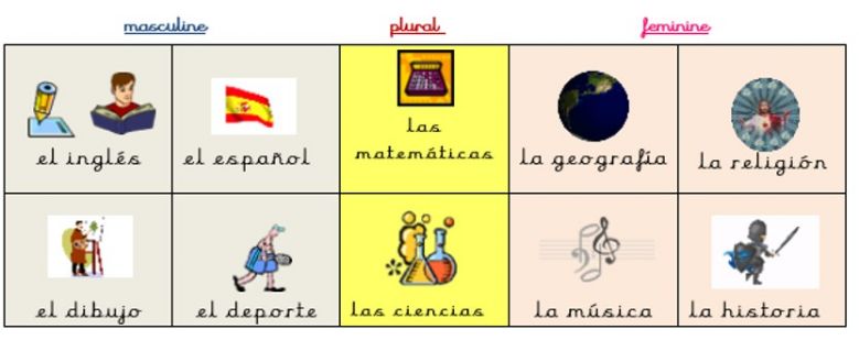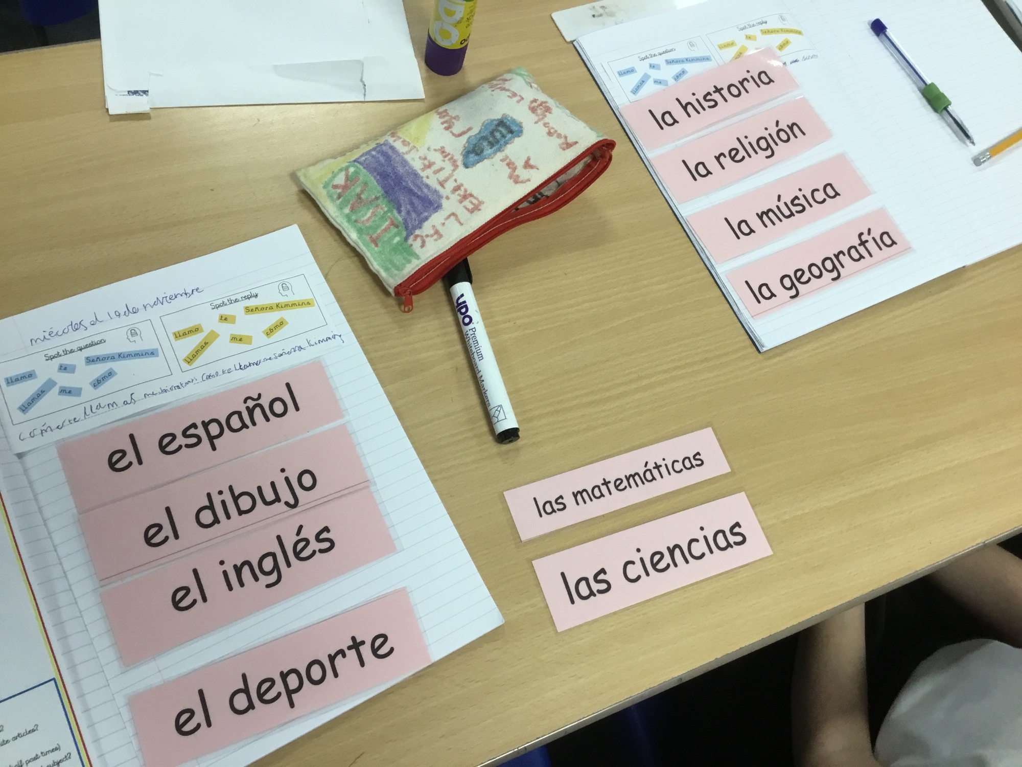 This week, we started to learn the names of school subjects in Spanish. A lot of them are cognates because they are very similar to English words. We sorted the subjects into masculine, feminine and plural groups.