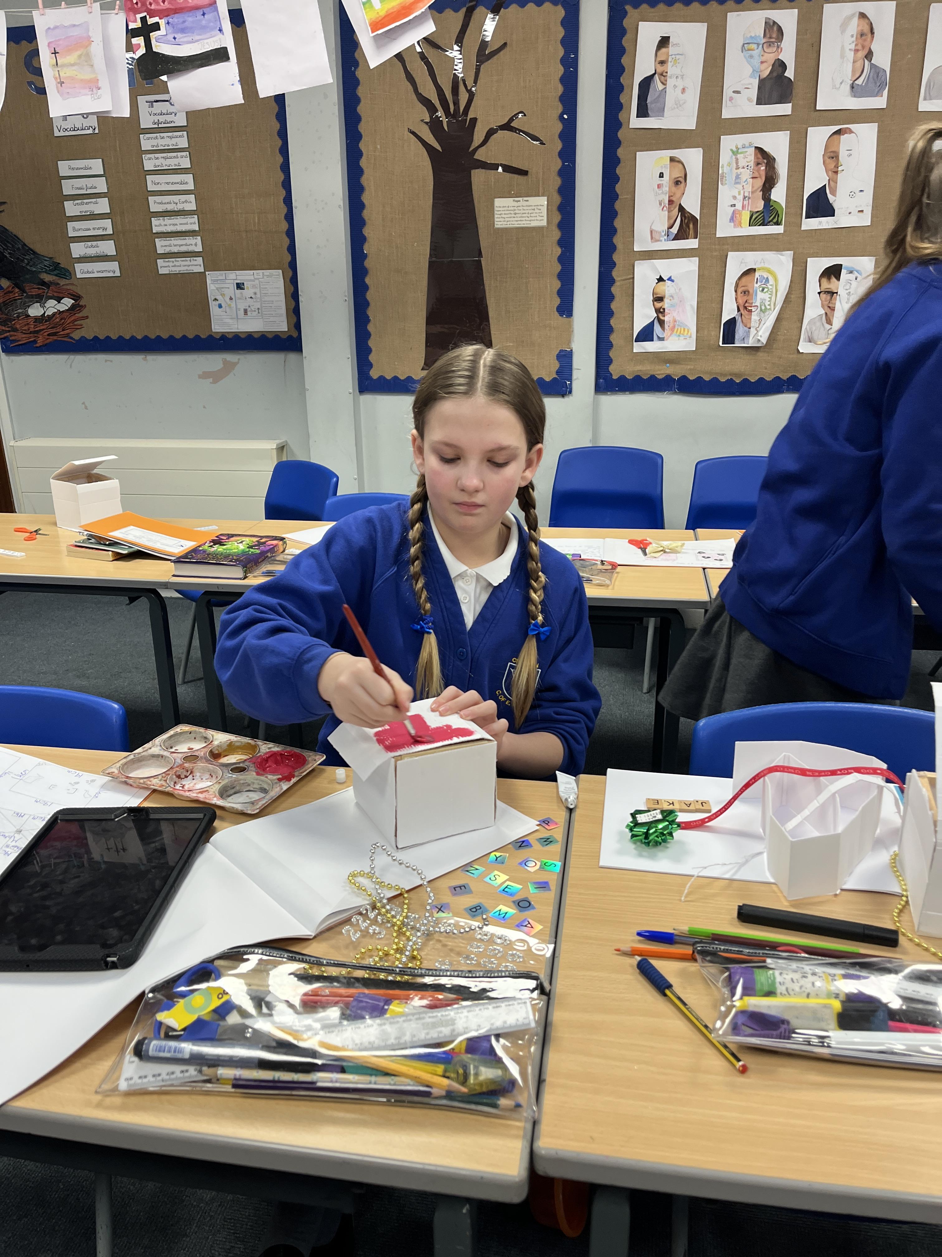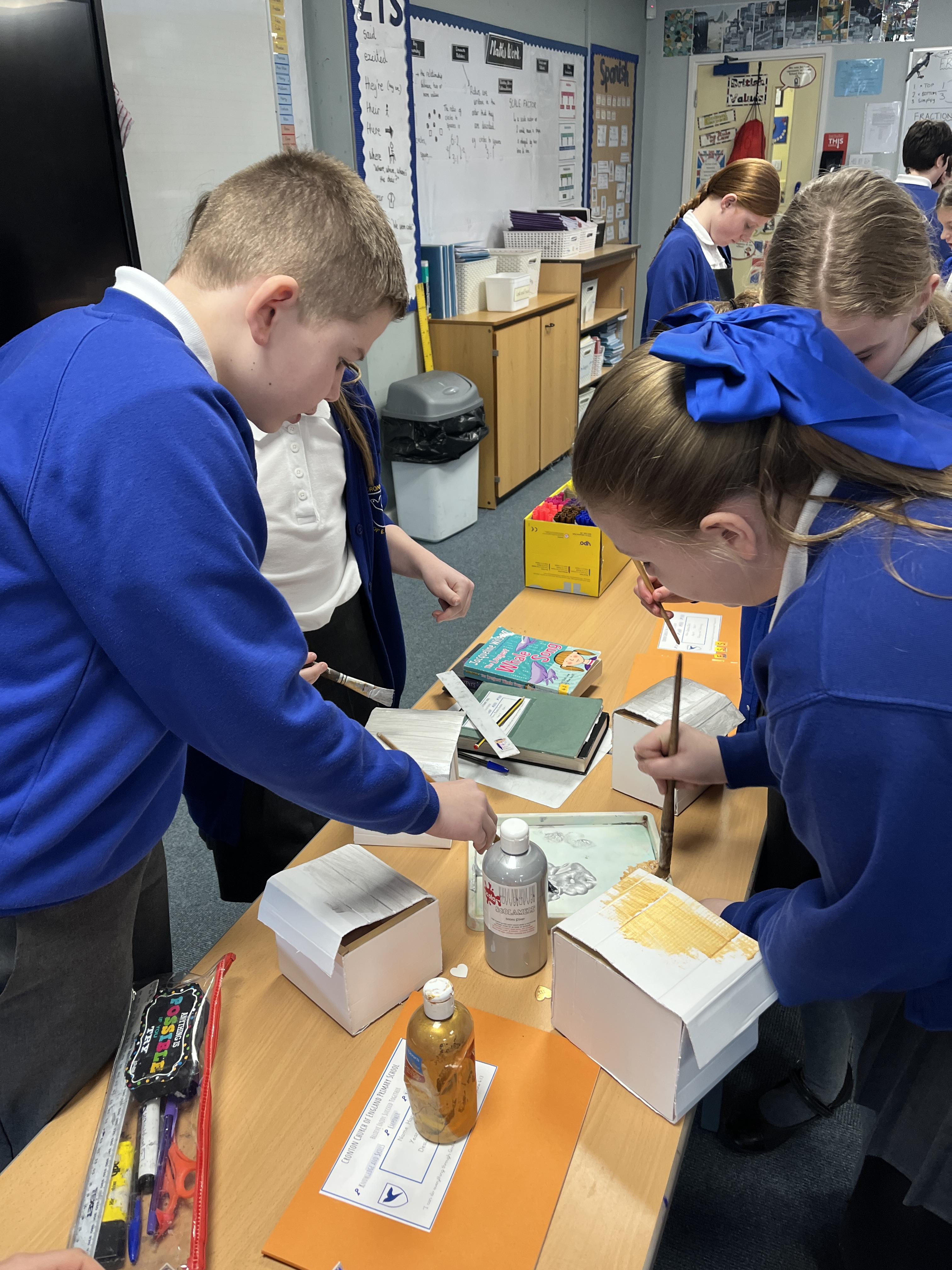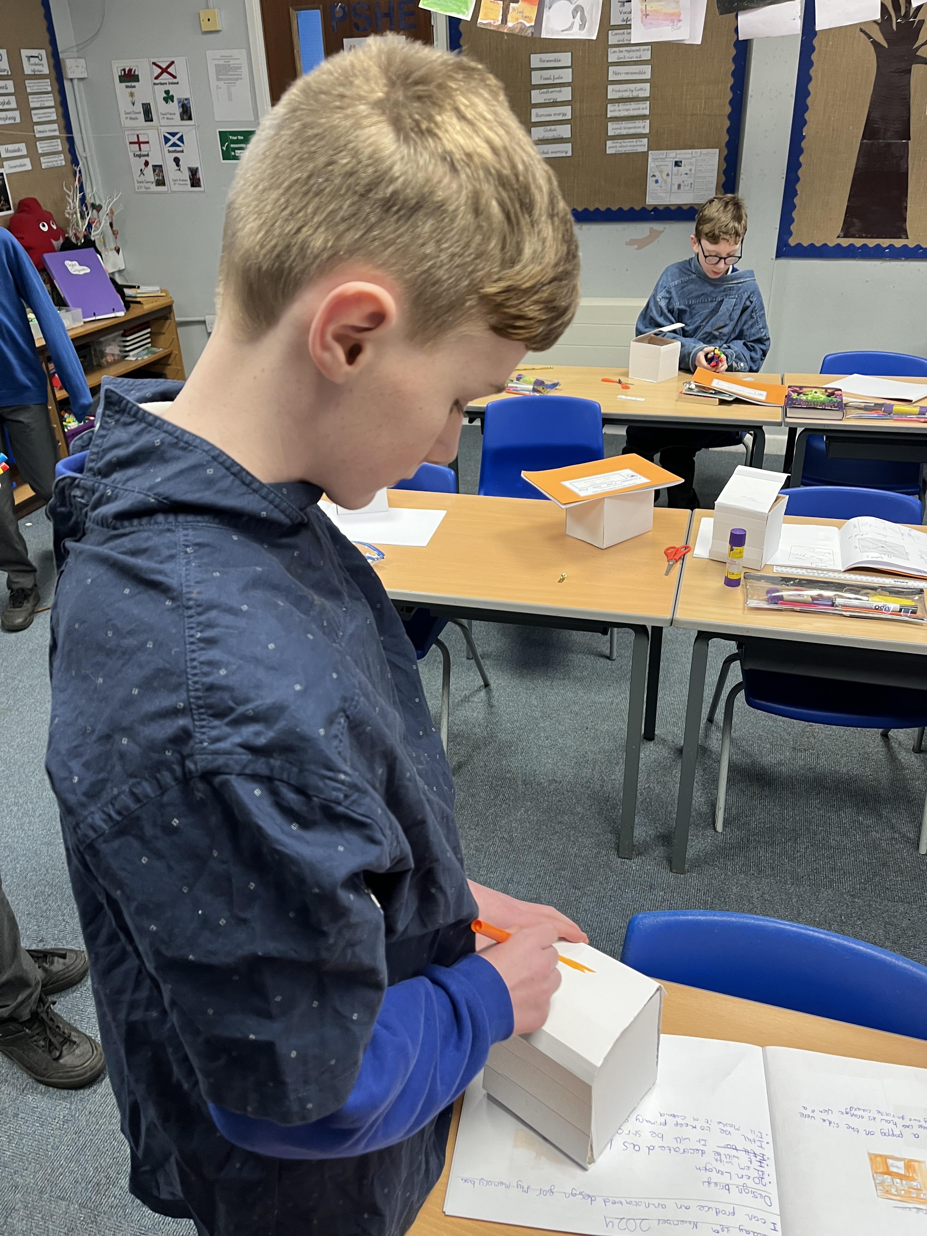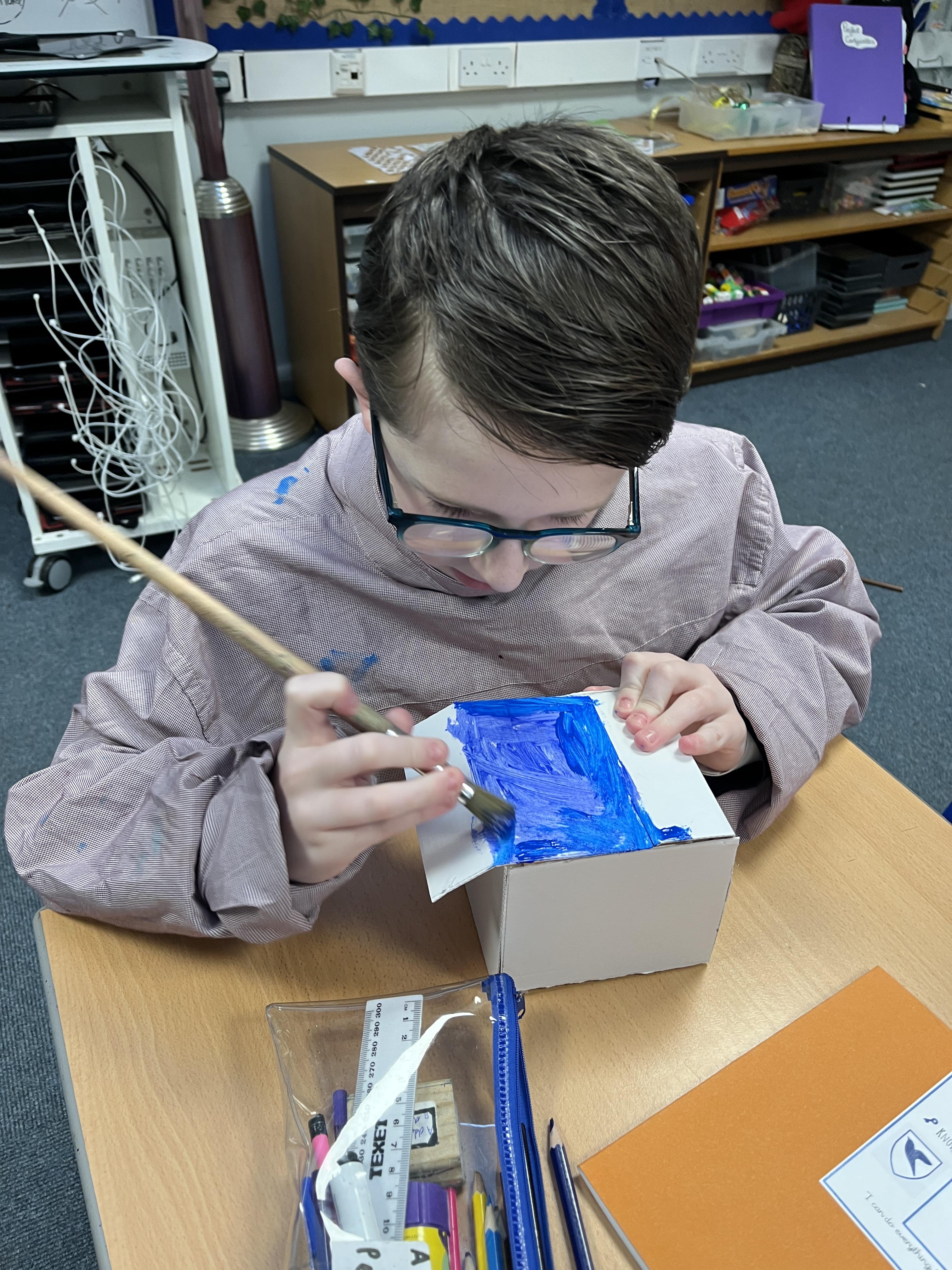 A huge thank you to Mrs Gillies (miracle worker) who helped us to move forwards with our memory boxes in DT. We are now all at the decorating stage... the product is almost finished! The children have worked really hard on these.