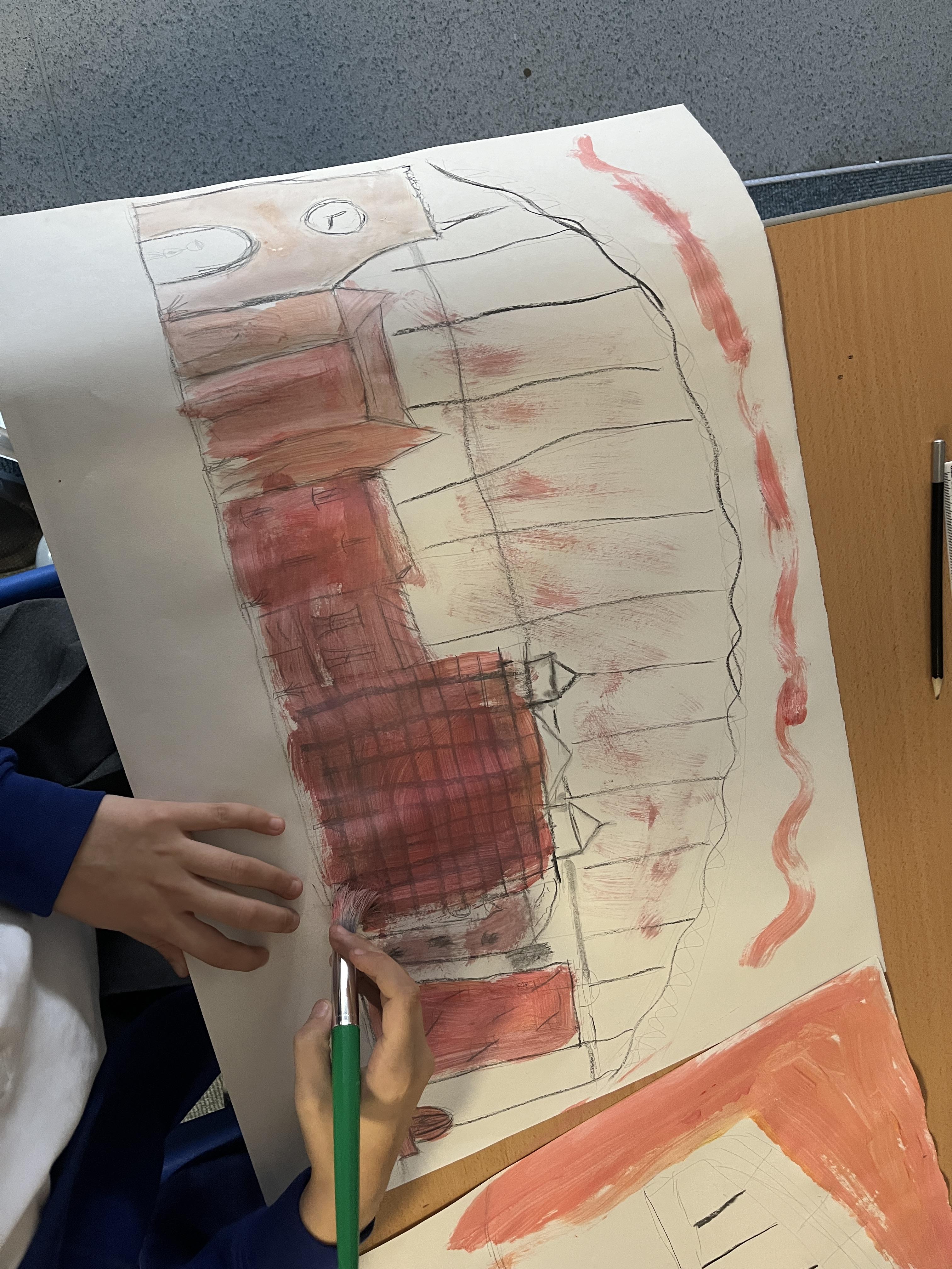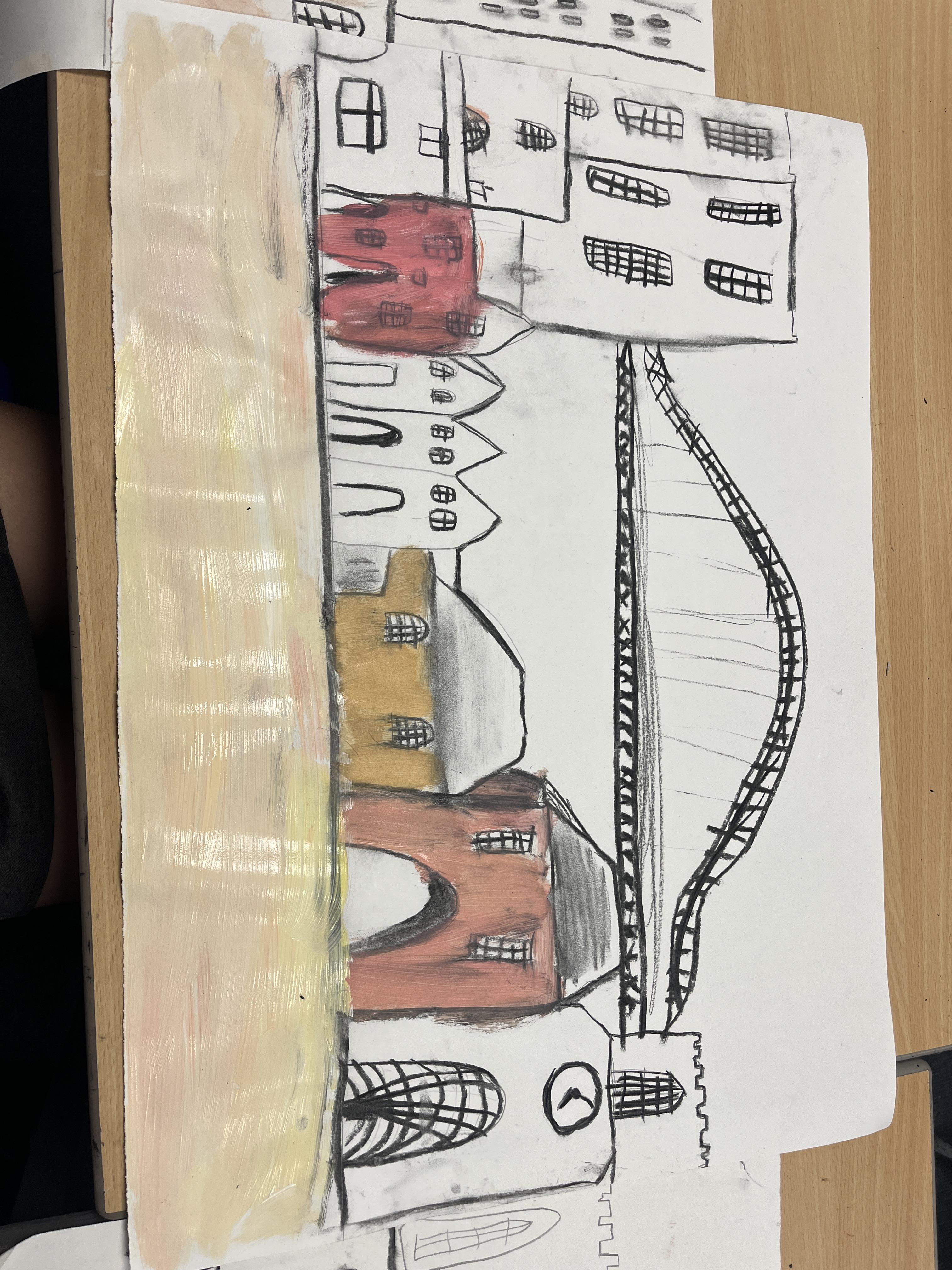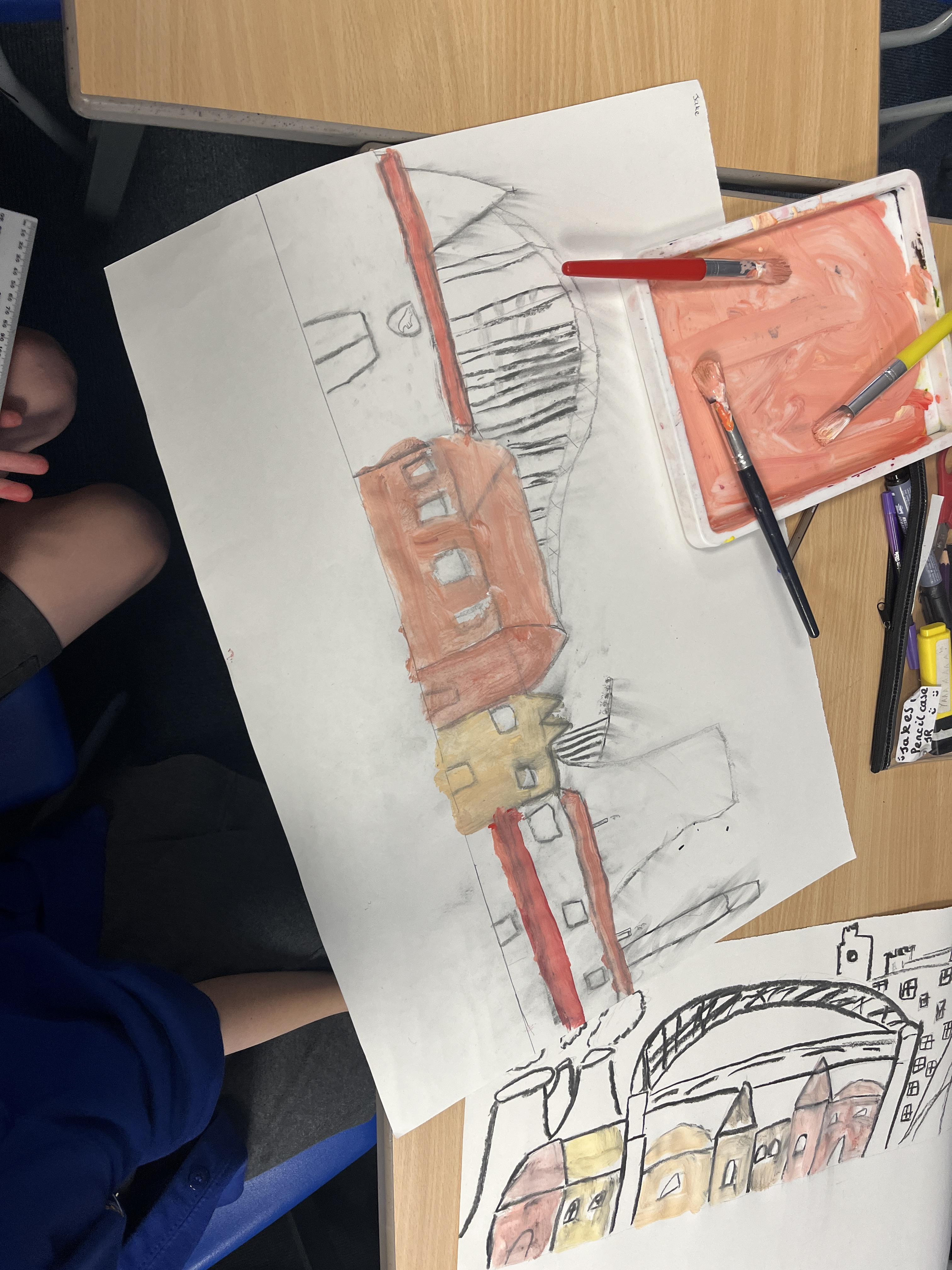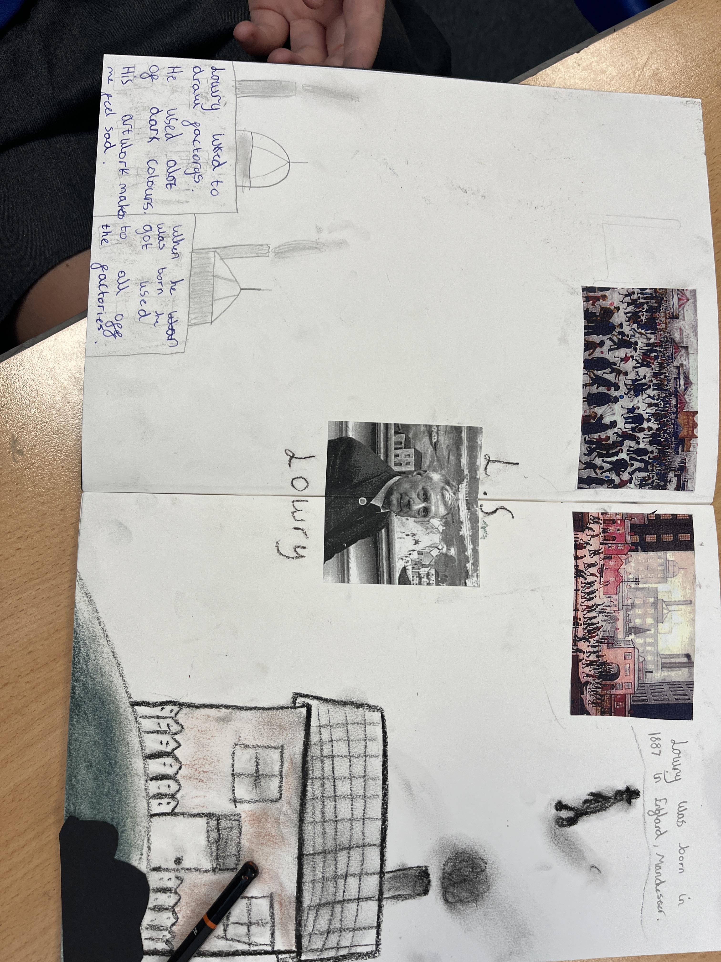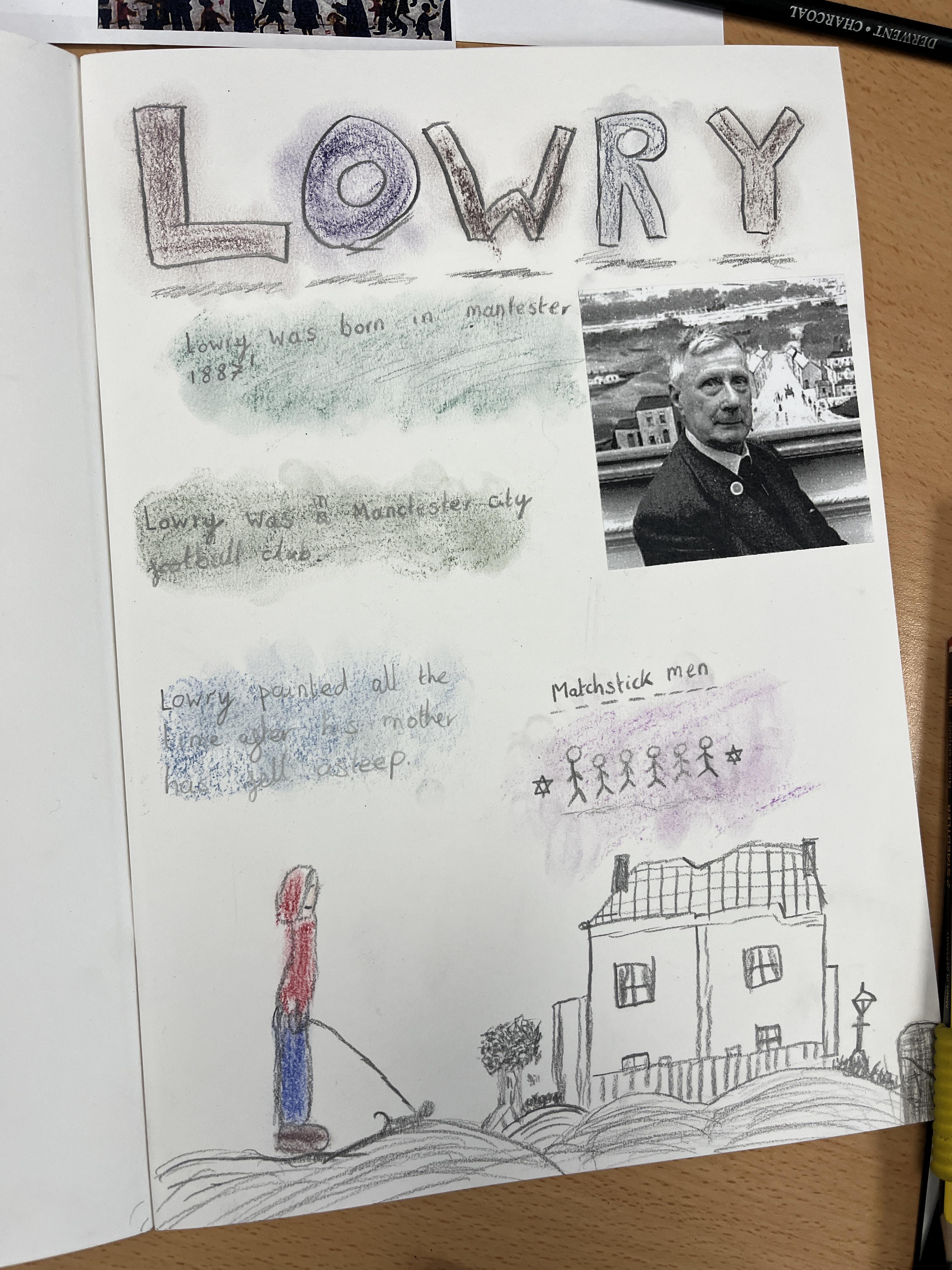 In Art, we looked at pencil sketching techniques and analysed some Lowry artwork to see which one’s he liked to use. We then tried to produce a pencil sketch of our yard in Lowry style, using some of these techniques.