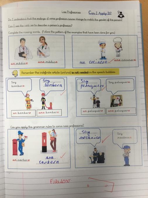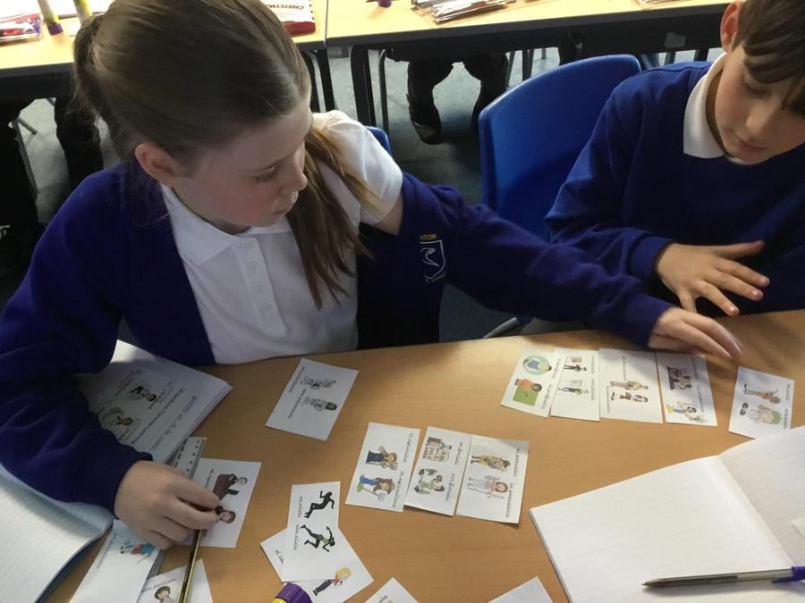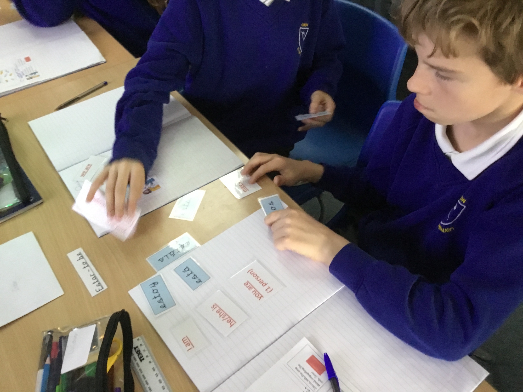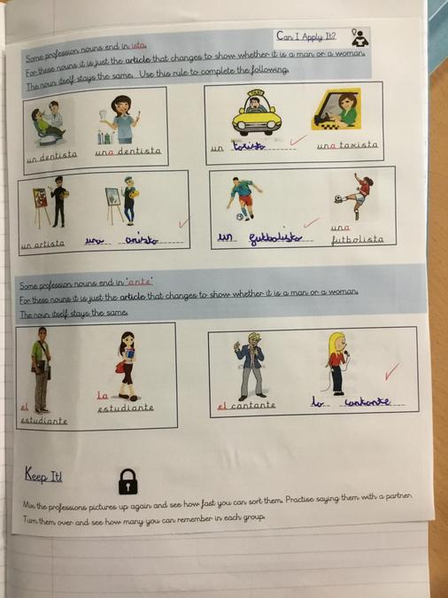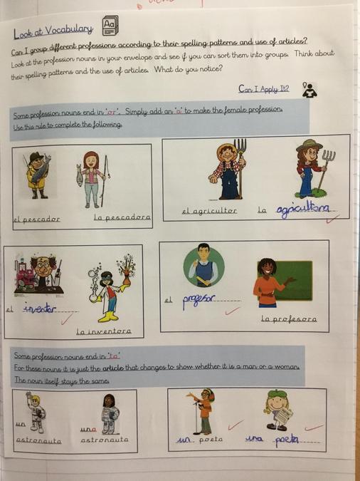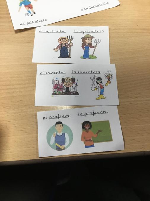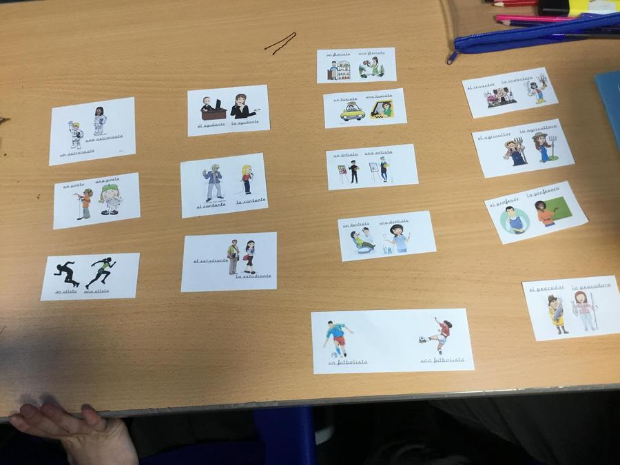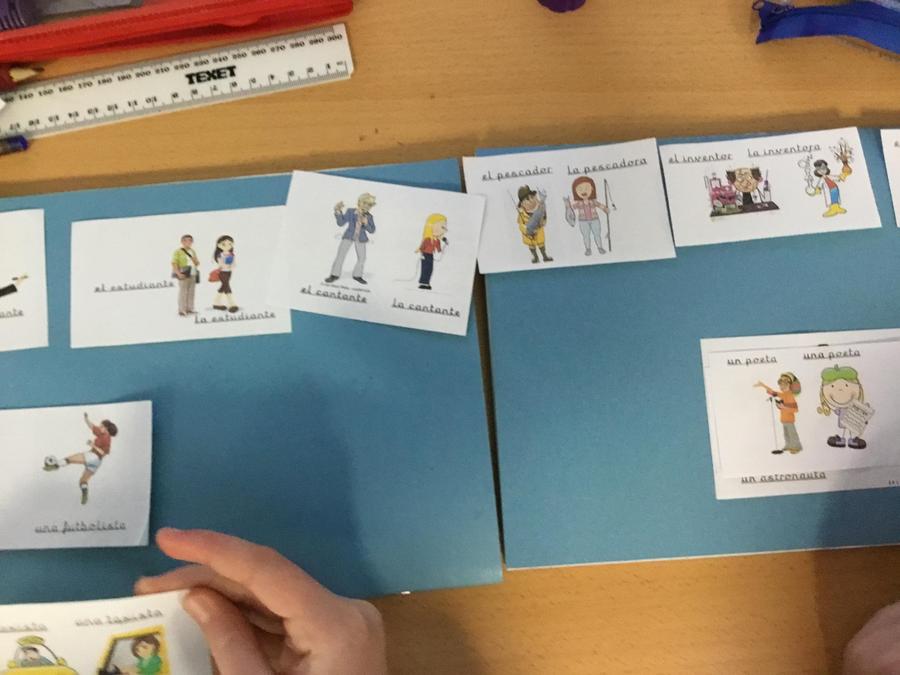 Today, we have been pattern seeking.  We sorted lots of different professions into groups, according to their spelling.  Each group has its own rule for masculine and feminine nouns.
