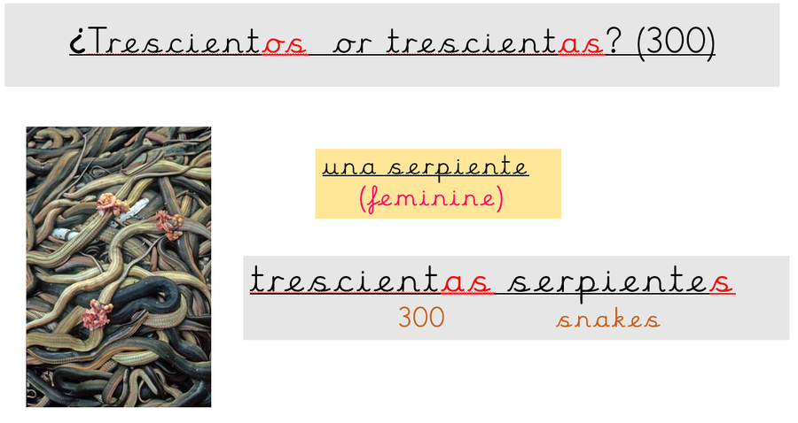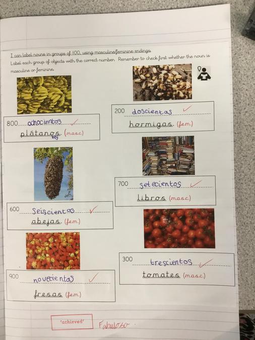 This week, we practised using the multiples of 100 to count groups of objects.  We noticed that sometimes the ends of the numbers changed to match the gender of the nouns we were counting.