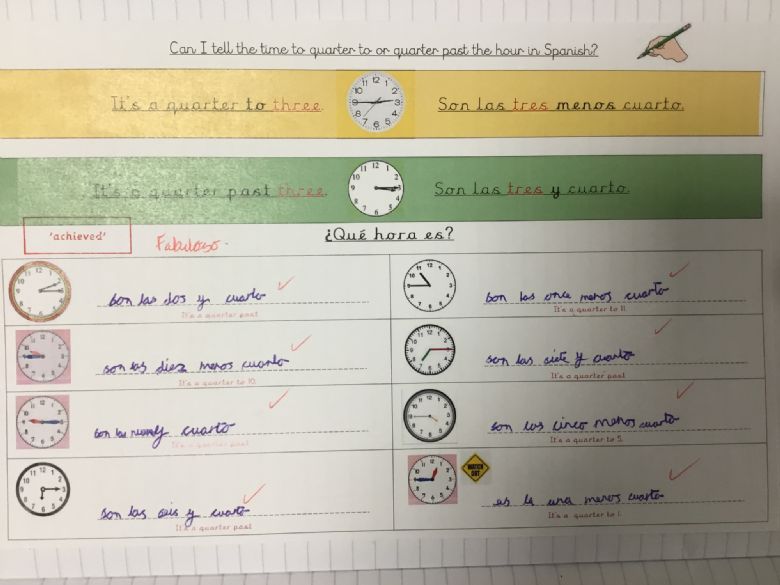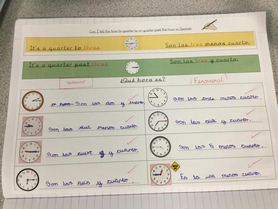 Today in Spanish, we have been learning how to tell the time.  We concentrated on quarter to  the hour and quarter past  the hour times.