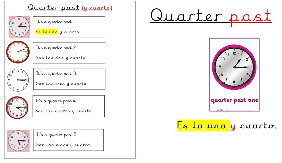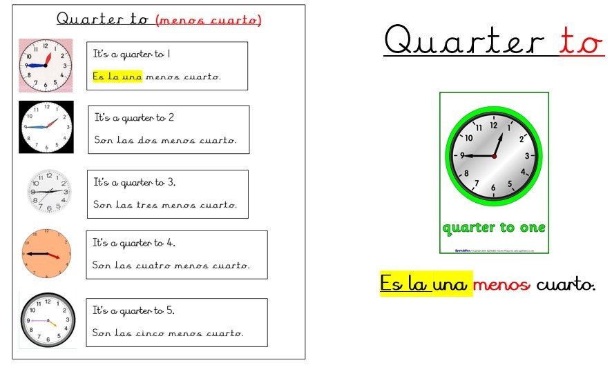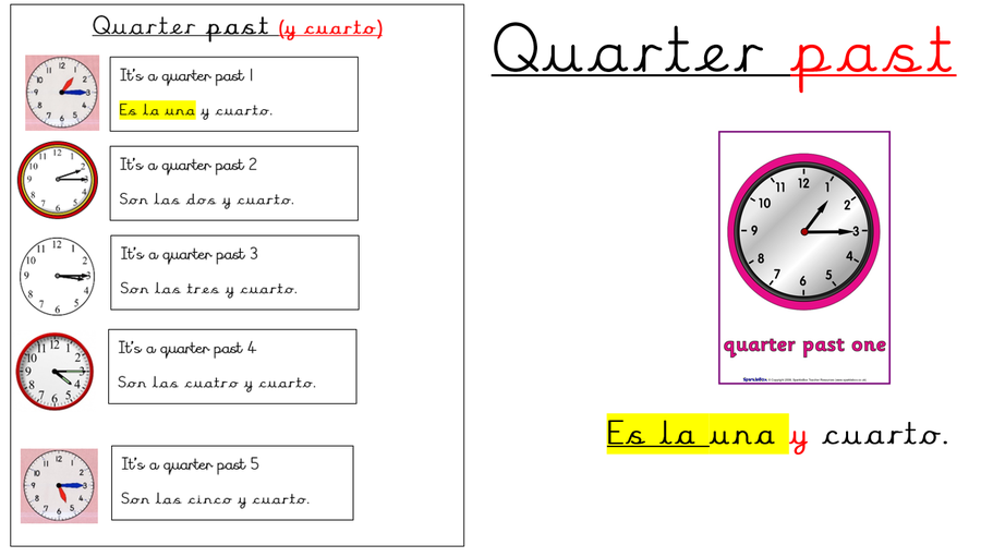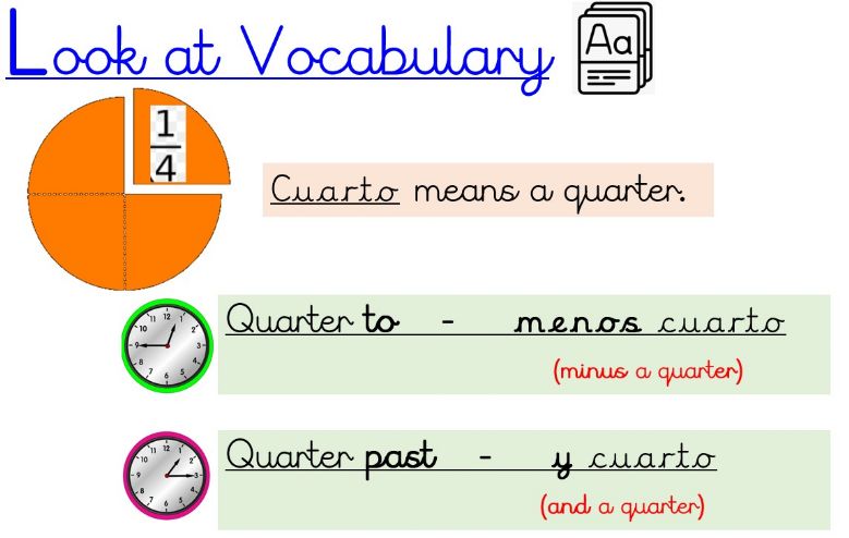 This week, we have been learning how to tell the times  to a quarter to and quarter past the hour in Spanish.