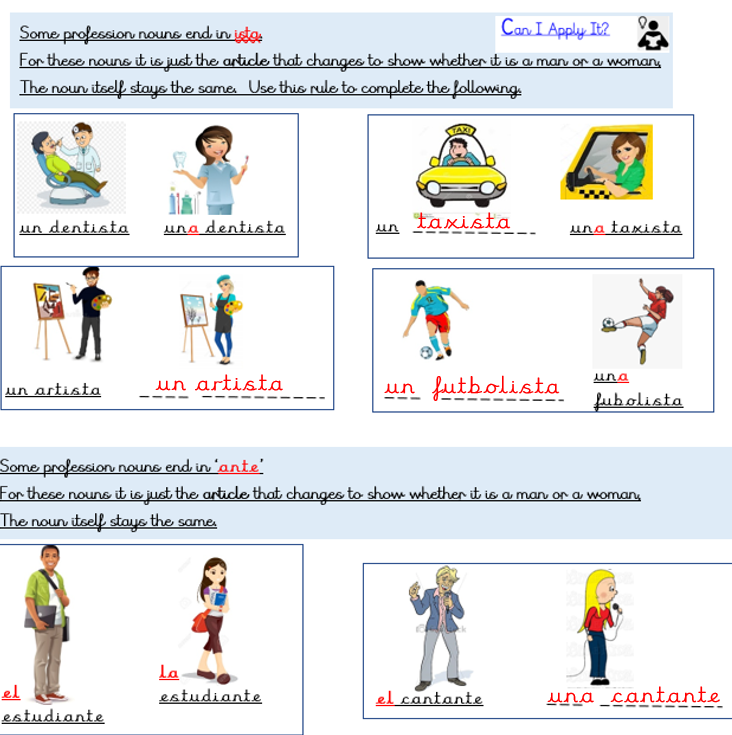 Today, we have been pattern seeking. We sorted lots of different professions into groups, according to their spelling. Each group has its own rule for masculine and feminine nouns.